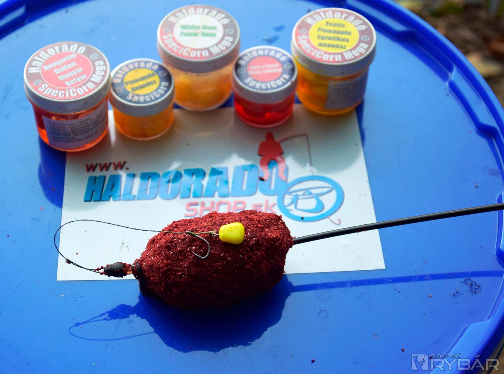 Ako nástrahy som si zvolil menšie fluo vznášajúce sa pelety, ochutené silikónové kukurice Haldorádó Speci Corn Mega a mini pop up boilies.