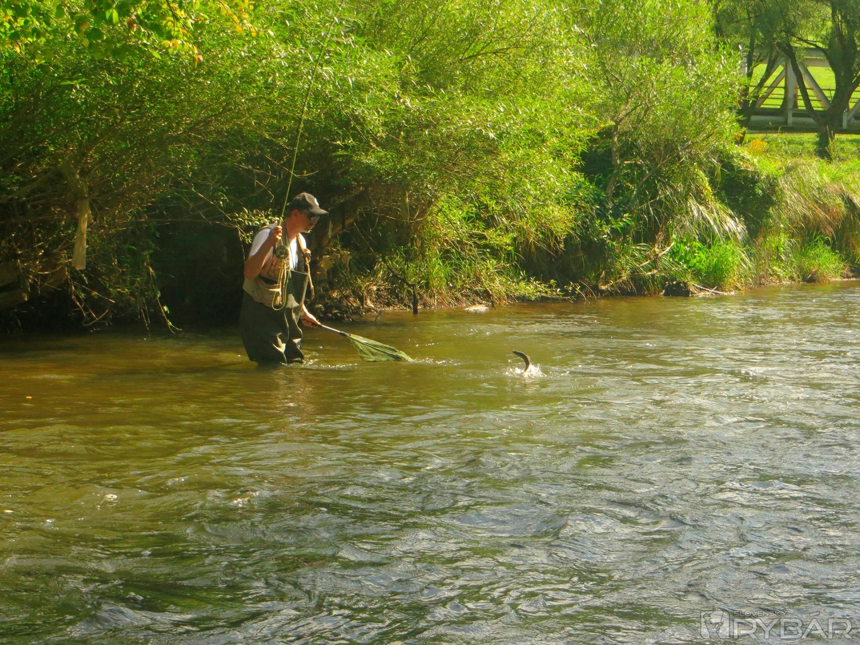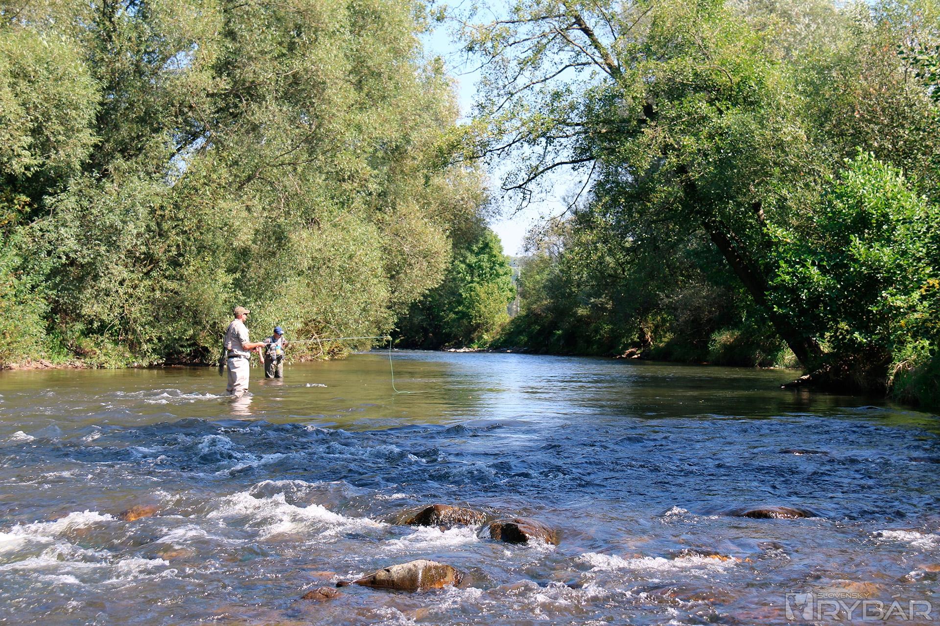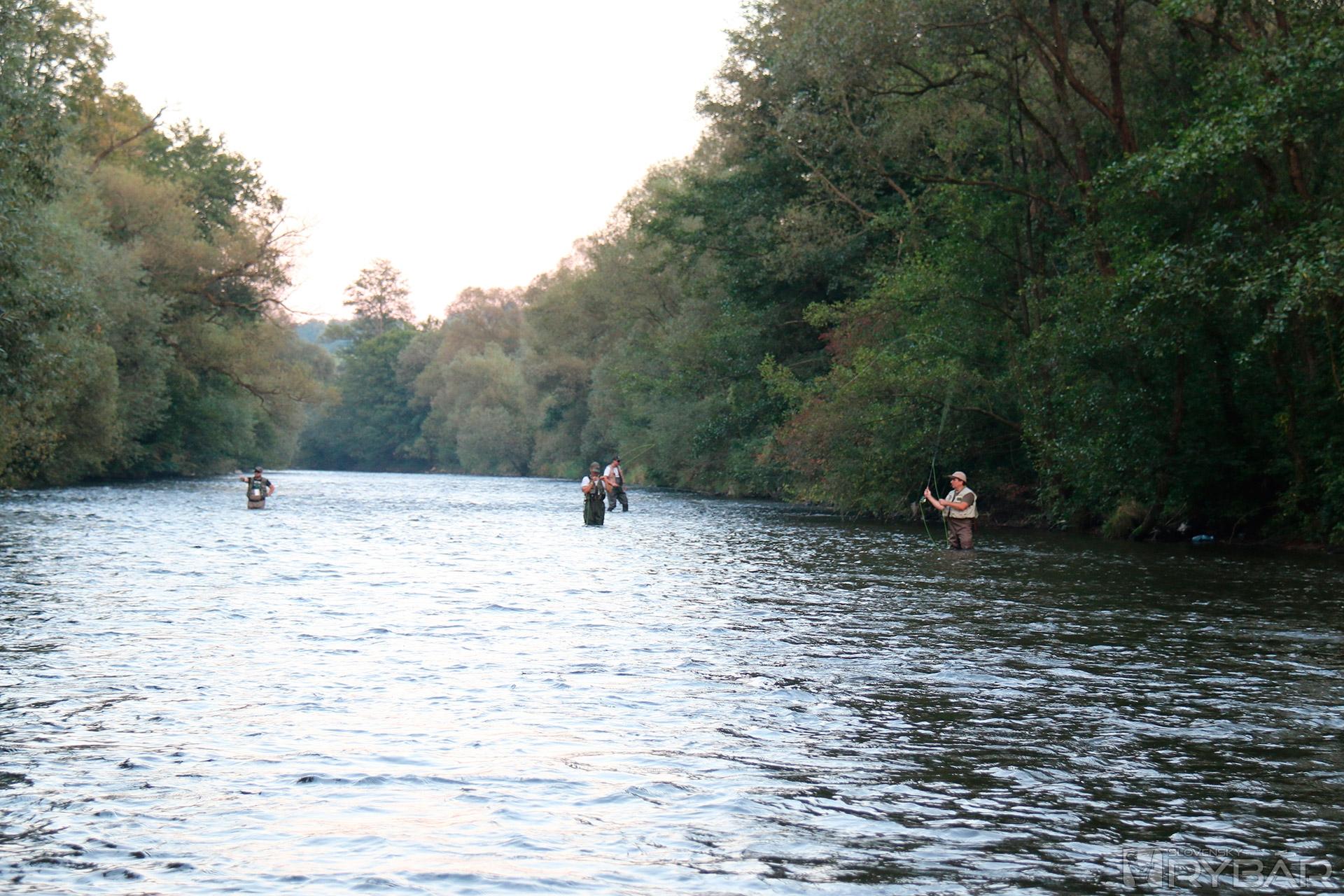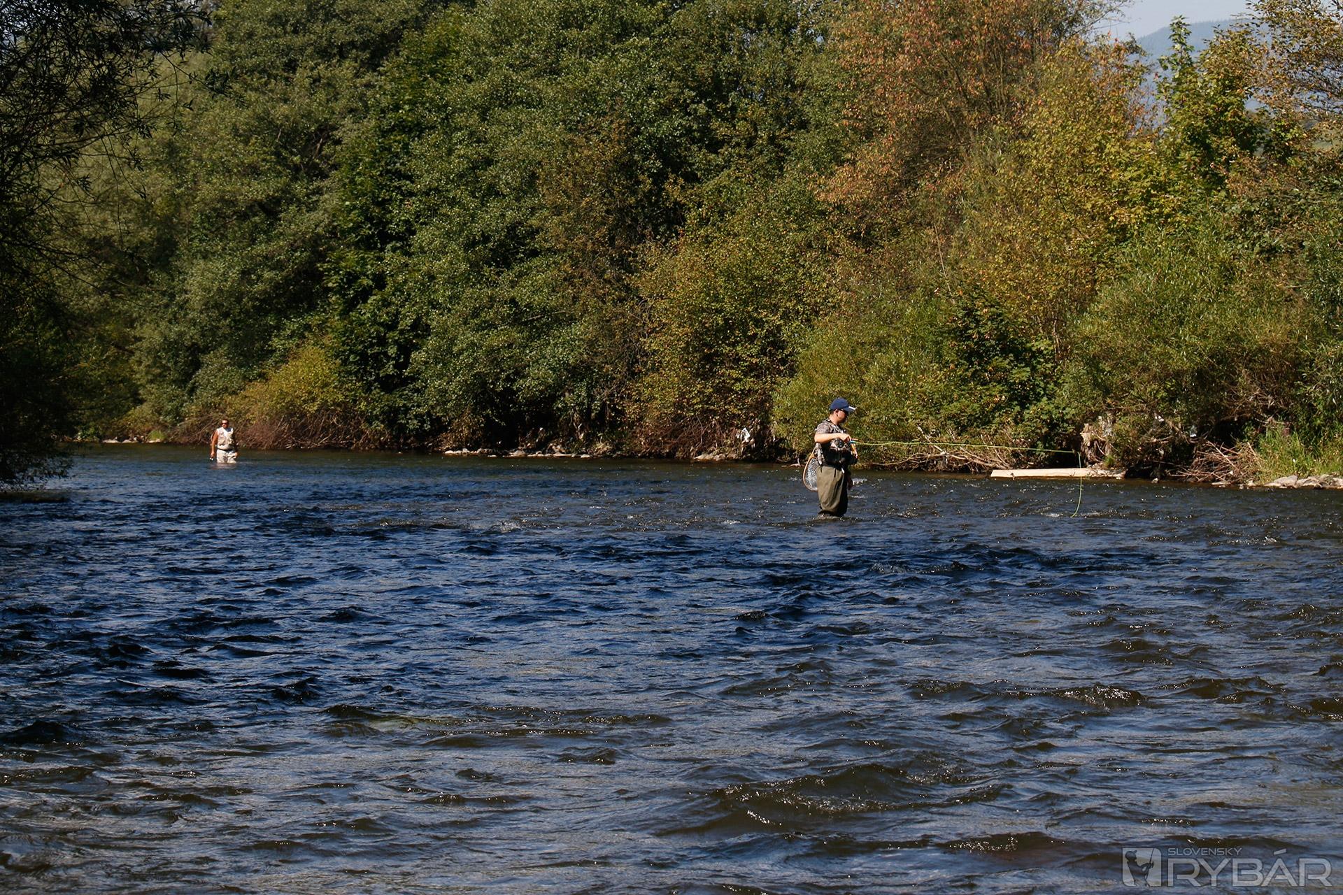 Miesta to boli nádherné, voda mierne zodvihnutá, ale rybám by to nemalo vadiť. Bohužiaľ, dvojica vytrvalcov sa na vode veľmi trápila. Jediným úlovkom bol tak maličký lipník v podaní Matáska. Ostatní kamaráti sa pomaly začali zbierať, a tak vybrodili z vody a šli sa privítať. Všetci nedočkavci chceli, samozrejme, chytať tiež, veď sme mali ešte polovicu dňa pred sebou. Nikde sme sa nepresúvali, a tak sme zabrodili priamo pod motorestom. Jedna skupina sa vybrala vyššie proti prúdu, druhá operovala tesne nad vstupom do vody. Každý niečo ulovil, lipne pekne brali najmä na mokro. Najúspešnejším lovcom bol začiatočník Peťo, ktorý bol na svojej druhej muškárskej výprave a pochytal najväčšie ryby. Pred zotmením sme vybrodili, išli sa prezliecť, najesť a pokračovali pri pivku v debatách, najmä o rybách.