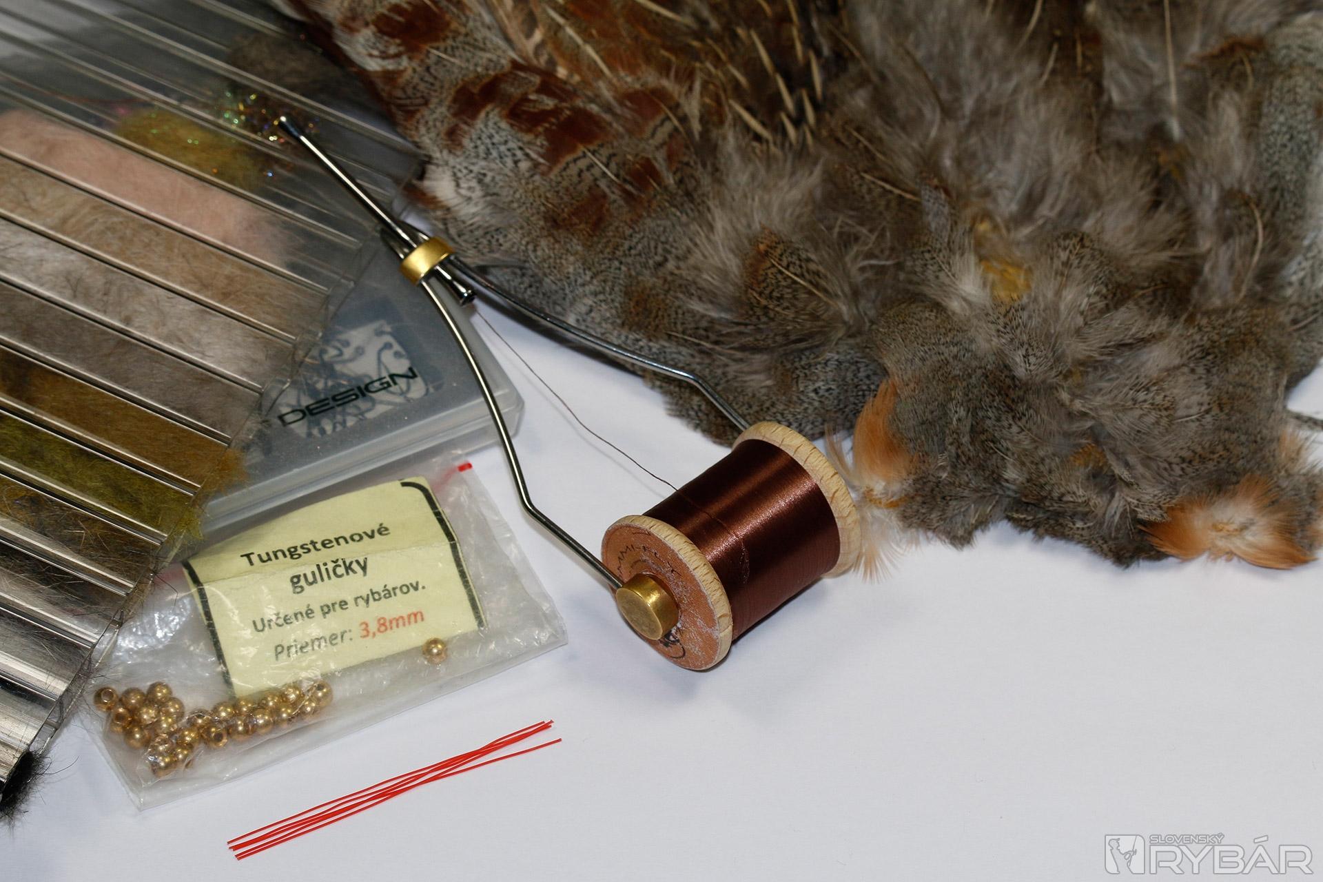 nymfový háčik, tmavá viazacia niť, volfrámová guľôčka, plastové tyčinky alebo vlasec, zelený dabing, pierko z jarabice.