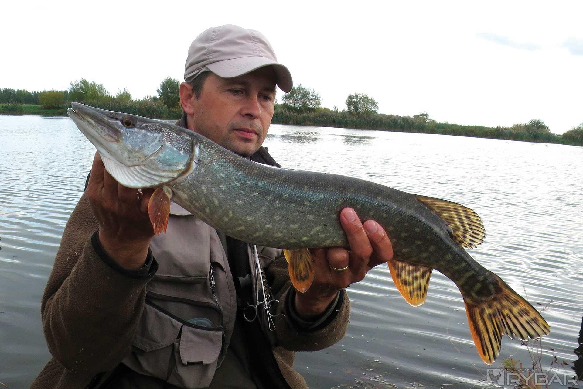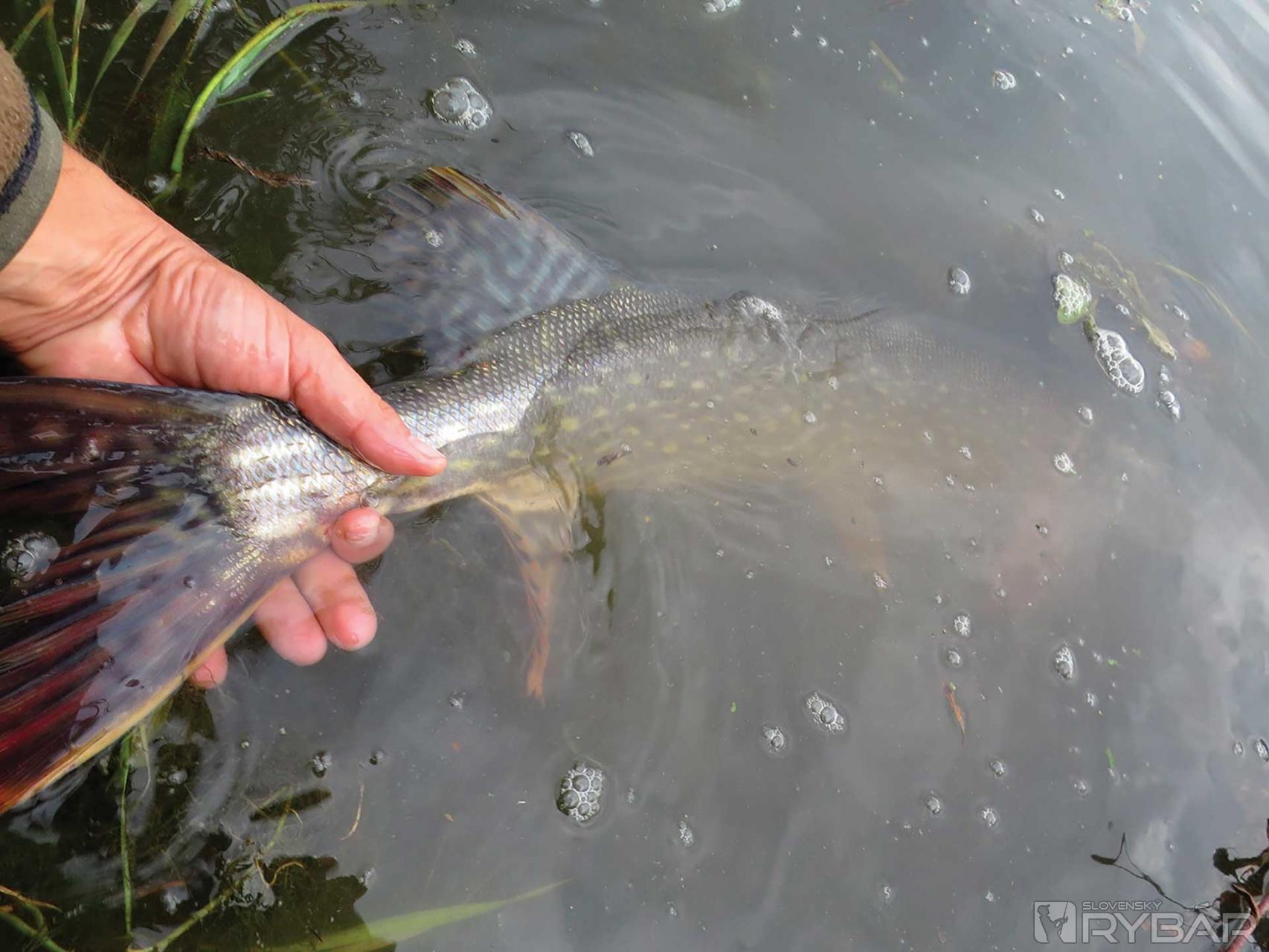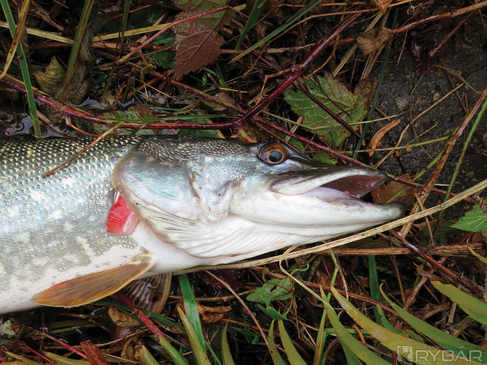 A skutočne, stačilo len pár nahodení a prvá šťuka neodolala. Na jemné náčinie to bol zápas na hranici možností, ale nakoniec to šťuka vzdala. Krásne stavaná, viac ako osemdesiat centimetrová krásavica po odfotení putuje späť do rodného živlu. Prejdem len pár metrov a mám ďalší záber. Šťuka je tentoraz podstatne menšia, ale niečo ma na nej predsa zaujalo. Už pri zdolávaní som si všimol, že jej niečo červené trčí spod žiabrového viečka. Na brehu som zistil, že má celkom pretrhnutý jeden žiabrový oblúk. Napriek tomu prežila, poranenie sa jej krásne vyhojilo a ďalej lovila. V letnom období by pravdepodobne takéto zranenie znamenalo istú smrť vykrvácaním. Vidím, že nie som sám, kto na tomto mieste loví šťuky. Šťuka rýchlo mizne v hĺbke a ja pokračujem v love. Sledujem nástrahu až do tesnej blízkosti brehu, kľučkujem pomedzi potopené trávy. Vtom náhle spod brehu prudko vyráža ďalší ozubený dravec. Po záseku voda doslova vrie. Šťuka akoby v trávach stratila orientáciu a na mieste doslova „divočí“. Trávy sa jej čoraz viac namotávajú na hlavu, zdá sa, že je už celkom stratená. Nemôžem ju už viac pritiahnuť ku brehu, a tak v čižmách leziem za ňou. Zabáram sa do mäkkého bahnistého nánosu, tiež sa nemôžem pohnúť. Naťahujem ruku a doslova v poslednej chvíli vylovujem ďalšiu nádherne stavanú rybu, dokonalé dielo prírody. Kristián mi podáva ruku, blahoželá k peknému úlovku, ale v jeho očiach vidím aj sklamanie. Veď doteraz nemal ani záber…