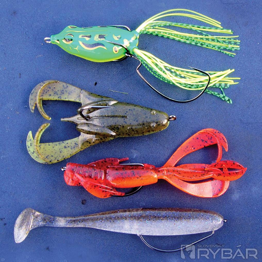 Toto sú naše Topky, zhora: žaba od Robinsona plávajúca, žaba potápavá Keitech, rak Crazy Flapper 4,4 a Easy Shiner 5 na ofsete.
