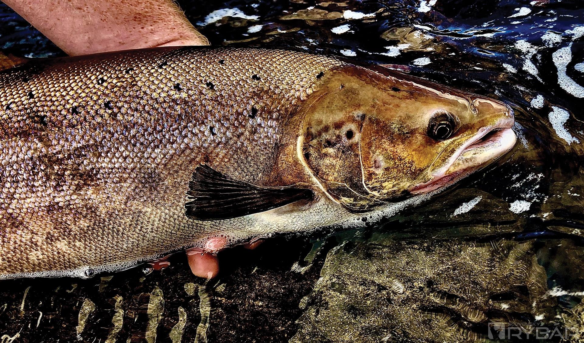 Čím dlhšie je losos v sladkej vode, tým viac mení svoju fyziológiu a sfarbenie. Krásny mliečňak cez 90 cm.
