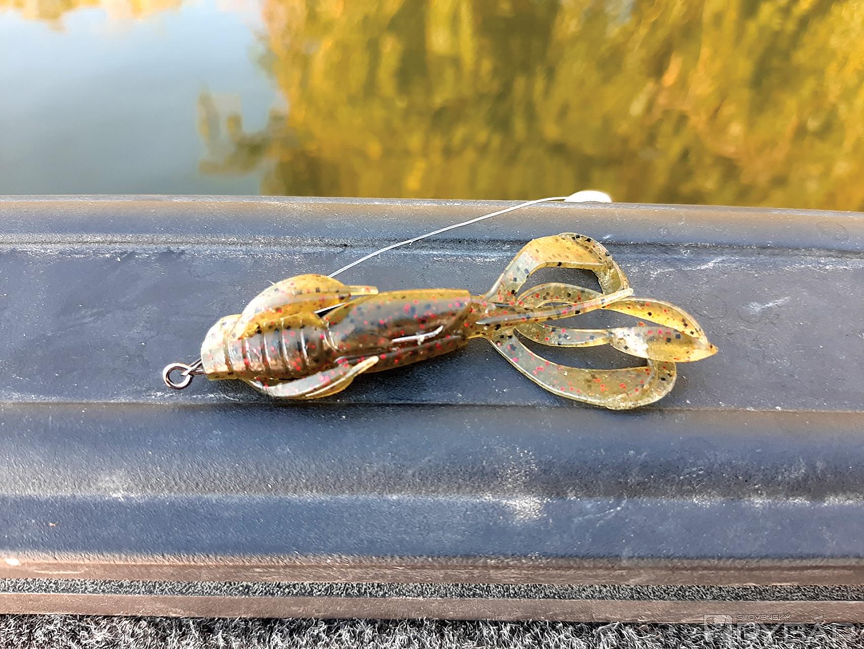 v stromoch pekného black bassa, beriem podberák a čakám, kým ho nad neho navedie. Ryba nechce predať svoju kožu lacno a bojuje, skáče nad vodu a trasie hlavou zo strany na stranu. To je presne tá fáza, keď sa dokáže zbaviť háčika... Už je blízko, ale vidím, ako štartuje k hladine a chce vyskočiť. Tohto nesmieme stratiť, pomyslím si, to nesmiem dopustiť! Ryba je už nad hladinou a chvostom tancuje po vode, neváham ani sekundu a ako motýľa ho chytám vo vzduchu. Je náš! Keby nám dávali body aj za umelecký dojem, tak už máme vyhraté. Je to jasné, nie je čo riešiť, aj ja dávam Crazy Flappera od Keitechu. Okrem toho, že nástrahy od Keitechu sú perfektne vyvážené a môžete ich použiť na offsetovom háčiku aj bez záťaže, sú aj aromatizované a vyrobené z mäkkého silikónu, takže pracujú aj pri najmenšom popotiahnutí, a to je teraz veľmi dôležité, lebo chytáme priamo v stromoch a nie je veľký priestor na prezentáciu.