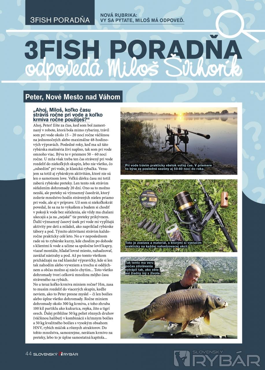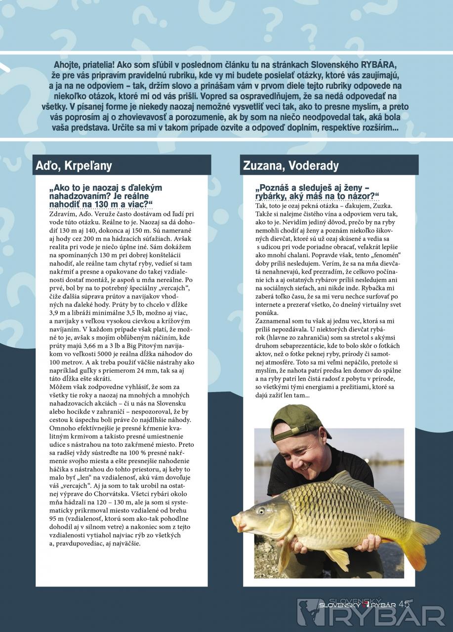 Ahojte, priatelia! Ako som sľúbil v poslednom článku tu na stránkach Slovenského RYBÁRA, že pre vás pripravím pravidelnú rubriku, kde vy mi budete posielať otázky, ktoré vás zaujímajú, a ja na ne odpoviem – tak, držím slovo a prinášam vám v prvom diele tejto rubriky odpovede na niekoľko otázok, ktoré mi od vás prišli. Vopred sa ospravedlňujem, že sa nedá odpovedať na všetky. V písanej forme je niekedy naozaj nemožné vysvetliť veci tak, ako to presne myslím, a preto vás poprosím aj o zhovievavosť a porozumenie, ak by som na niečo neodpovedal tak, aká bola vaša predstava. Určite sa mi v takom prípade ozvite a odpoveď doplním, respektíve rozšírim...