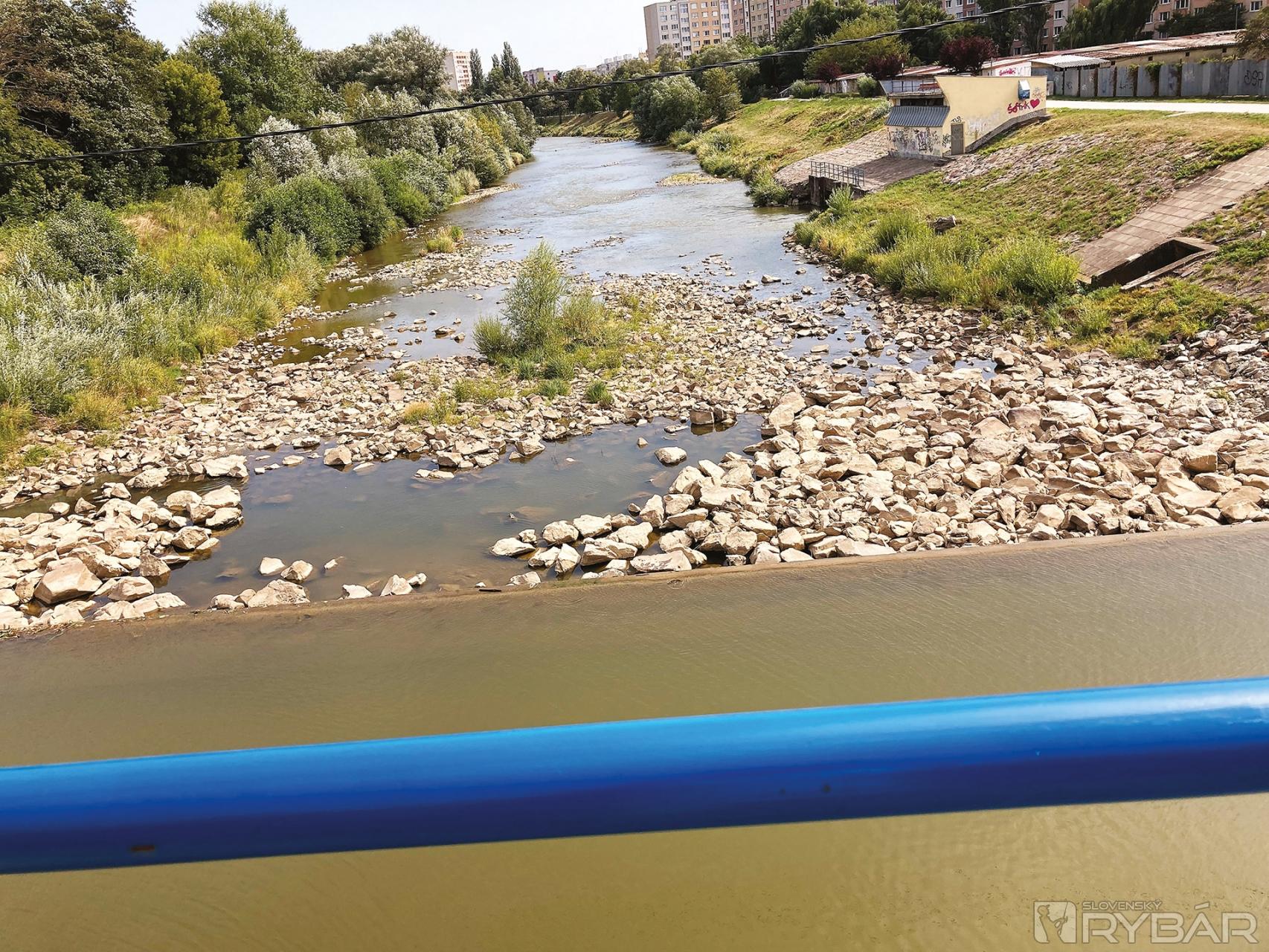 Fotografia zo splavu v mestskej časti Nad jazerom, kde je Hornád na suchu – vpravo MVE.
