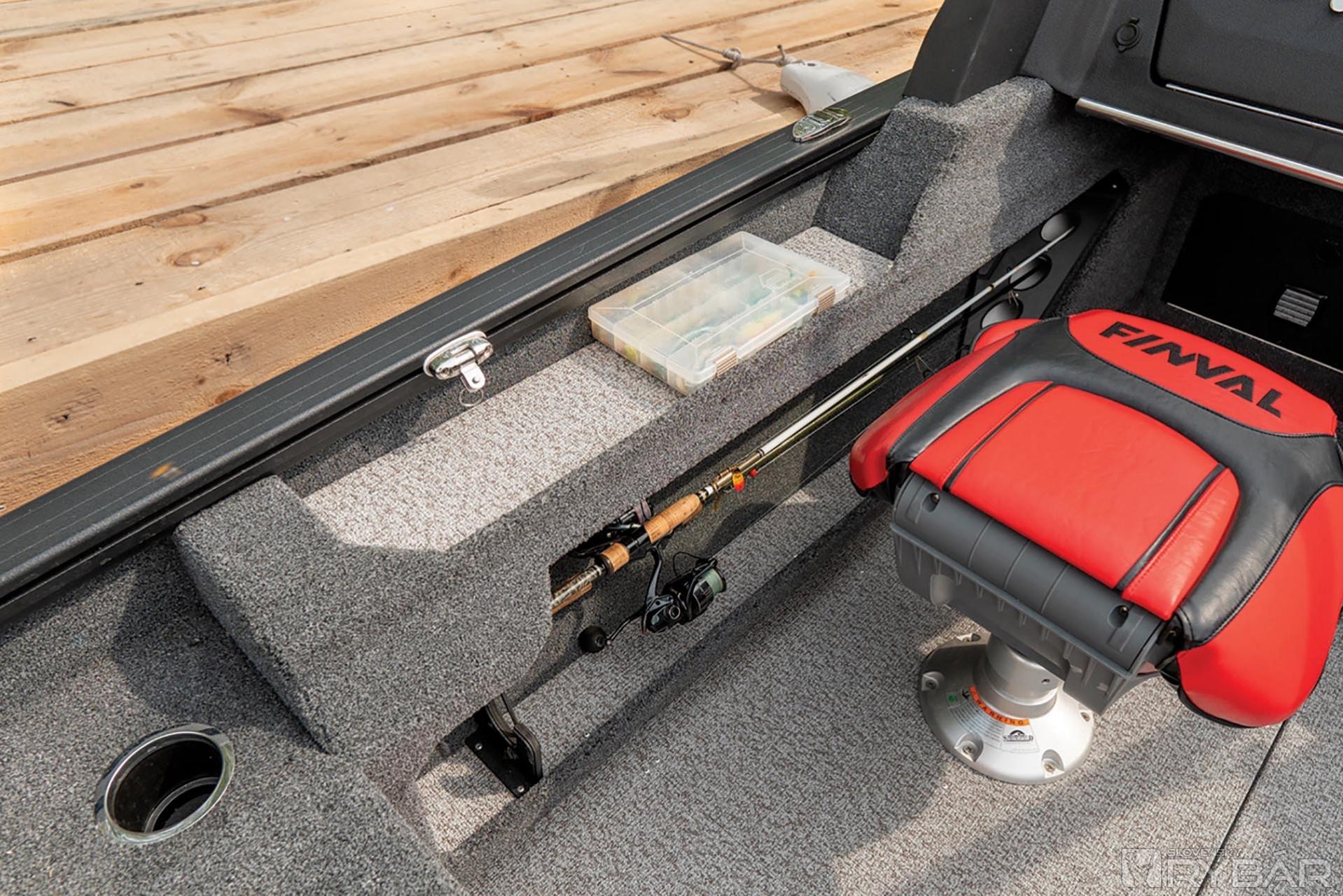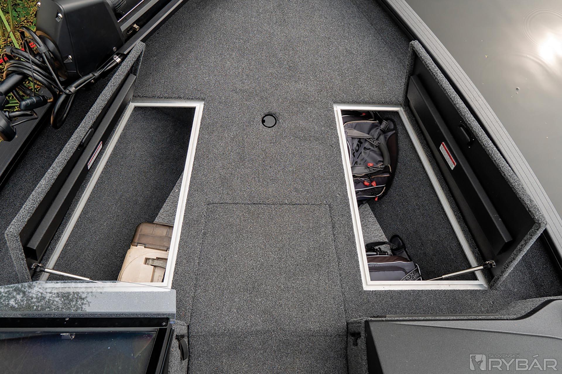 Predná paluba je dosť priestranná. Napravo a naľavo sú dva veľké suché úložné boxy s tlmičmi na dvierkach. Objem odkladacích priestorov je skutočne veľký – ľahko sa doň zmestí aj cyklosedačka s nohou. Pohodlie dopĺňajú dva držiaky nápojov, umiestnené na konzolách z vonkajšej strany. Tu sme umiestnili tiež novinku, a to zásuvku na rybársku výbavu a iné drobnosti. V strede prednej paluby je situovaný obrovský úložný priestor na prúty. Bez problémov sa sem zmestí 10 prútov s dĺžkou až 2,45 metra. Pod box na prúty môžete nainštalovať aj elektrické trakčné batérie.