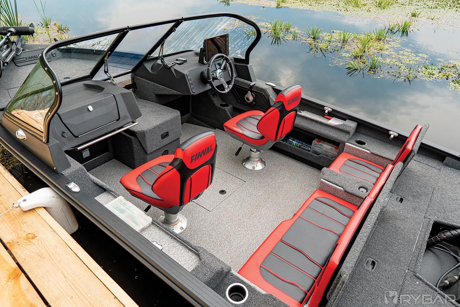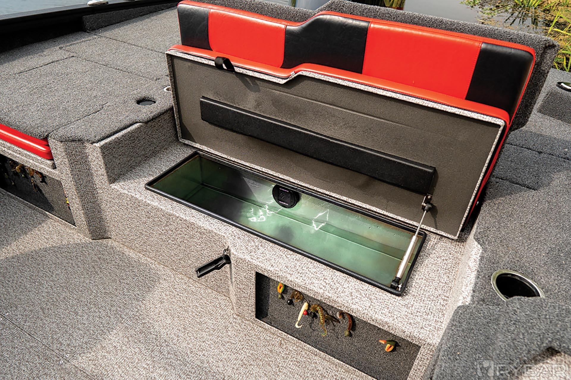 Teraz o kapacite zadnej paluby – v strede je obrovský a dlhý box, kde sa zmestí kompletné bimini aj s konštrukciou. Box je taký priestranný, že sa doň zmestí aj množstvo iných vecí. Okrem toho tento odkladací priestor poskytuje praktický servisný prístup do podpalubia a k časti elektrického vybavenia. Bližšie ku konzole máme jedno jednoduché a jedno dvojité sklopné sedadlo pre cestujúcich. Pod jedným sedadlom je technický úložný priestor pre batériu a nabíjačku. Pod dvojitým sedadlom sa nachádza nádrž na ryby s aerátorom a automatickým cyklovačom, LED osvetlením a oxygenátorom. Medzi sedadlami sú dve základne. Jedna pre inštaláciu rybárskej sedačky alebo cyklosedačky, druhá pre vloženie pylónu na ťahanie lyžiara. Po bokoch sedačiek, priamo pri rukách cestujúcich, sú dva veľké držiaky na poháre alebo fľaše.