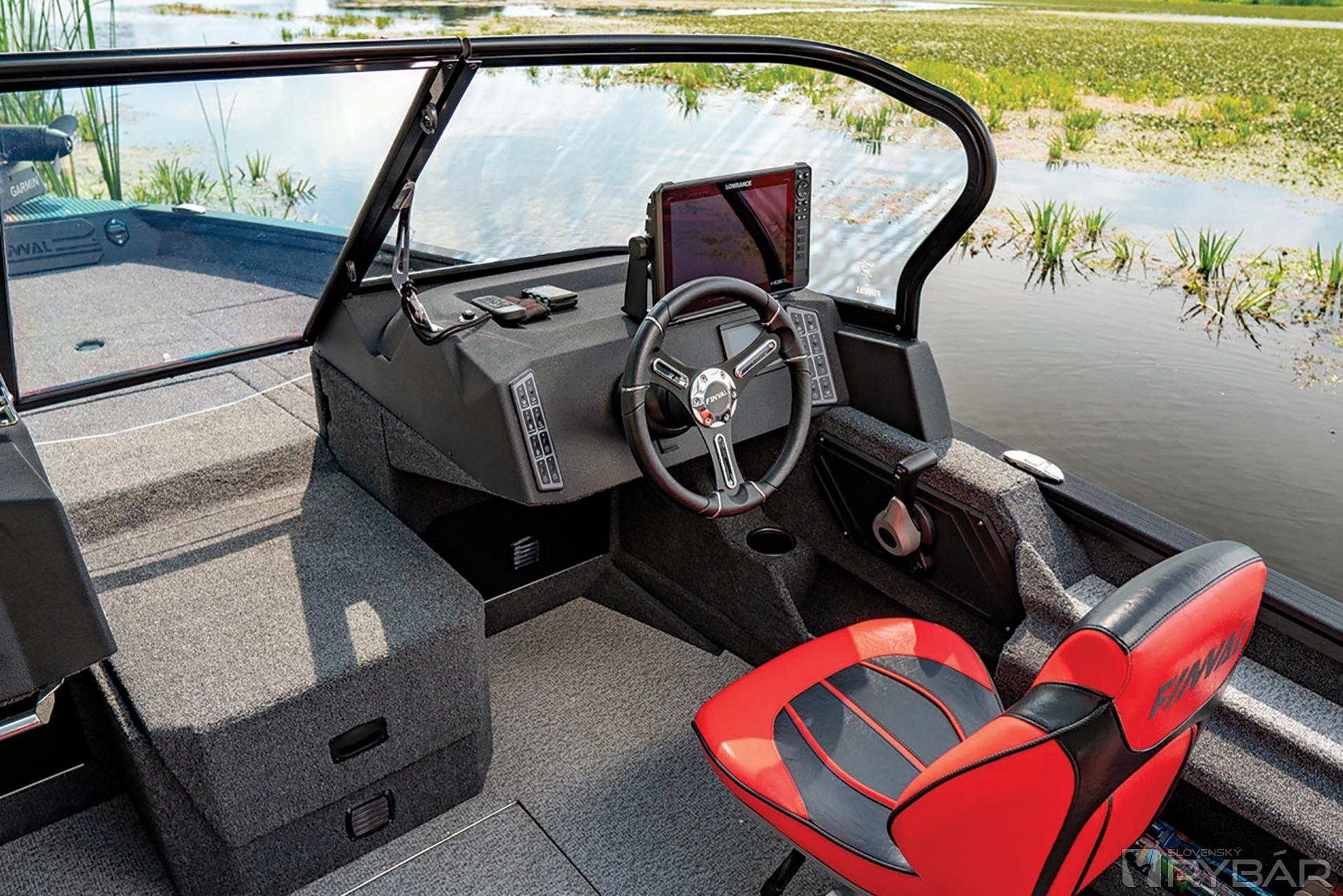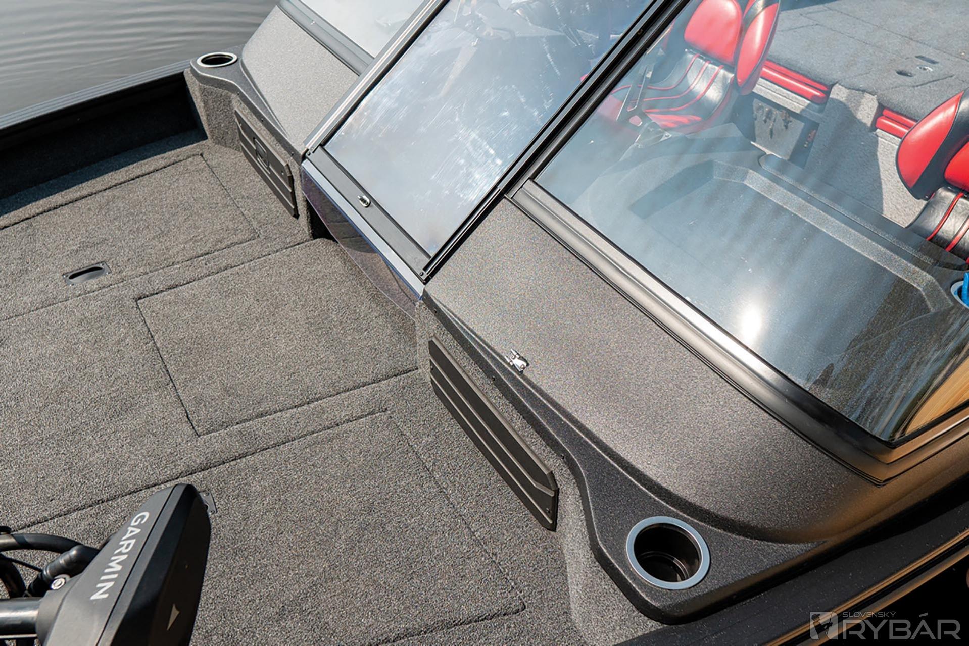 Kokpit si zaslúži osobitnú pozornosť. Sú tu veľké sklolaminátové konzoly, na ktoré môžete nainštalovať až dva 12-palcové sonary a čelné sklo je vyrobené z tvrdeného skla, ktoré sme vytvorili spolu s firmou Taylor Made. Takže ani inštalácia stieračov nie je žiadny problém. Umiestnili sme tu tiež dva štýlové a spoľahlivé membránové panely na ovládanie elektroniky v člne, s kvalitným osvetlením v tme. Existuje dostatok voľných tlačidiel na pripojenie ďalšieho vybavenia, ktoré možno budete potrebovať. Pod kapitánovou pravou rukou je držiak na fľaše a polička na osobné veci. Konzola pre spolujazdca má zabudovaný držiak na fľaše, USB zásuvku a výklenok na odkladanie drobností. V samom strede konzoly je veľká, priestranná odkladacia schránka, ako aj široká rukoväť z nehrdzavejúcej ocele. Pod oboma konzolami sú ďalšie úložné priestory na veci alebo inštaláciu ďalšieho vybavenia. Medzi prednými sedadlami je veľký box v podlahe. Môžete ho použiť na uschovanie náhradných vrtúľ, fendrov či iného vybavenia.