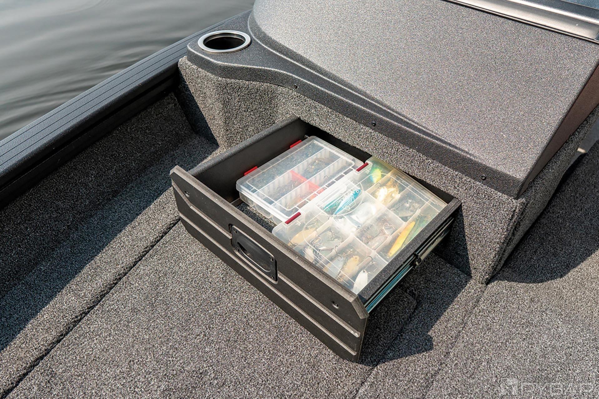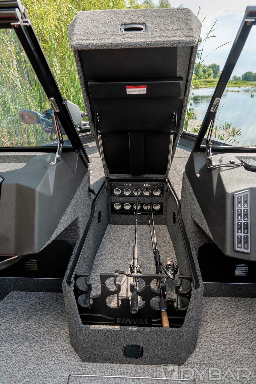 Všimnite si police a výklenky na oboch stranách kokpitu, aby bolo všetko poruke! Nemusíte nič otvárať, stačí siahnuť. Na strane vodiča je pod policou priestranný výklenok a na strane spolujazdca pod policou sme urobili výklenok s rýchlym prístupom k trom prútom. Takže v tomto člne môžete uložiť 13 prútov v pripravenom stave na použitie! Zopakujme: 10 prútov v boxe na prednej palube a 3 prúty vo výklenku. Ak nepotrebujete veľa prútov a objednali ste si rozloženie s gaučom v tvare U, bez centrálneho boxu budete mať možnosť ponechať si prúty práve tu.
