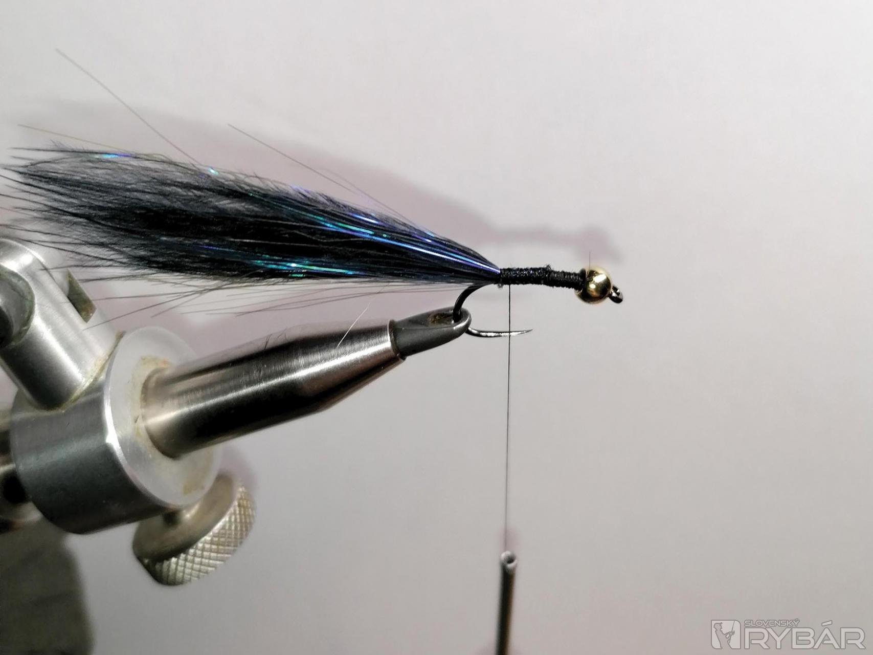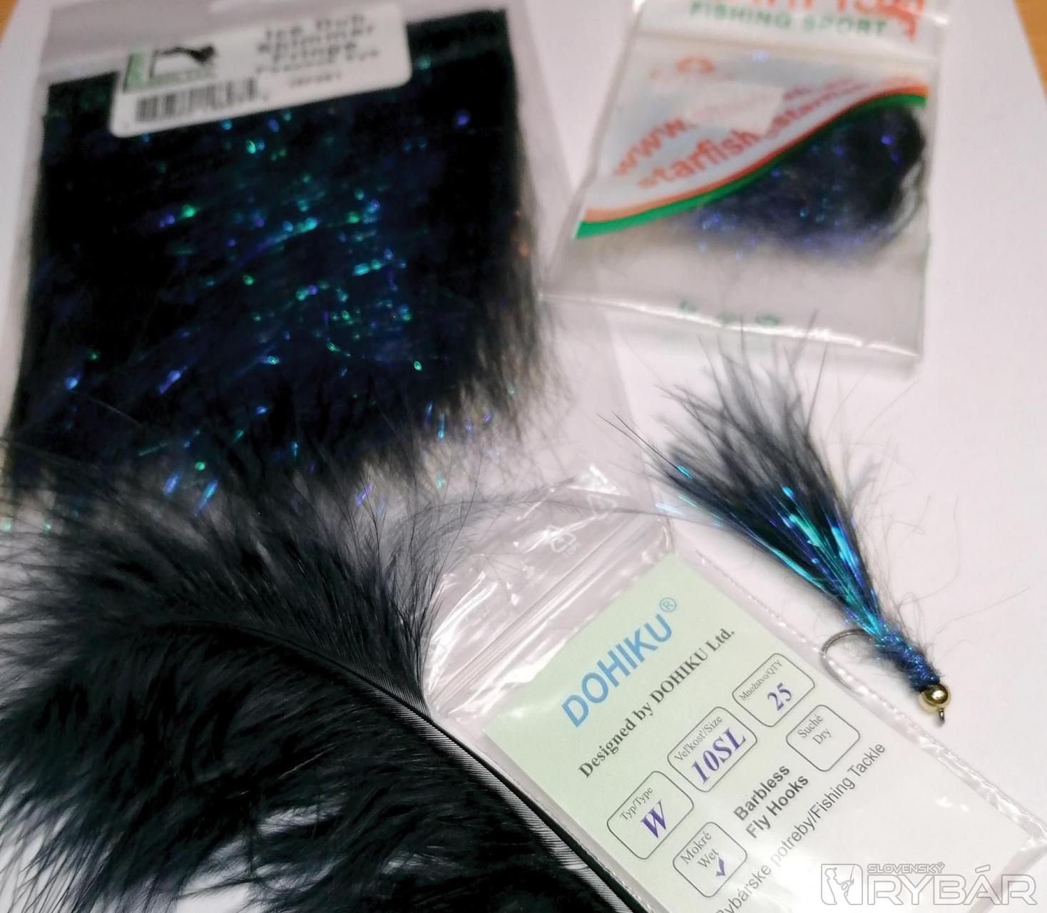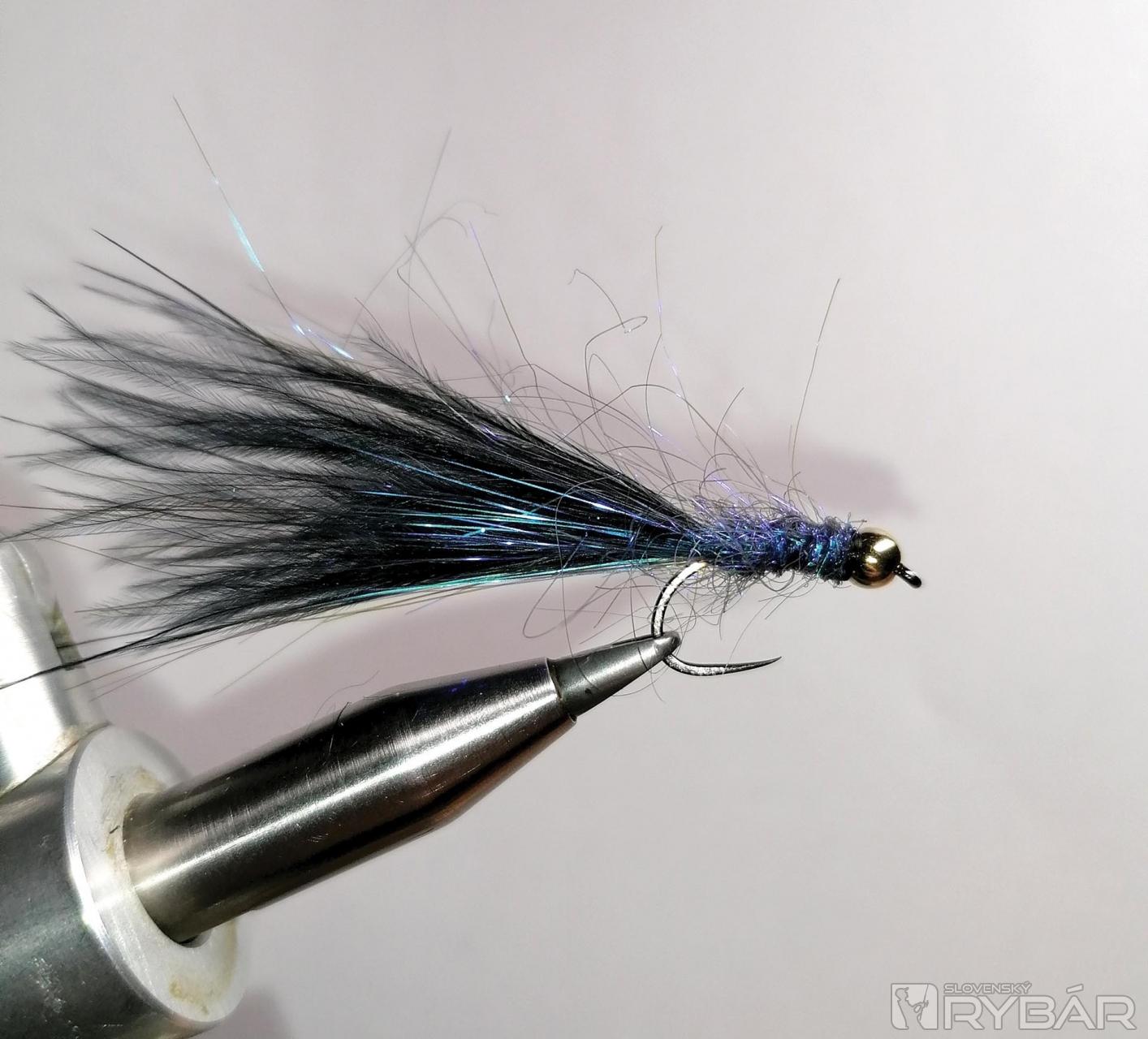 Materiál: háčik Dohiku W 10SL, čierne marabu, Ice dabing , čierna viazacia niť, Ice vlasy modré, zlatá hlavička 3,5 mm.