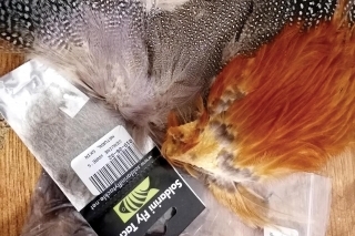 Materiál: háčik Maruto D04 veľkosť 12, skalp s kohúta, sivé CDC, pierko z perličky, čierna viazacia niť.