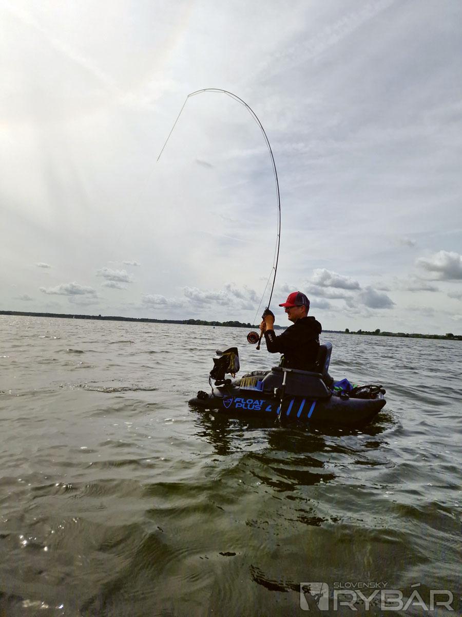 Skenujem vodu so sondou Garmin LVS34 v režime snímania dopredu, ale keďže jazdím na bellyboate asi 3 – 4 km/h s motorom Float Plus, tak vlastne cúvam a sondou sa pozerám asi 20 – 40 m dozadu. Rýchlo som si všimol, aké sú sumce slepé. Nahodím, potiahnem a nič sa nedeje. Šťuky reagujú rýchlo a prichádzajú k nástrahe okamžite, najmä v čistej vode. K sumcovi sa musíte priblížiť. Približujem sa k „slizniakom“ na 5 – 8 m, potom na ne nahadzujem so šnúrou sink3 a zaťaženým strímrom od Marios Fliegendose. Musíte presne vypočítať smer a dráhu, kam sumec pláva, aby ste strímer dostali k sumcovej hlave. Vďaka krútiacemu sa chvostíku na strímri ho lepšie zaregistruje. Dosah sonaru, teda vzdialenosť, na ktorú hľadám ryby, preklikám na 10 – 15 m hneď, ako rybu nájdem, aby som vedel presne lokalizovať jej hlavu. Keď sumec zaregistruje strímer, takmer okamžite nasleduje brutálny záber a po ňom silný súboj. Sumec niekedy pláva divoko cikcak, sem a tam, takže niekedy musím sledovať jednotlivé ryby aj 5 – 10 minút, kým sa mi podarí cielene nahodiť. To je nemysliteľné z člna alebo kajaka. Môj manévrovateľný, tichý bellyboat Float Plus je na to ideálny!