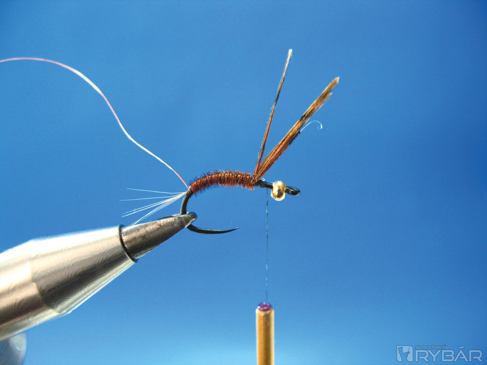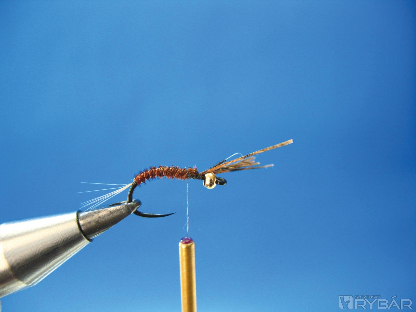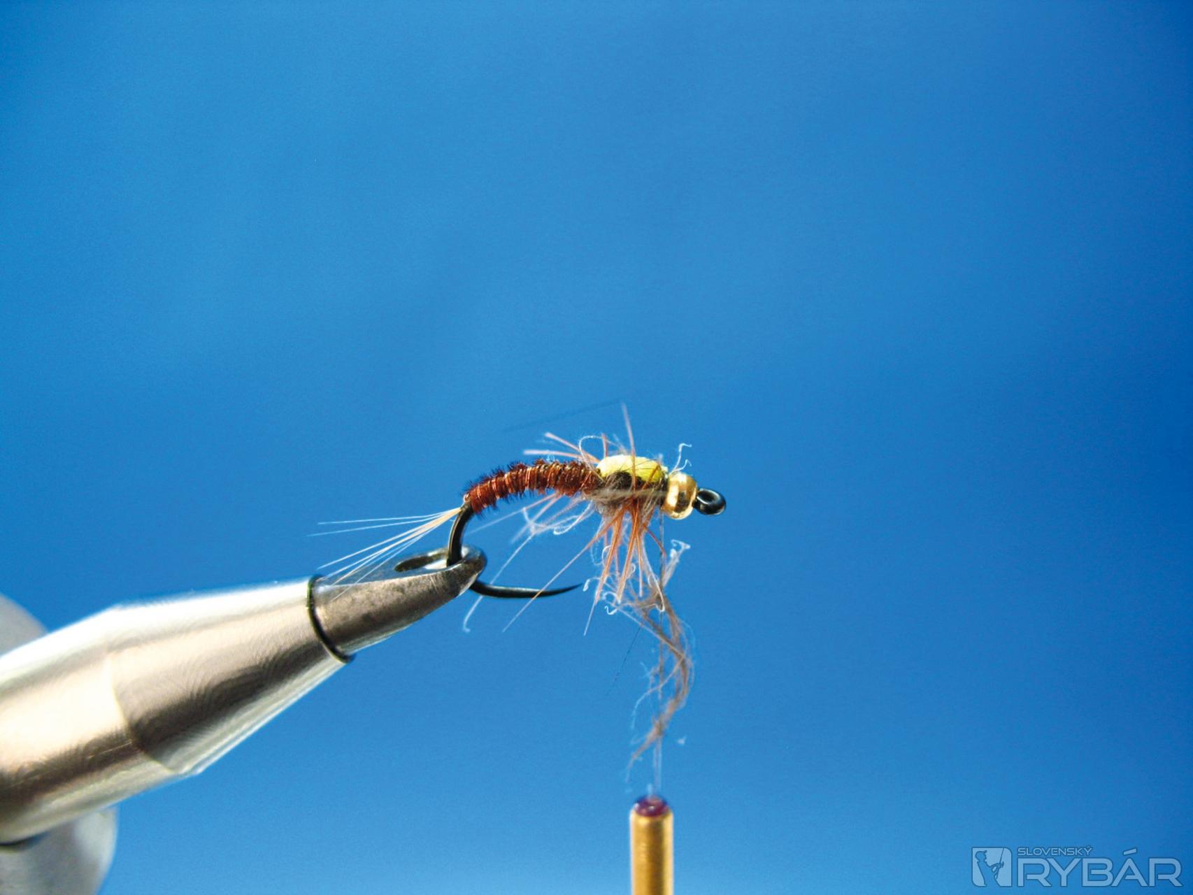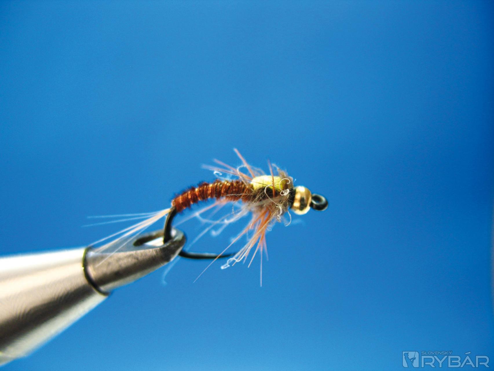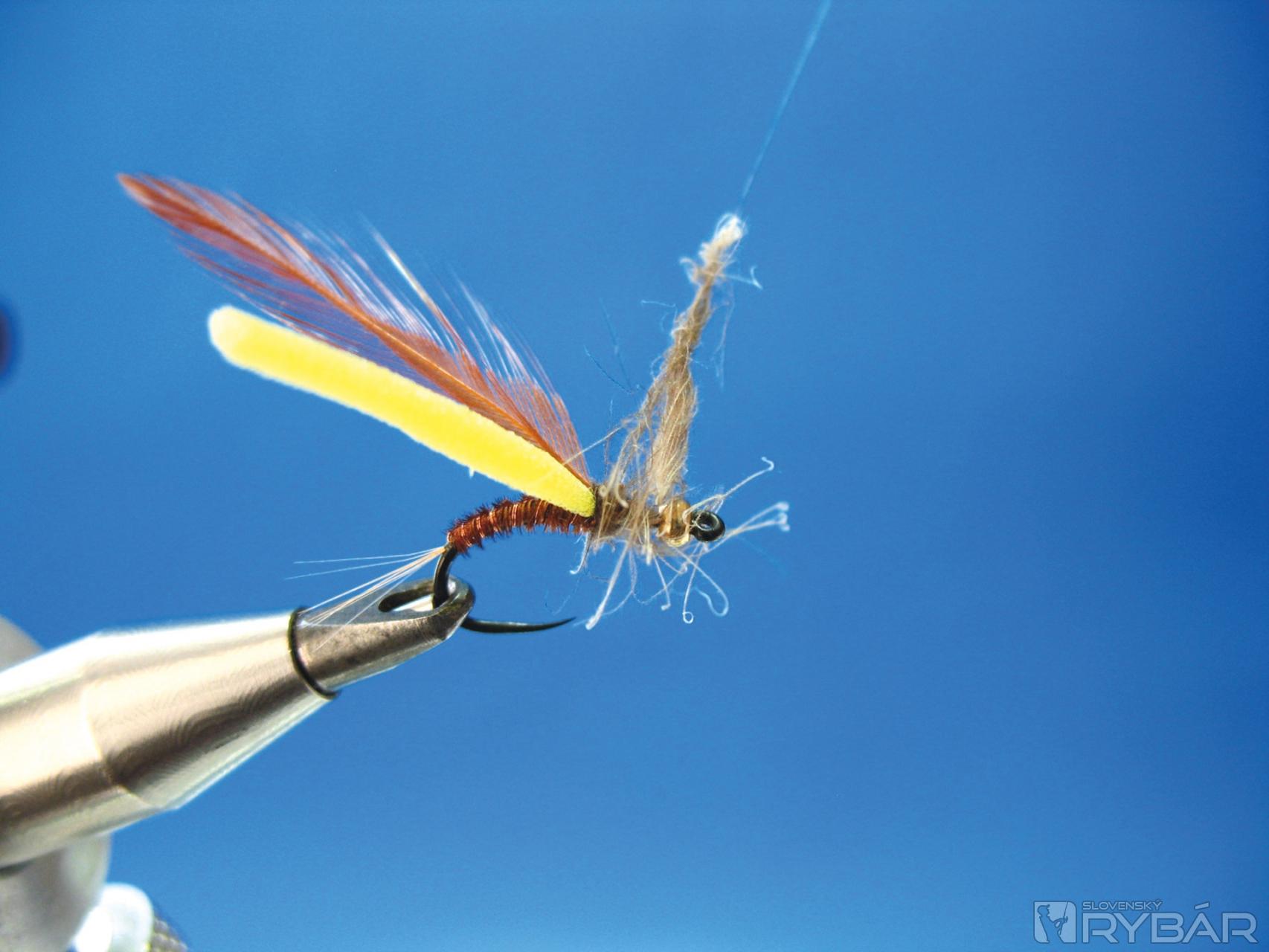 Dobre sa mi osvedčila verzia, ktorú môžete vidieť na obrázkoch viazacieho postupu. Prírodná farba štetov s telíčkom navia-zaným z hnedého chvostového pera bažanta krúžkované tenkým medeným drôtikom. V kombinácii so žltou alebo oranžovou penou je to účinná muška na lov lipňov alebo pstruhov.