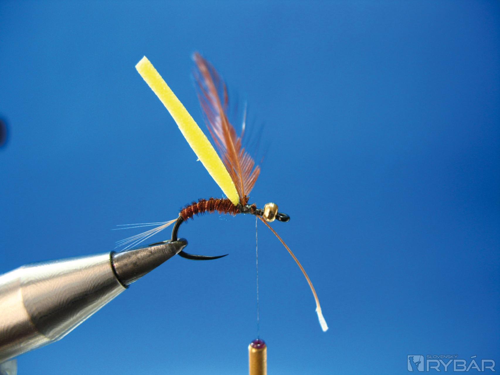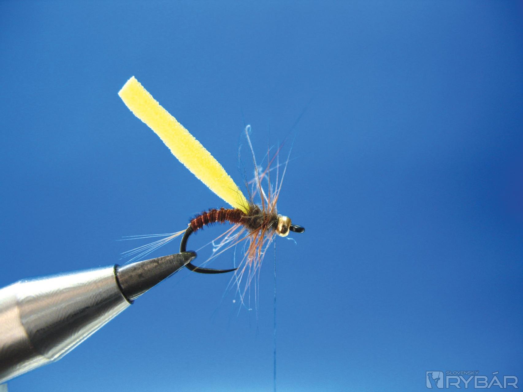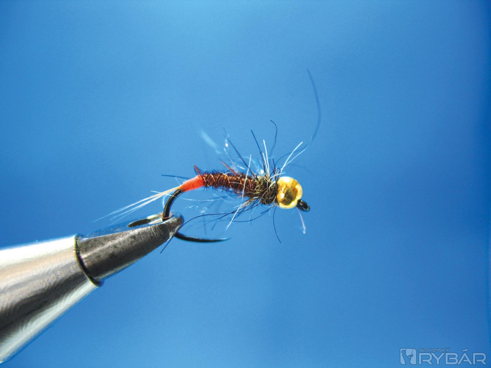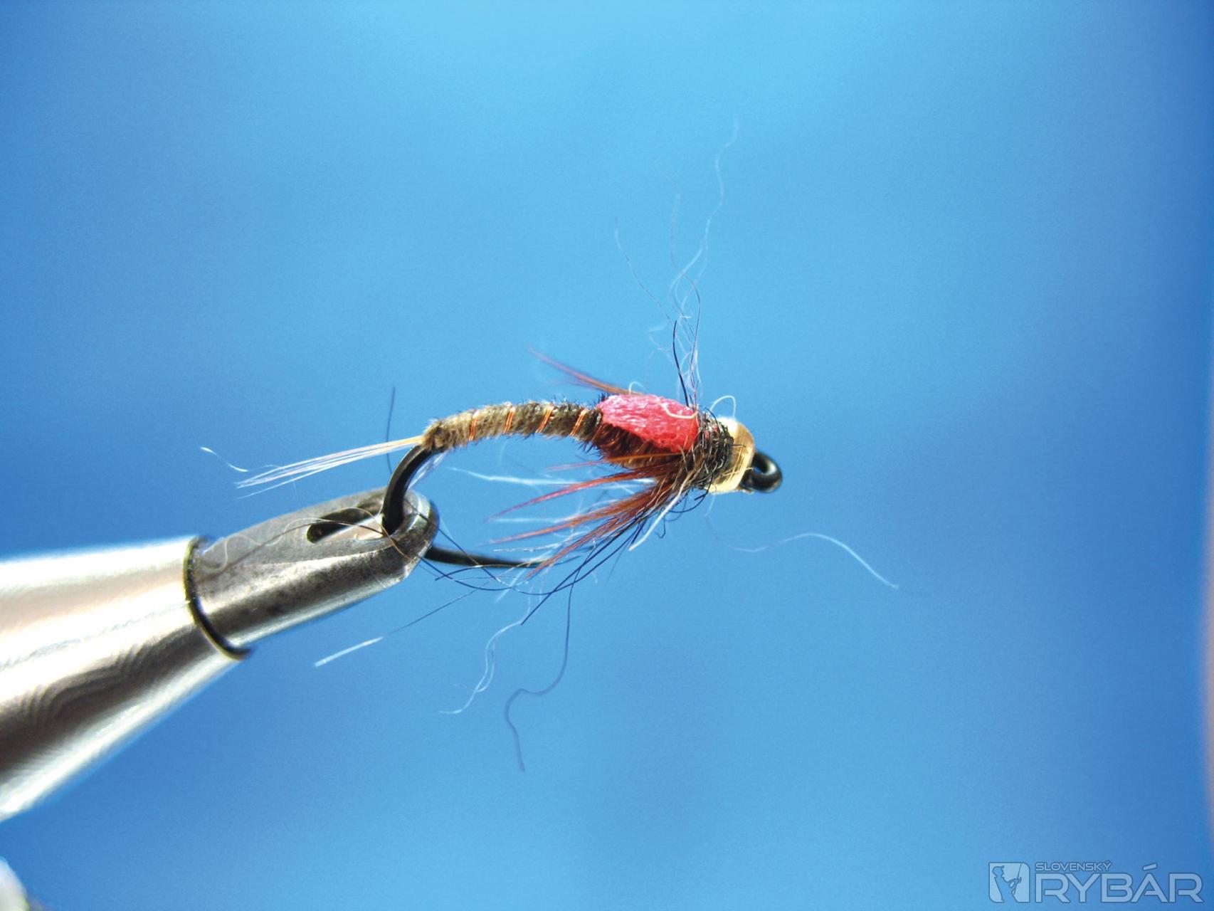 Dobre sa mi osvedčila verzia, ktorú môžete vidieť na obrázkoch viazacieho postupu. Prírodná farba štetov s telíčkom navia-zaným z hnedého chvostového pera bažanta krúžkované tenkým medeným drôtikom. V kombinácii so žltou alebo oranžovou penou je to účinná muška na lov lipňov alebo pstruhov.