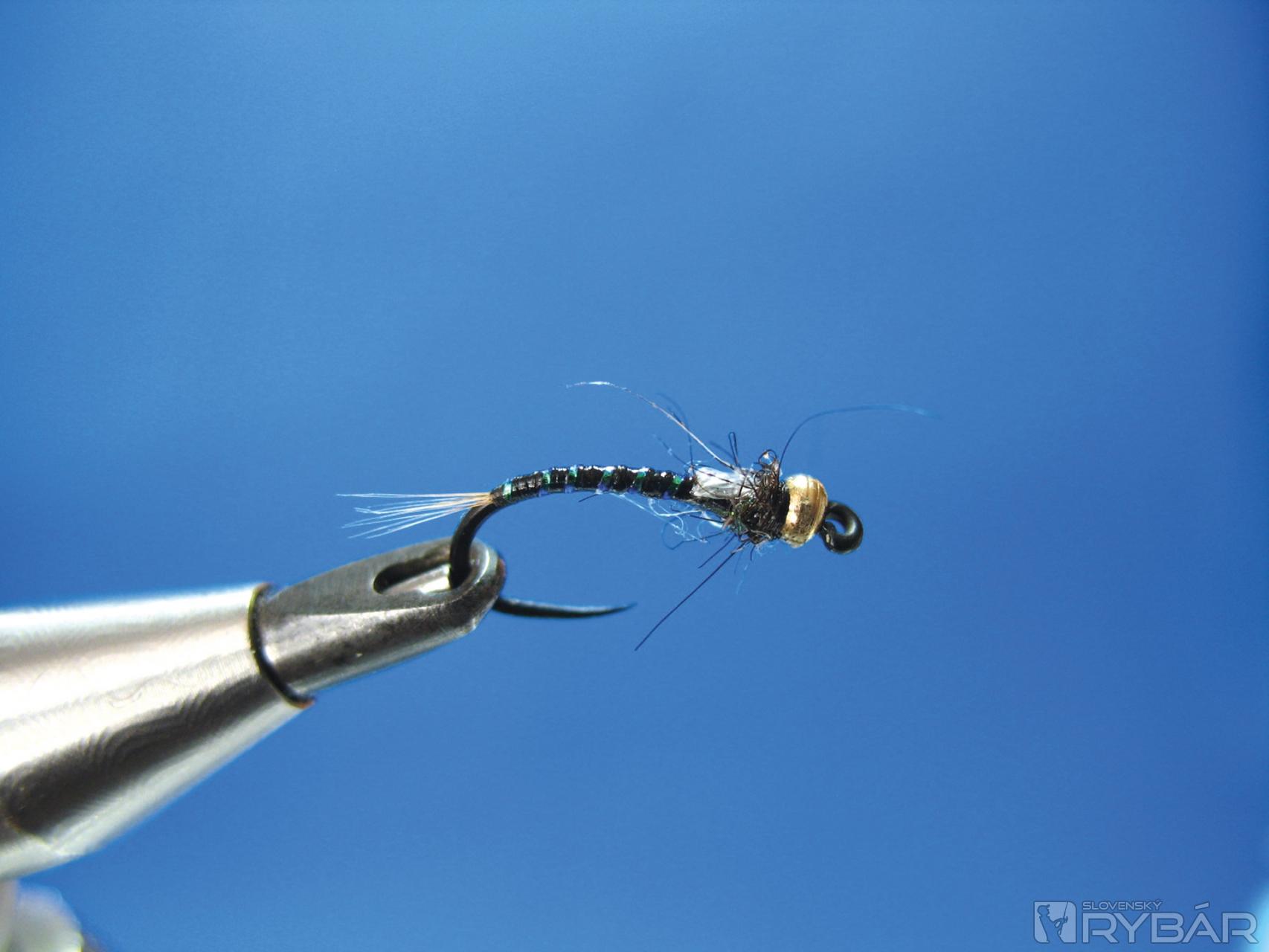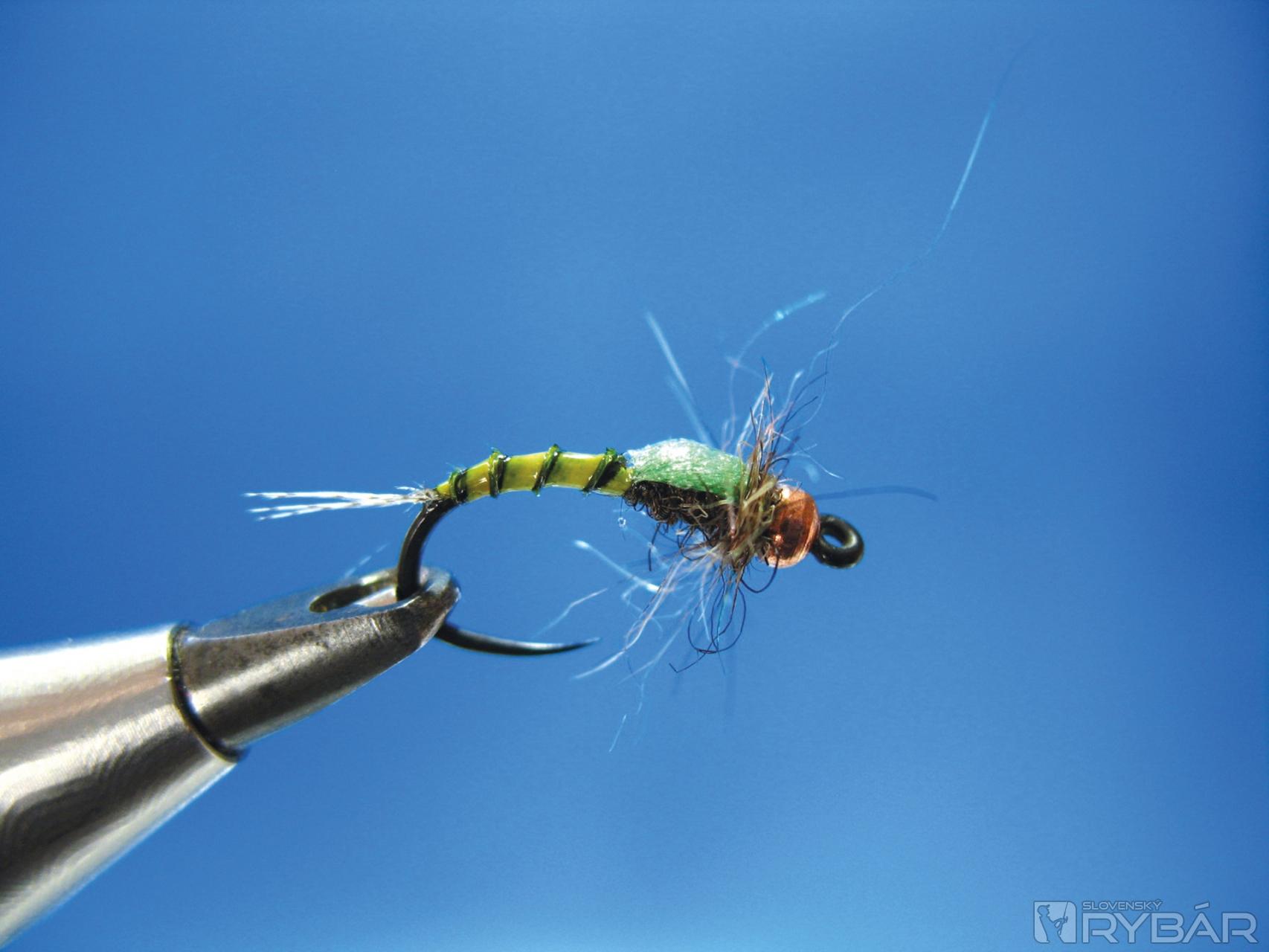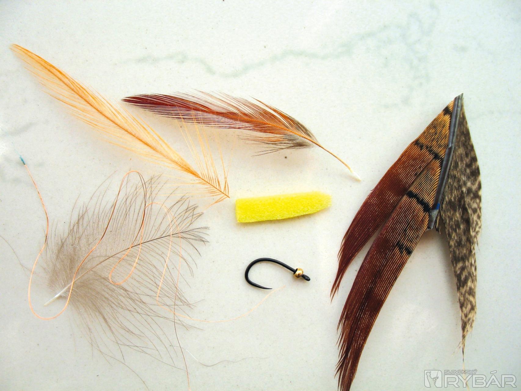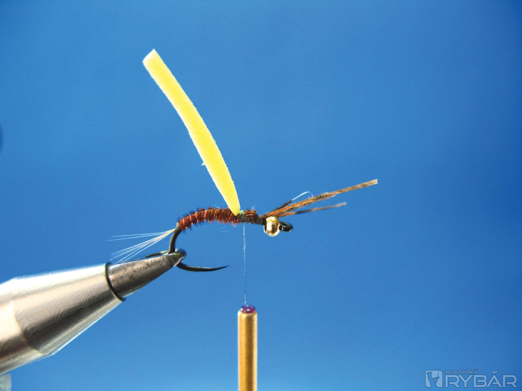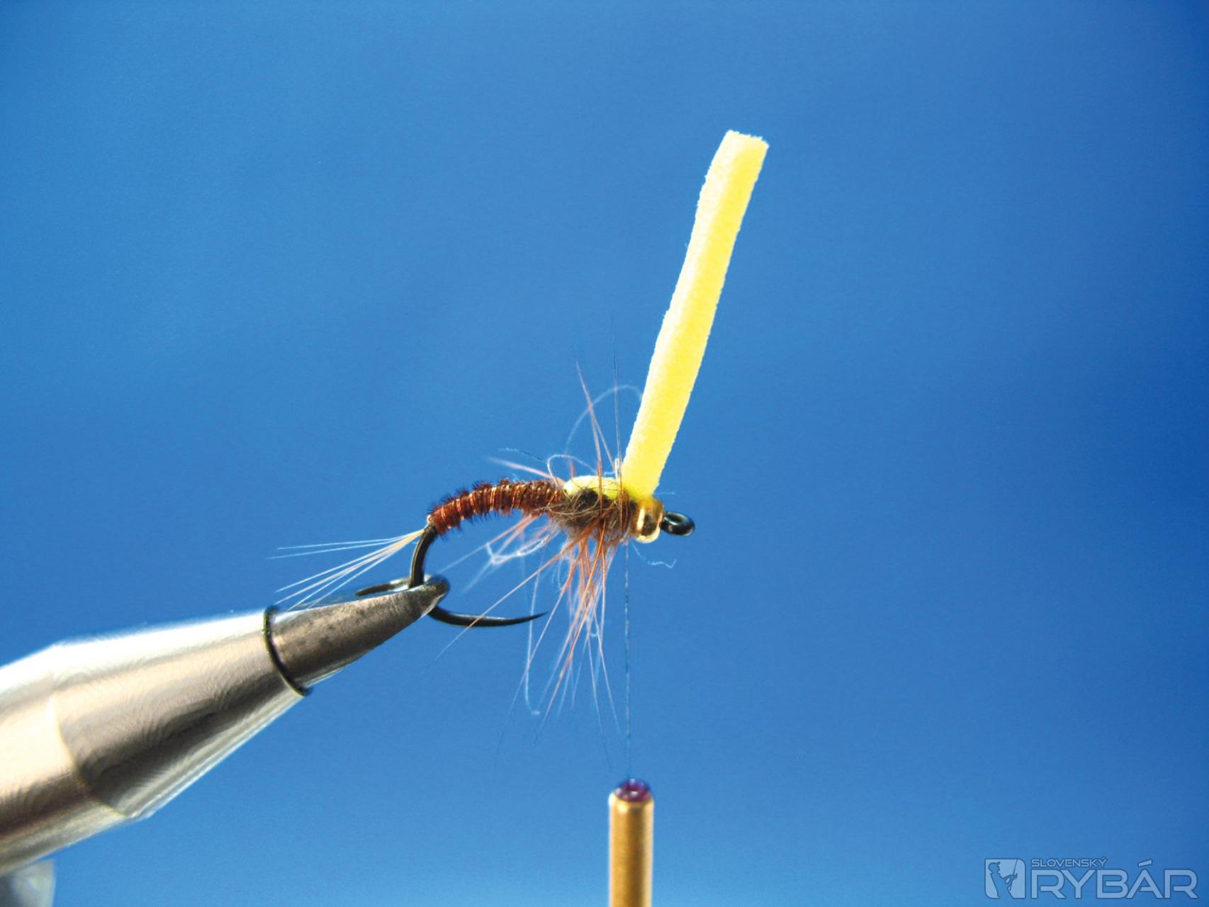 Dobre sa mi osvedčila verzia, ktorú môžete vidieť na obrázkoch viazacieho postupu. Prírodná farba štetov s telíčkom navia-zaným z hnedého chvostového pera bažanta krúžkované tenkým medeným drôtikom. V kombinácii so žltou alebo oranžovou penou je to účinná muška na lov lipňov alebo pstruhov.