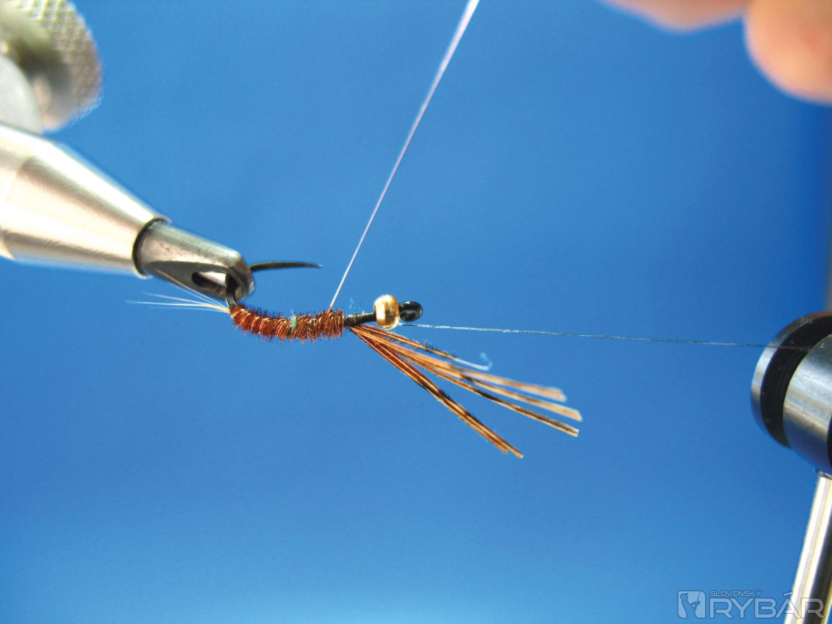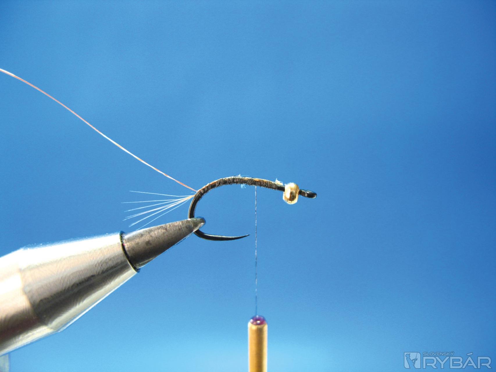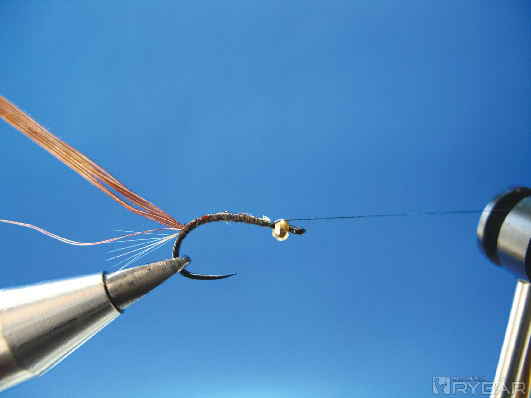 Viazacou niťou prichytíme snopček vetvičiek z chvostového pera bažanta, niť položíme do držiaka na bobinu. Ak by niť kĺzala cez hlavičku, je možné poistiť niť jedným strateným uzlom.