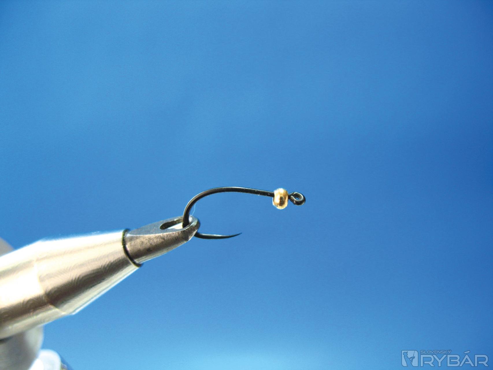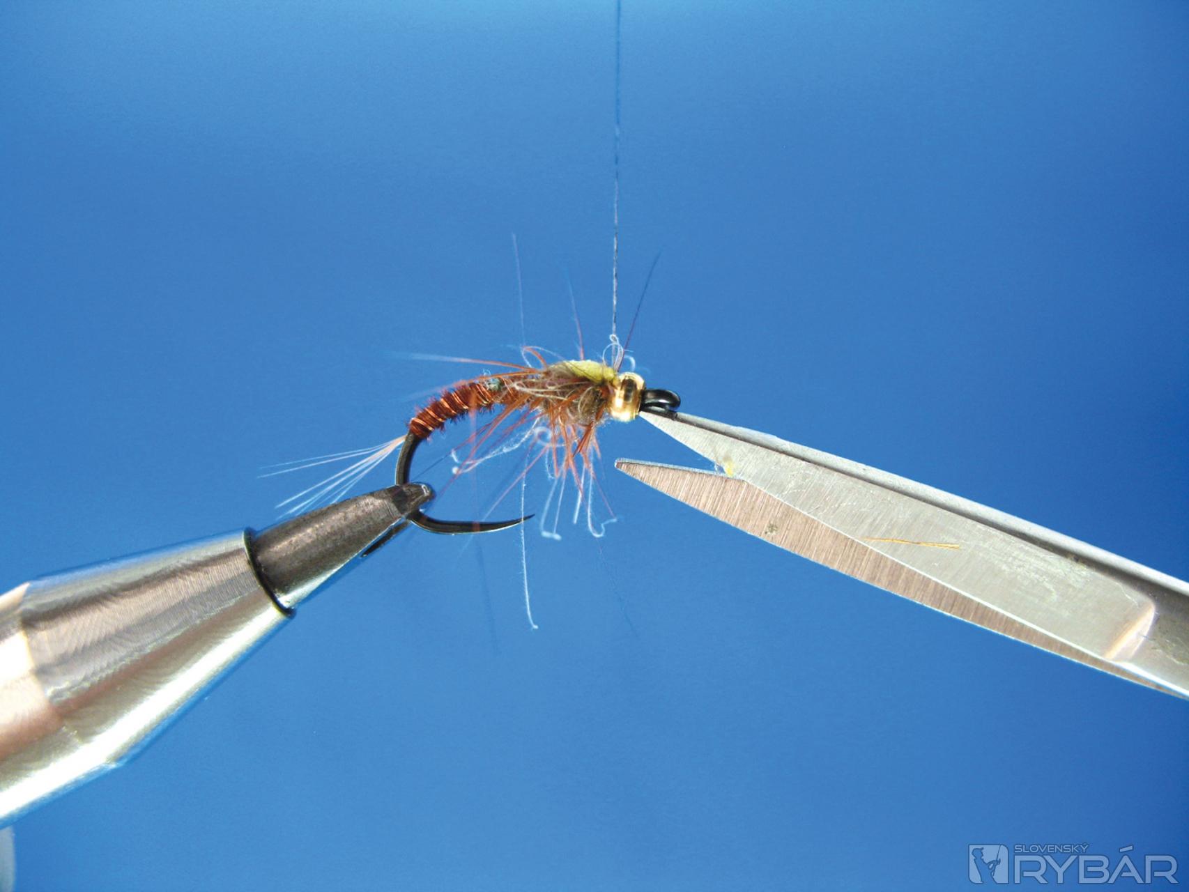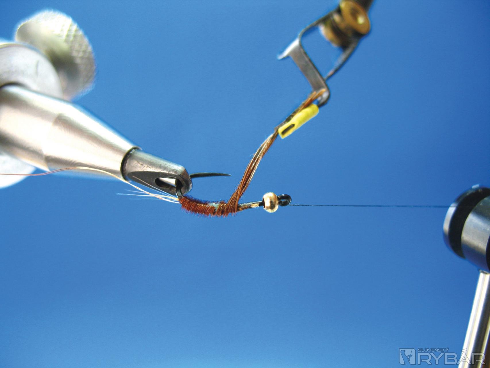 Viazacou niťou prichytíme snopček vetvičiek z chvostového pera bažanta, niť položíme do držiaka na bobinu. Ak by niť kĺzala cez hlavičku, je možné poistiť niť jedným strateným uzlom.