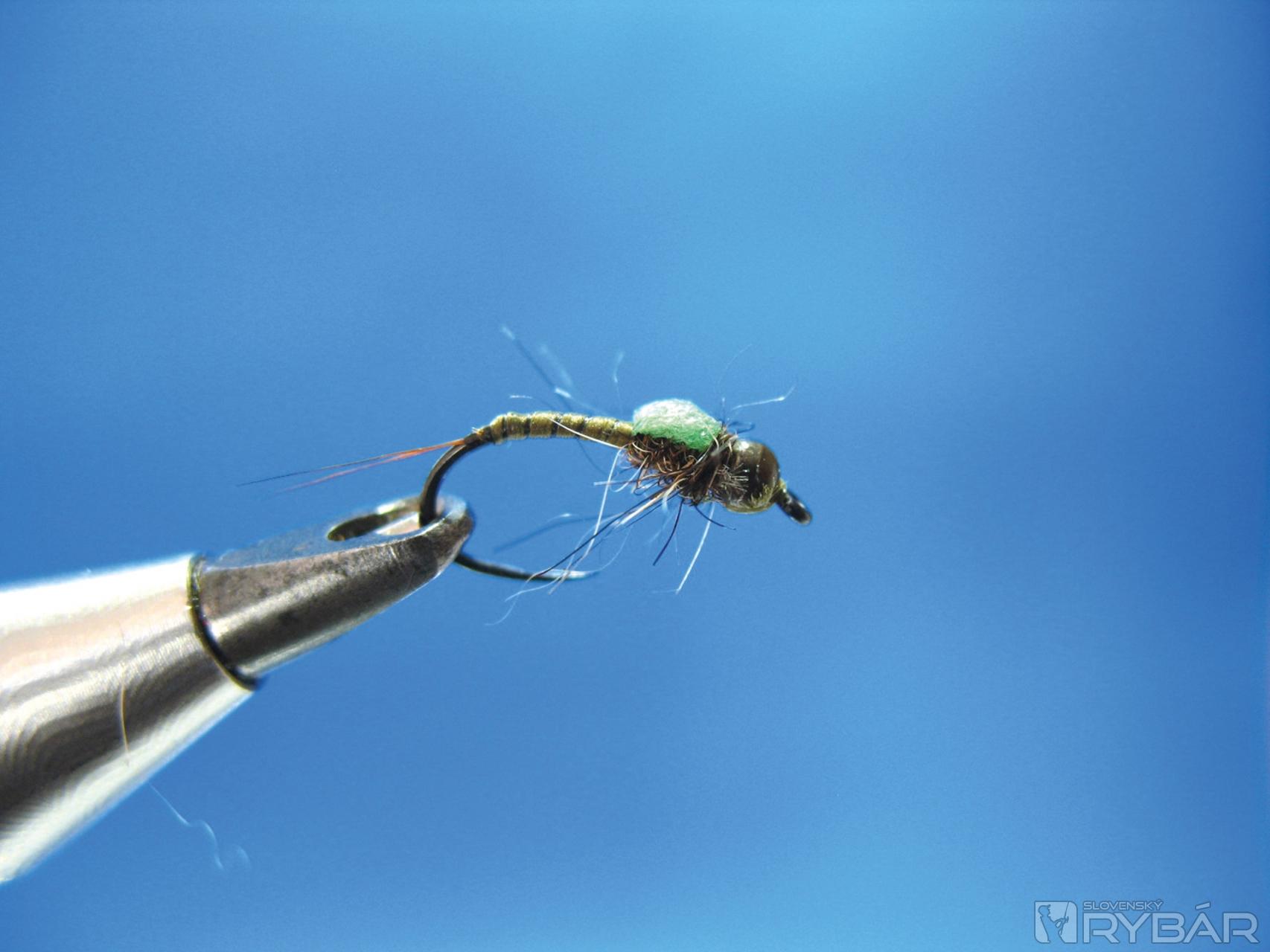 Hlavohruď pod polycelónom môže byť z rovnakého materiálu ako je telíčko a potom stačí len trocha dabingu priamo za guľôčku. Pri prírodných vzoroch používam CDC dabing, alebo prírodný dabing s lesklými vláknami. Ten je tiež nenápadný, ale jemné lesklé lametky vo vode na nymfu upozornia drobnými zábleskami.