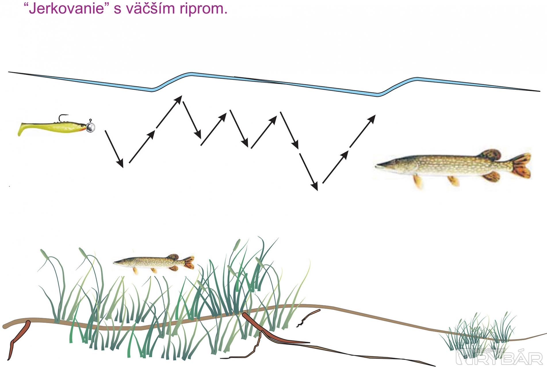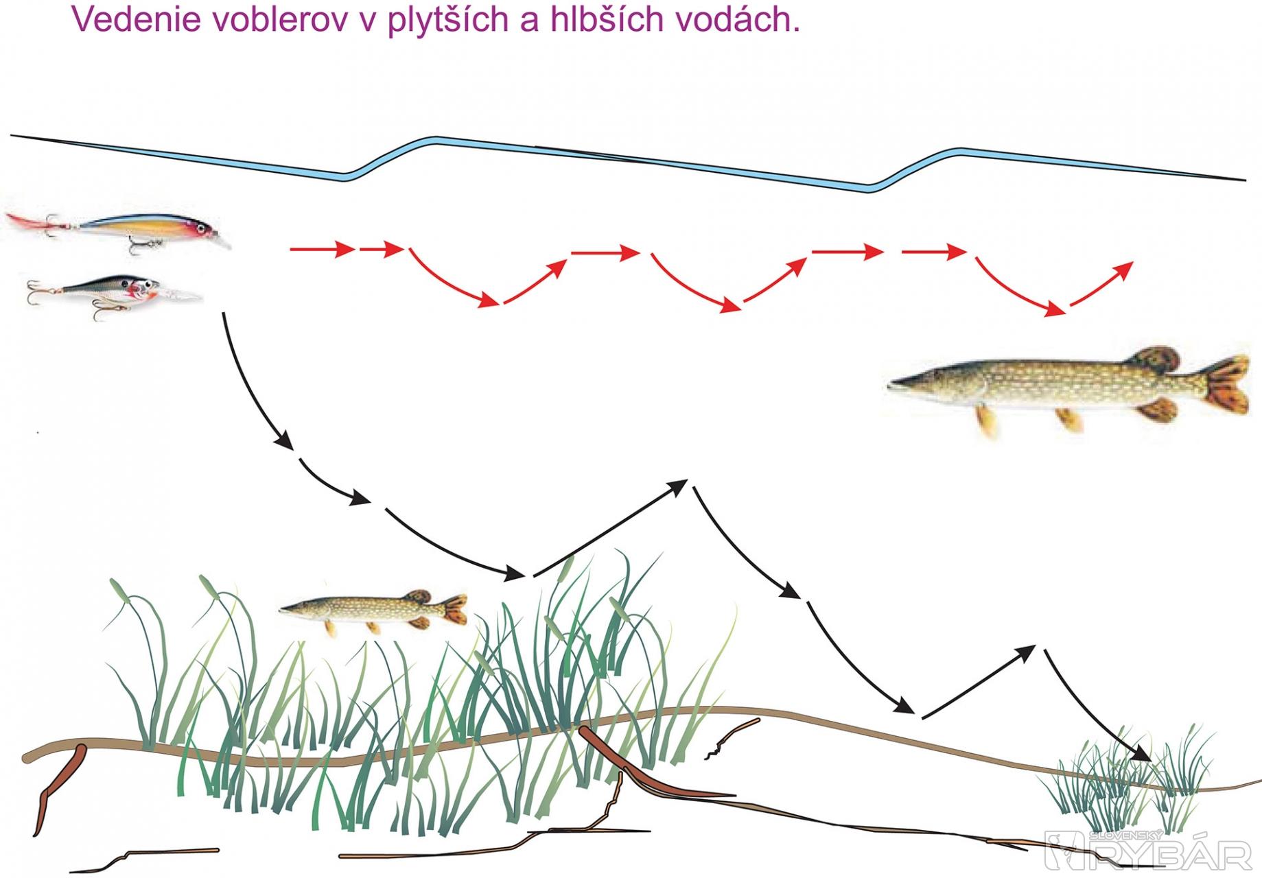 Pri love s hlboko potápavými voblermi je pomocou šípok znázornené správanie nástrahy pri vedení. Tú sa snažíme viesť plynulo a pri pocite zachytenia alebo šklbnutia o dno urobíme pauzu. Vobler tak vypláva vyššie a opätovne pokračujeme vo vedení.