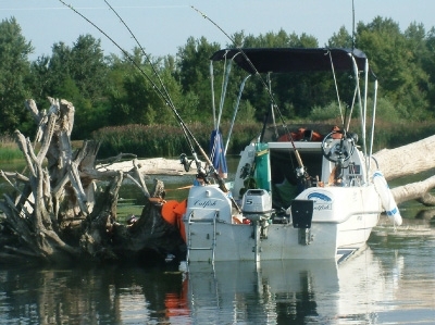 Po príchode k vode nás však prekvapili osirelé brehy, len kde tu nejaký rybár. Čomu sme sa potešili. Naše vopred vytypované miesto bolo voľné. Ešte musím spomenúť, že na túto dovolenku sme už k vode pritiahli aj nový veľký laminátový čln (štedrý vianočný darček). Plánovali sme nejakú tú noc stráviť aj na vode a preloviť aj vzdialenejšie miesta od brehu. V tropickej horúčave nám rozloženie základne a zloženie člnu trvalo 4 hodiny. Trochu sme sa osviežili vo vode a mňa čakala pre mňa tá najnepríjemnejšia vec, a teda lov nástrahových rýb. Po hodine lovu z brehu bez záberu mi bolo jasné, že aj na tejto dovolenke strávim desiatky hodín v člne pri ich love, čo ma teda ale vôbec nepotešilo. Už prvý deň mi bolo jasné, že to bude drina, keď som po piatich hodinách doniesol dvoch adeptov vhodných na nastraženie. Boli to pleskáče zelenkavé. Ostatné ryby boli, či už veľmi malé alebo veľké. Osadil som štyri bójky a s mladými som urobil dohodu, že do polnoci budú loviť oni a po polnoci ja. S pribúdajúcou tmou rástla aj aktivita a do hodiny po zotmení to už mali obidve nástrahovky za sebou. Na obidve rybky sa ulakomili asi metroví dorastenci. Nasledujúci deň a vlastne celú dovolenku sa opakoval tento scenár a záberov bolo takmer na každú nastraženú rybku. Čo viac si môže priať srdce sumčiara?
