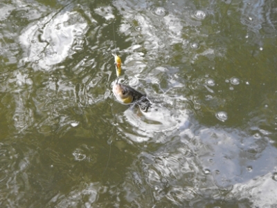 Došiel som k vode, kde som sa pohyboval s maximálnou opatrnosťou, aby som nevyplašil tie ryby, ktoré sú tesne pri brehu. Začal som nahadzovať dolu prúdom a nástrahu ťahal v blízkosti brehu veľmi pomaly. Na 4. – 5. nahodenie som mal záber, ale bol to iba jalček, ktorý mal možno 20 centimetrov. Skúsil som tu aj ďalšie voblery, ale záberu som sa už nedočkal, tak som sa presunul tam, kde bol aj malý splav. Uprednostňujem hlavne miesta pod splavmi, alebo s kríkmi, prípadne s prekážkami vo vode. Práve tam sa rady zdržujú jalce, lebo sa cítia v bezpečí a na prípadnú korisť môžu bleskovo zaútočiť.