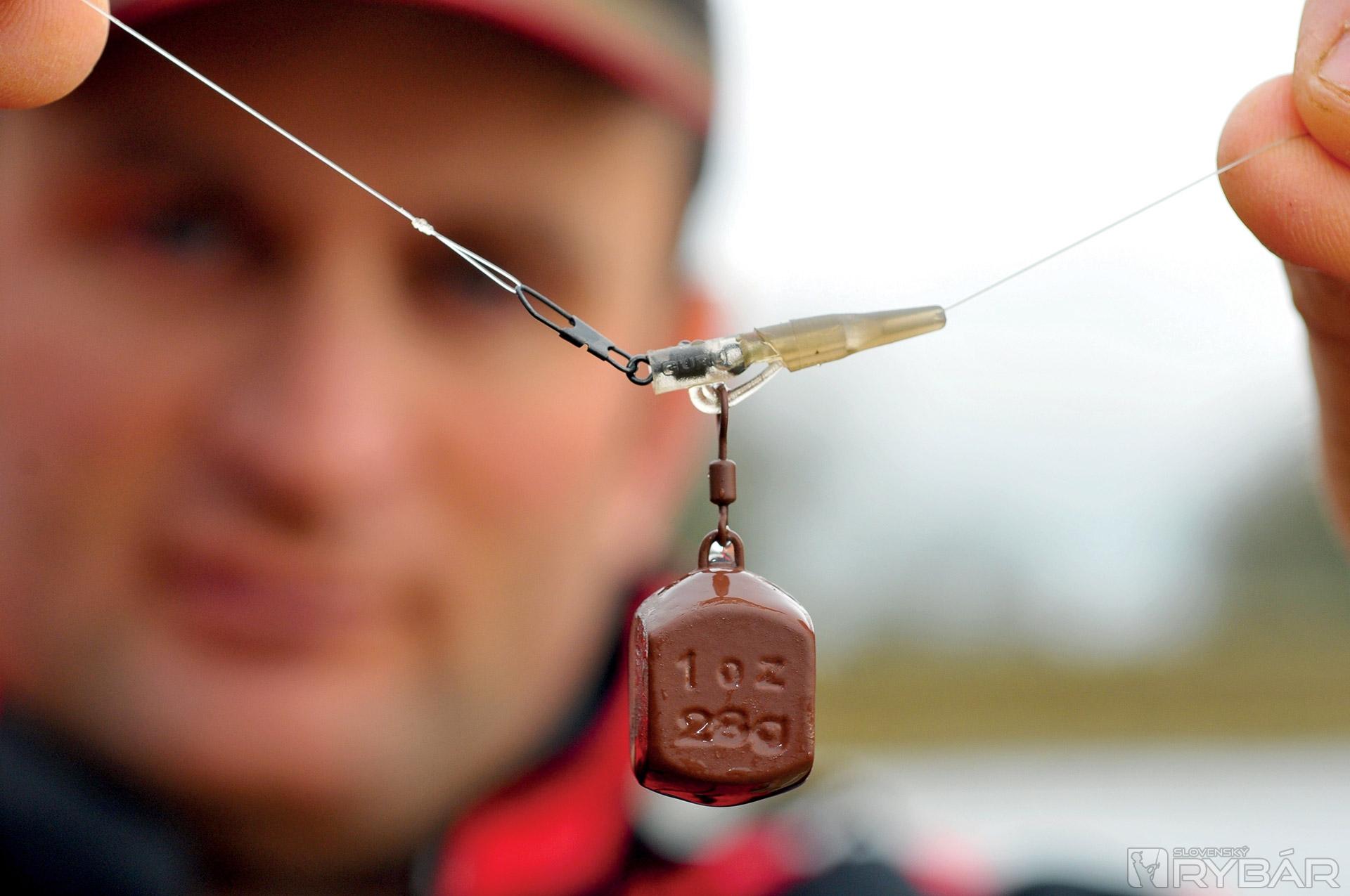 Moju montáž by som opísal ako jednoduchú a efektívnu. Použijem Guru lead clip. Je to klasická záveska, ktorá sa po hlavnom vlasci posúva a ako zarážka mi poslúži karabínka. Ďalším krokom je olovo. V tomto ročnom období je jeho veľkosť dôležitá. Snažím sa použiť čo najľahšie olovo. To preto, aby som čo najmenej rušil okolie, resp. ryby pod hladinou.