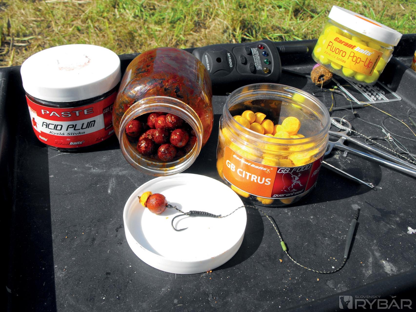 Z podrobného rozpisu pretekov bolo jasné, že jeden tím za celých 48 hodín môže zakŕmiť maximálne 15 kg boilies, a tak sme si so sebou zobrali guľôčky z dielne Garantbaits a to z radu Red Spirit príchute Acid Plum, Citrus, Monster Crab. Z týchto 3 príchutí sme si nabalili po 5 kg, plus ako nástrahy ešte 2-3 balenia boilies s názvom Speeder a, samozrejme, malé 12-milimetrové Fluoro Pop Up boilies, dip a aminostim.