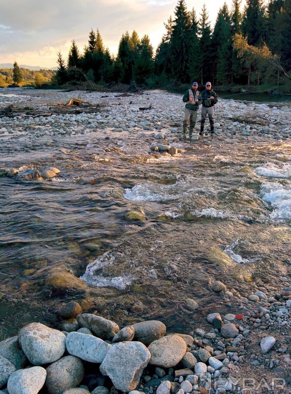 Napriek nepríjemnému dáždiku a nízkej oblačnosti sa nám veľmi páčilo. Cítili sme sa ako niekde v ďalekej Kanade, koryto rieky bolo pokryté naplaveným drevom, dookola veľké balvany, stopy vysokej zveri, za najbližšou zákrutou sme očakávali miestneho grizzlyho, indiánov (tí nakoniec boli). Znížený tlak spôsobil, že ryby nebrali ani na „tutových“ miestach a ak brali, tak len v malých množstvách, prípadne veľkostiach. Naša prieskumná skupina sem-tam ulovila nejakého potočáka, prípadne lipňa. Skúšali sme francúzske nymfovanie, krátku nymfu, suchú mušku. Svojho prvého pstruha potočného na mušku si chytil aj Karasko.