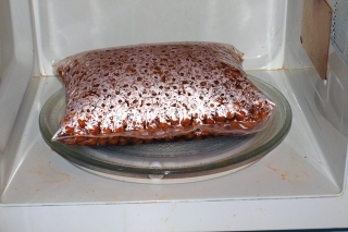 7. Čerstvo zatavené vrecko na niekoľko sekúnd vložíme späť do mikrovlnky, buďme pritom na pozore, lebo keď sa vrecko začne nadúvať, okamžite ho treba vybrať a vložiť do chladiacej tašky (bez chladiacej vložky). Teraz sme celý balíček pasterizovali (tepelne sterilizovali) a vrecúško sa začne pomaly sťahovať. Čím pomalšie sa vychladzuje, tým lepší výsledok dosiahneme, práve z toho dôvodu používam chladiacu tašku. Na horúcich zrnkách sa baktérie už nedokážu rozmnožovať, celý balík je vzduchotesne uzavretý, teda dokonale konzervovaný.