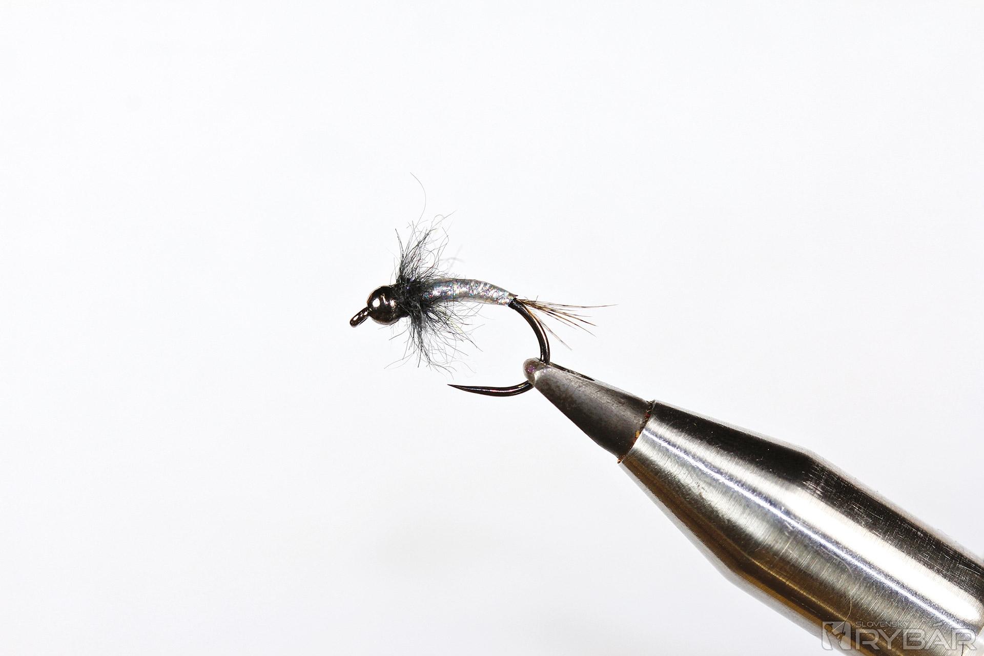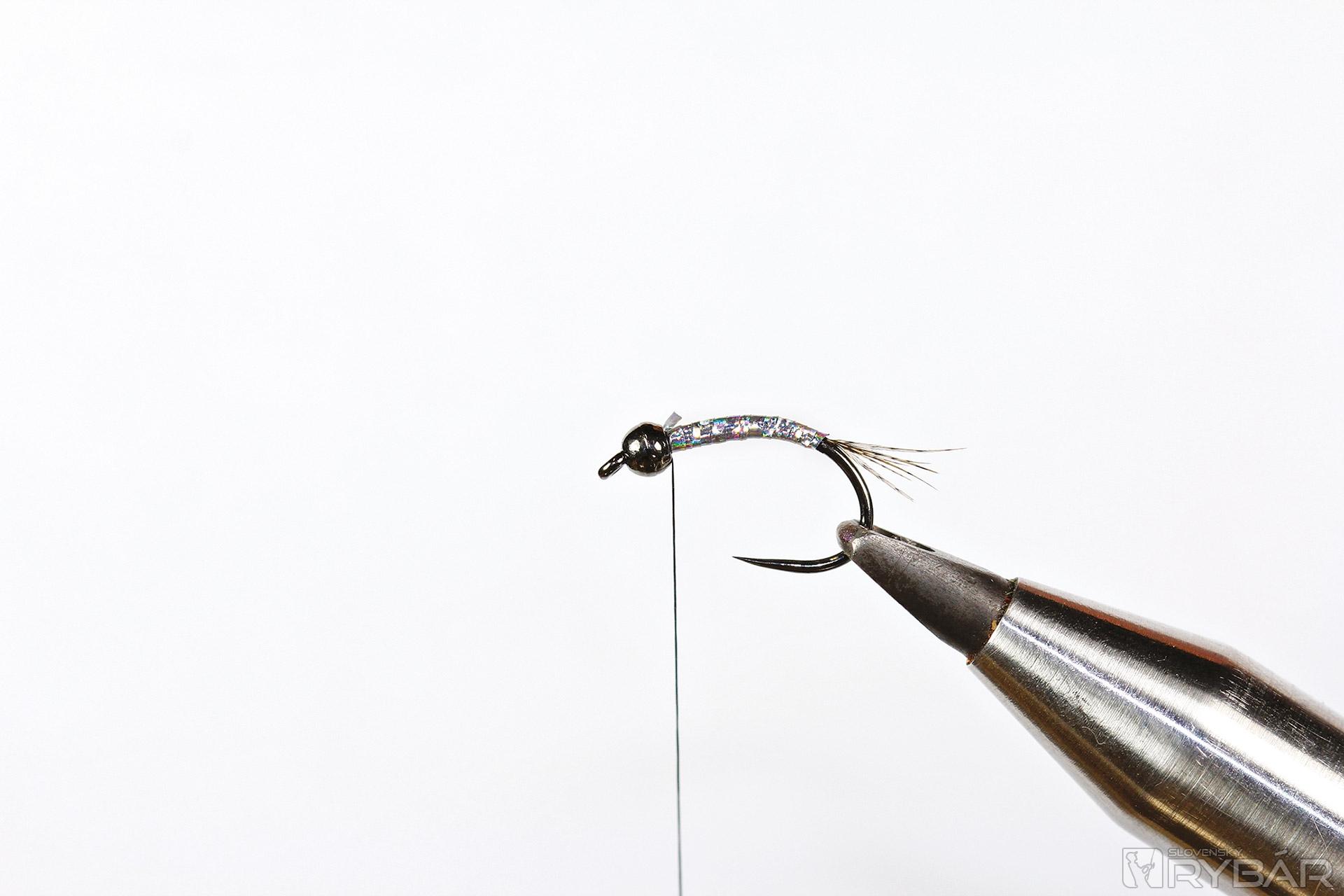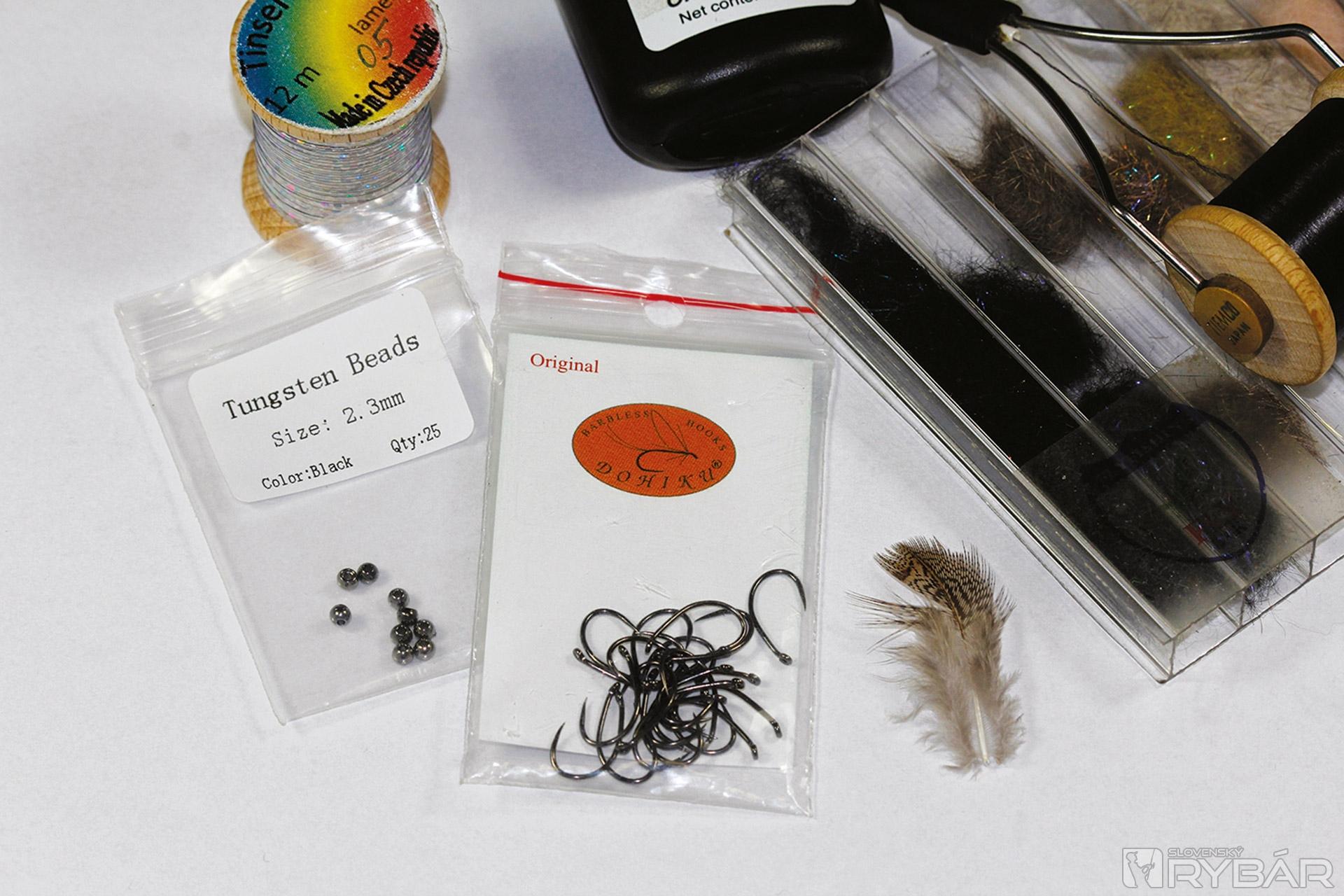 nymfový háčik, čierna volfrámová guľôčka, tmavá viazacia niť, pierko z jarabice, strieborná perleťová lametka, UV lak, čierny prírodný dabing.