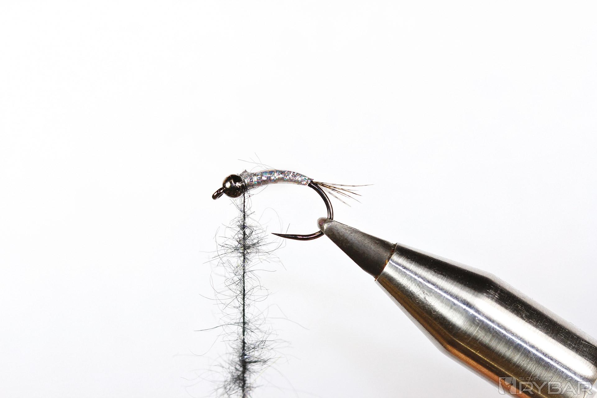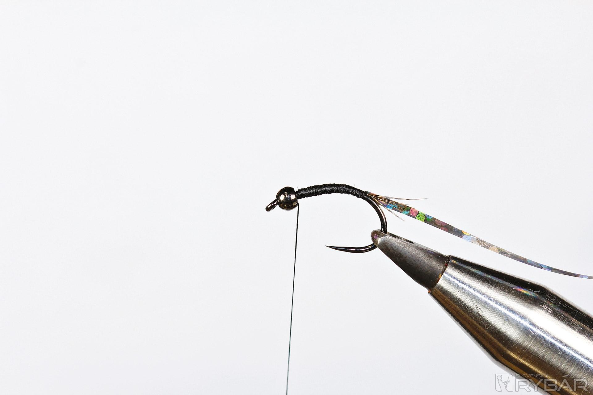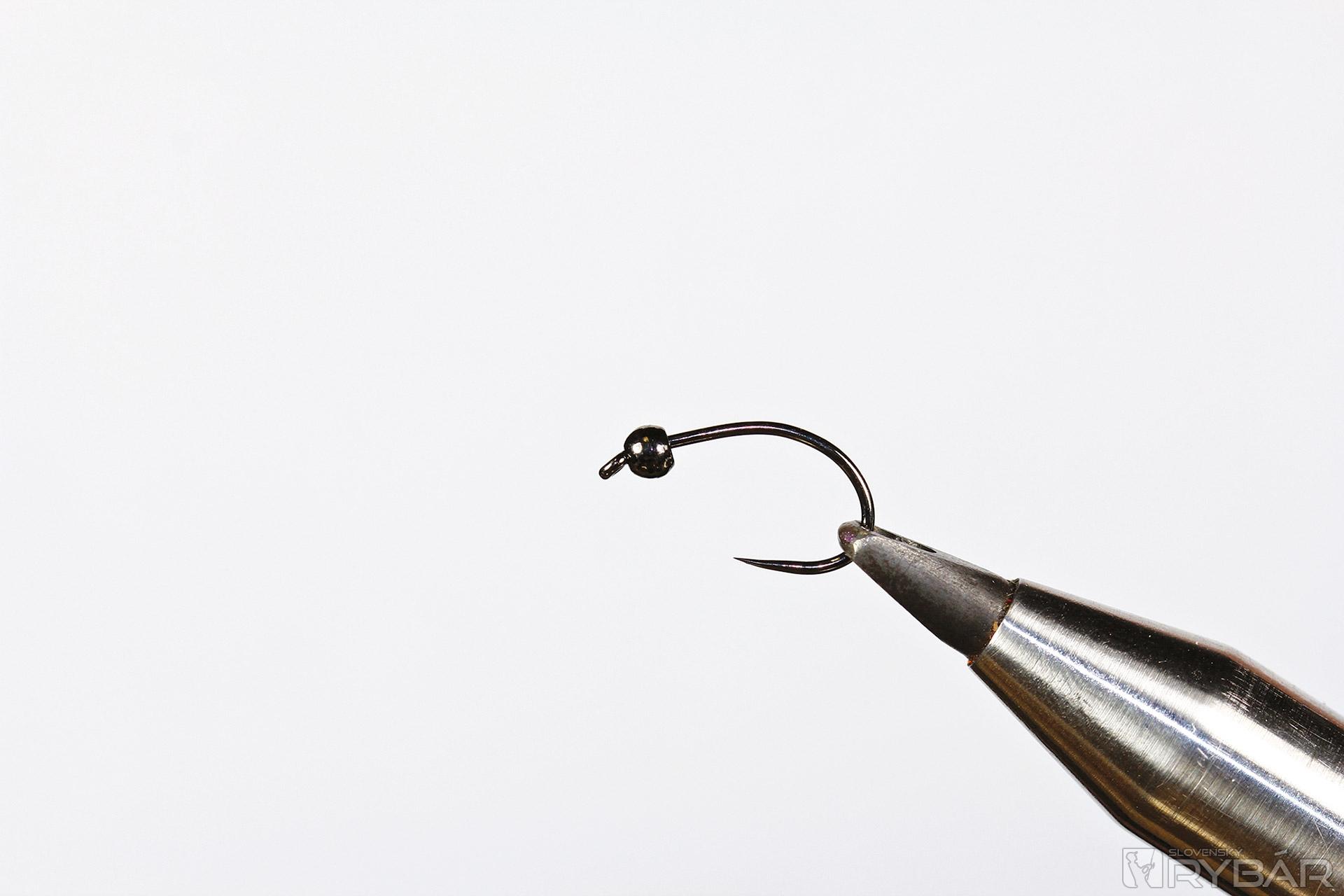 nymfový háčik, čierna volfrámová guľôčka, tmavá viazacia niť, pierko z jarabice, strieborná perleťová lametka, UV lak, čierny prírodný dabing.
