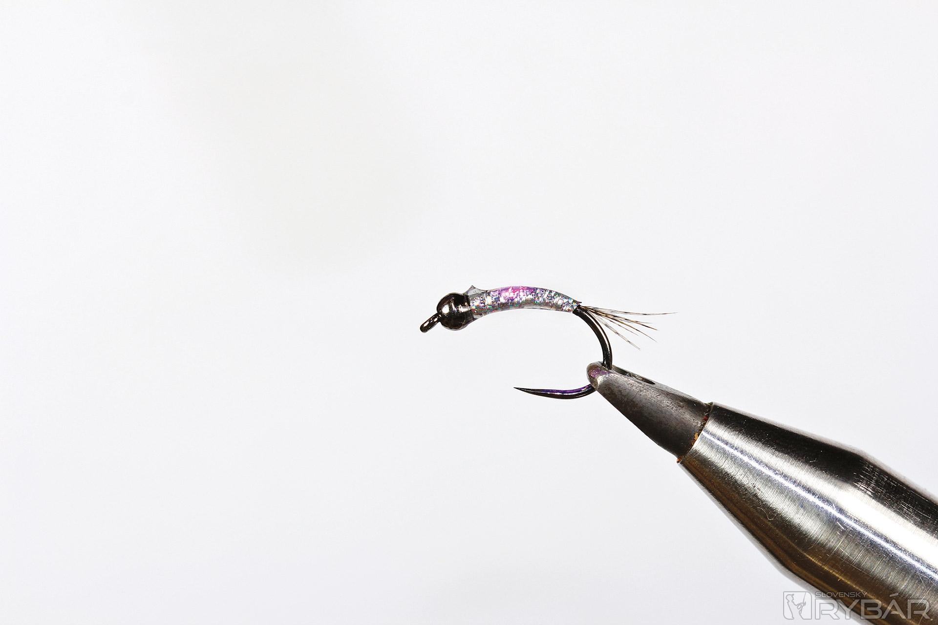 V poslednej dobe som si obľúbil viazanie takýchto perleťových vzorov. Červené, strieborné, zelené, lesklé vzory sú podľa môjho názoru skvelým ozvláštnením škatuľky každého muškára. Plus, s obľubou ich atakujú aj ryby! Ak sa rozhodnete viazať takéto vzory, určite siahnite aj po UV laku. Ich telíčko to veľmi oživí a zvýrazní jeho farbu. Podobne dobrý efekt sa dá dosiahnuť aj pri použití zlatého, alebo strieborného telíčka bez perlete. Takéto vzory je dobré nasadiť, keď sa pri oblačnom počasí z času na čas objaví slniečko. Nymfa sa vtedy zaleskne a nemá konkurenciu. Lovíme na francúzsku, dlhú, ale aj krátku nymfu.