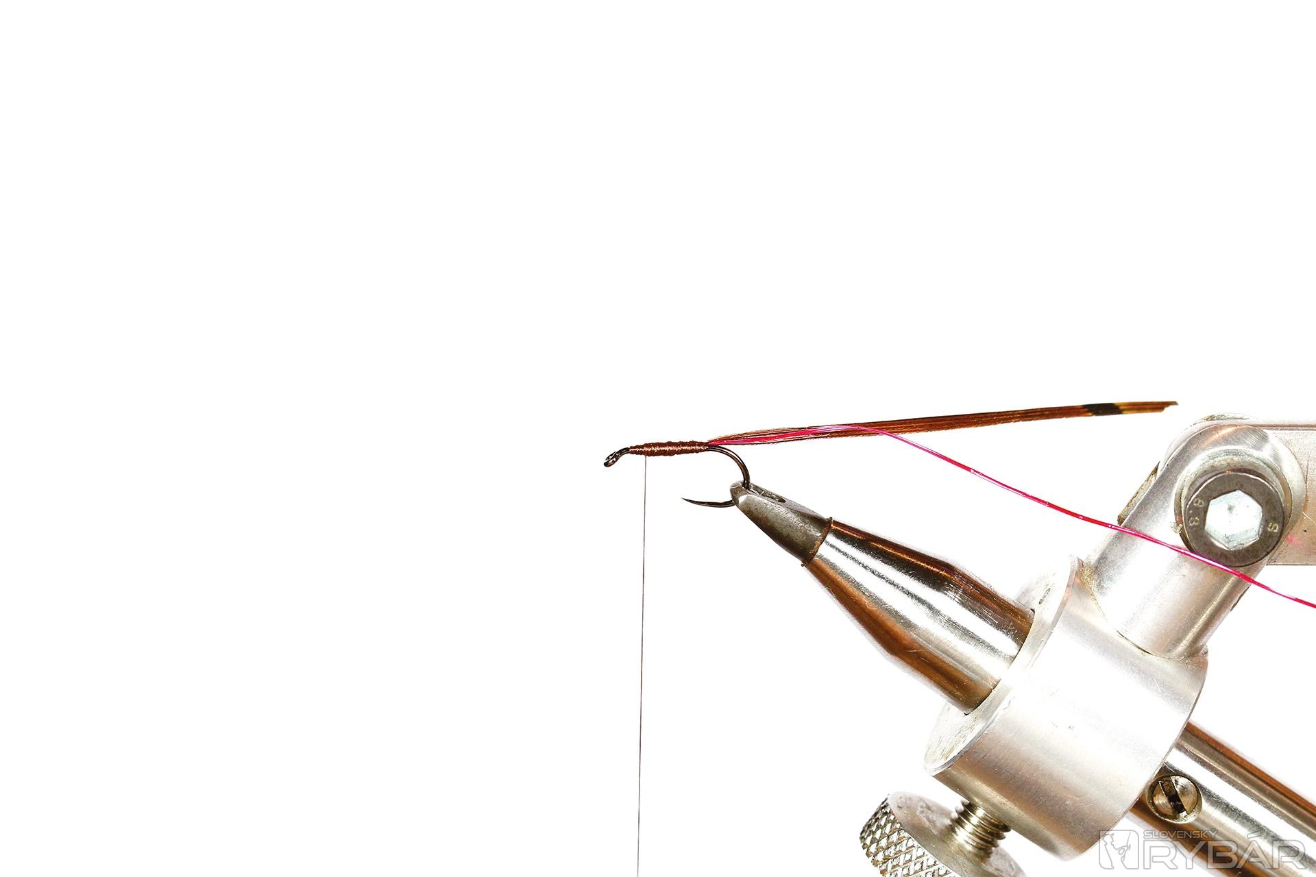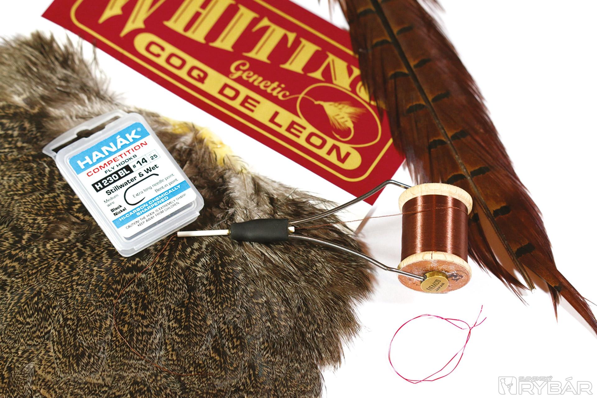mokrý háčik, hnedá viazacia niť, výrez z pera bažanta, fialová UV lametka, pierko zo sliepky Coq de leon.