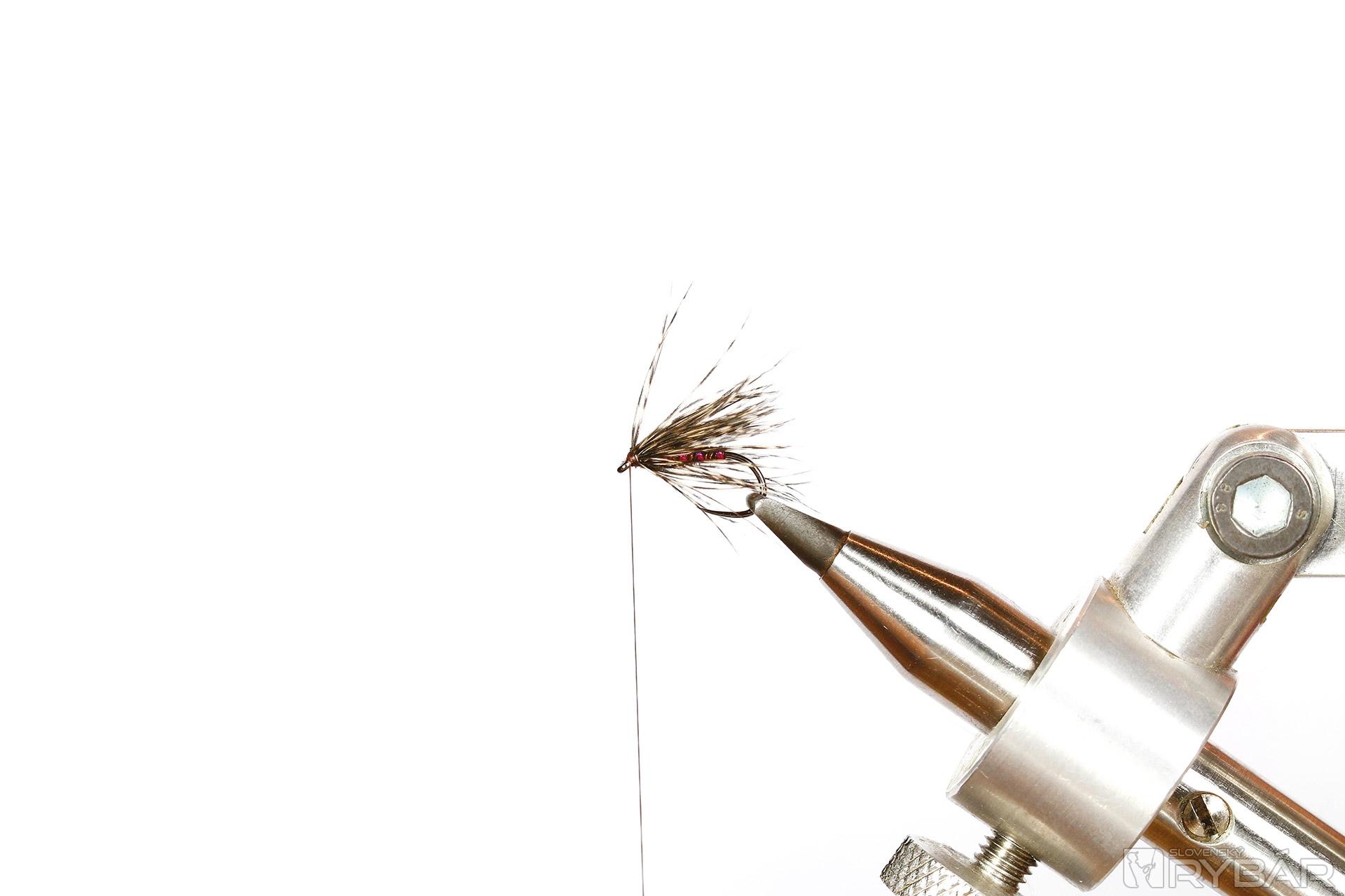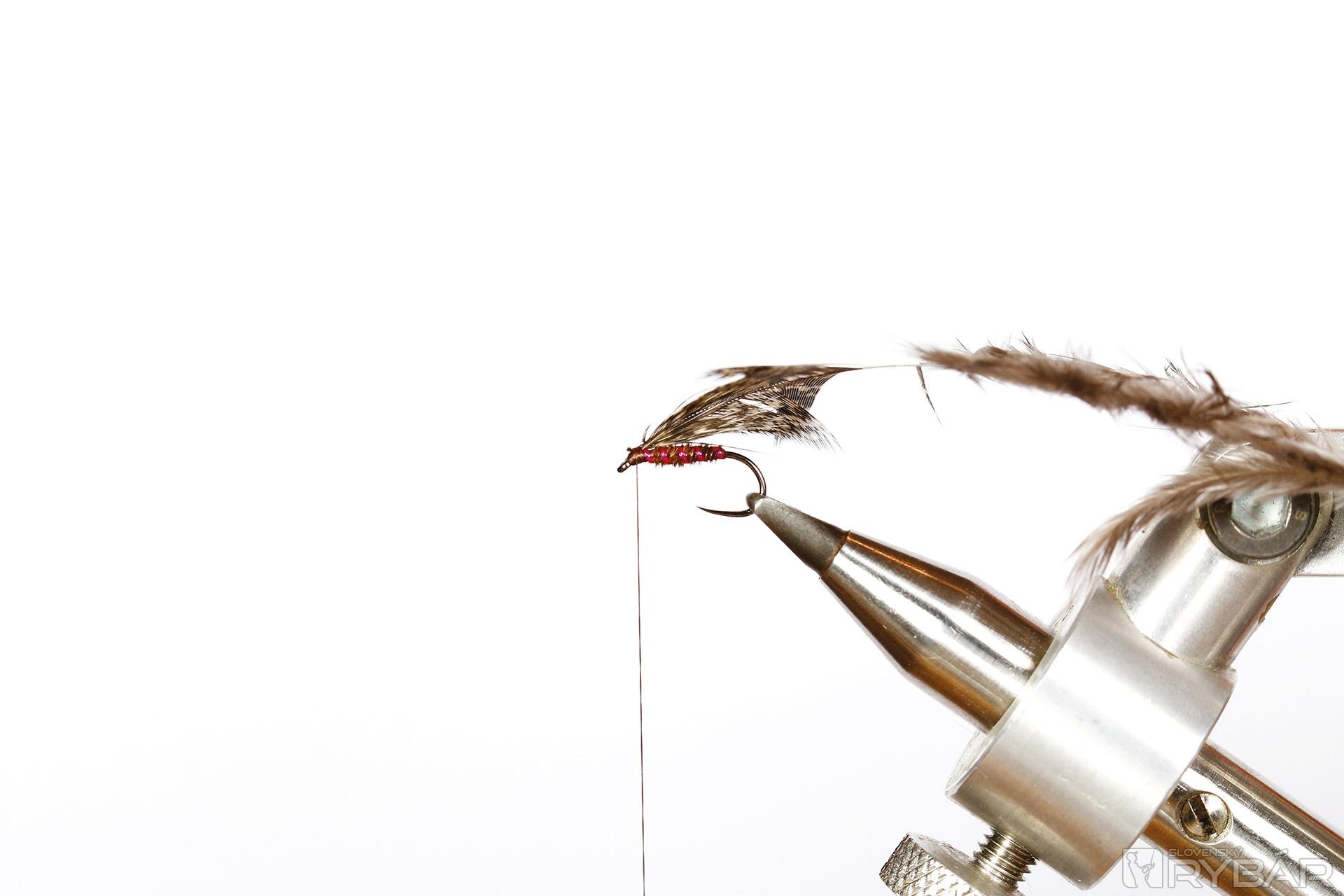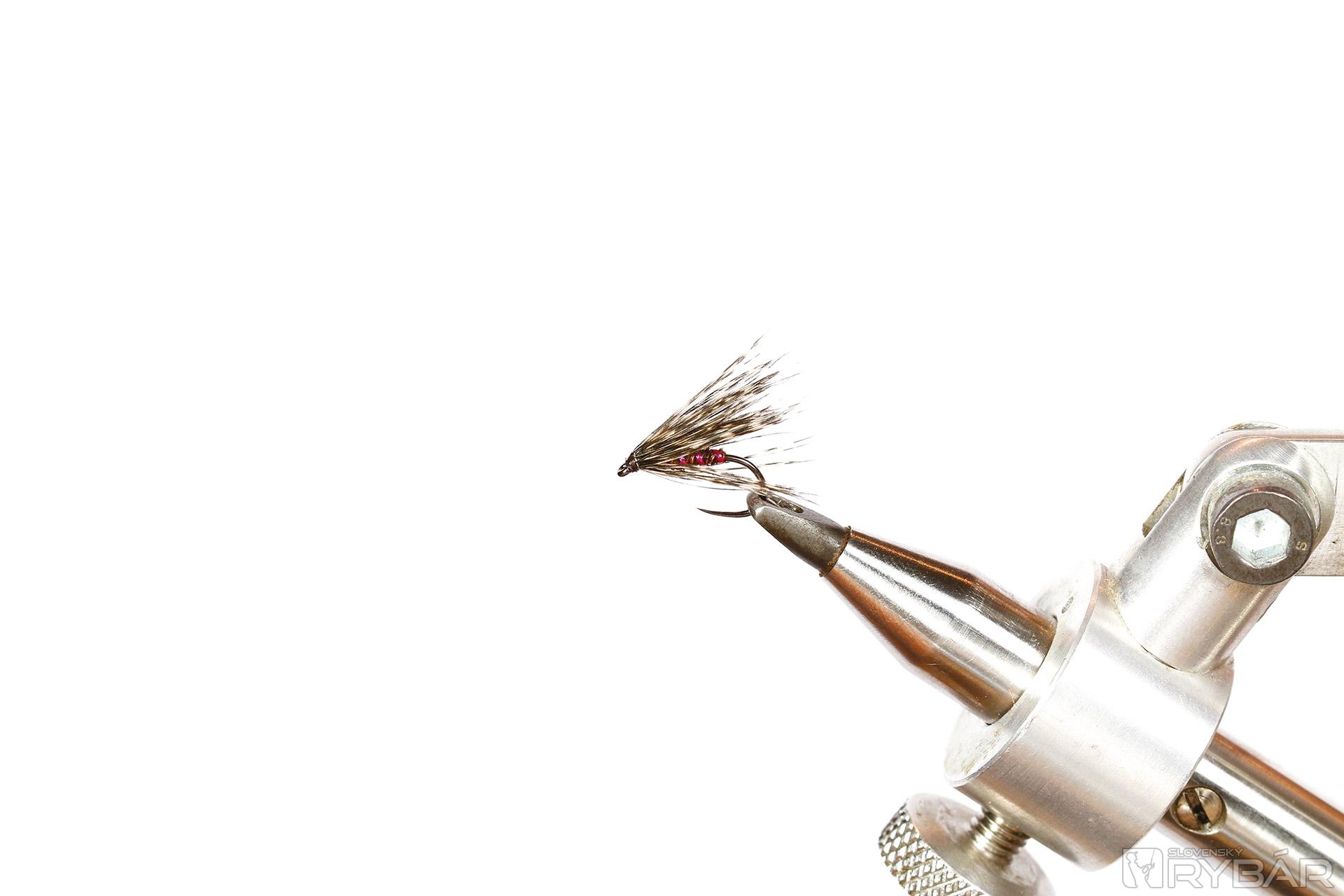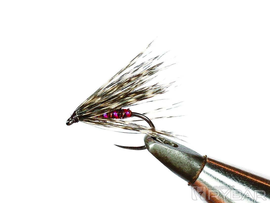 Mokrá muška, ktorú som úspešne používal pri love na rieke, ale aj pri jazernom rybolove na vysadené dúhaky. Fialová UV lametka dáva muške skvelý lesk a perie Coq de leon vo vode dobre pracuje. Pri jej viazaní som zhotovil krídlo, ktoré som urobil odtrhnutím niekoľkých lúčov z pera Coq de leon a nožičky som naviazal z tenkého konca pierka. Celkovo som teda použil iba jedno pierko, teda ušetril som vzácny materiál. Lovím s ňou v kombinácii s nymfičkou, alebo s inou mokrou muškou, často marcovkou.