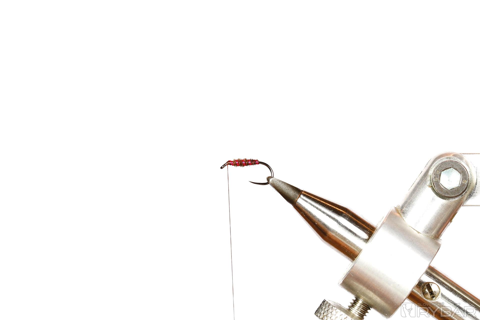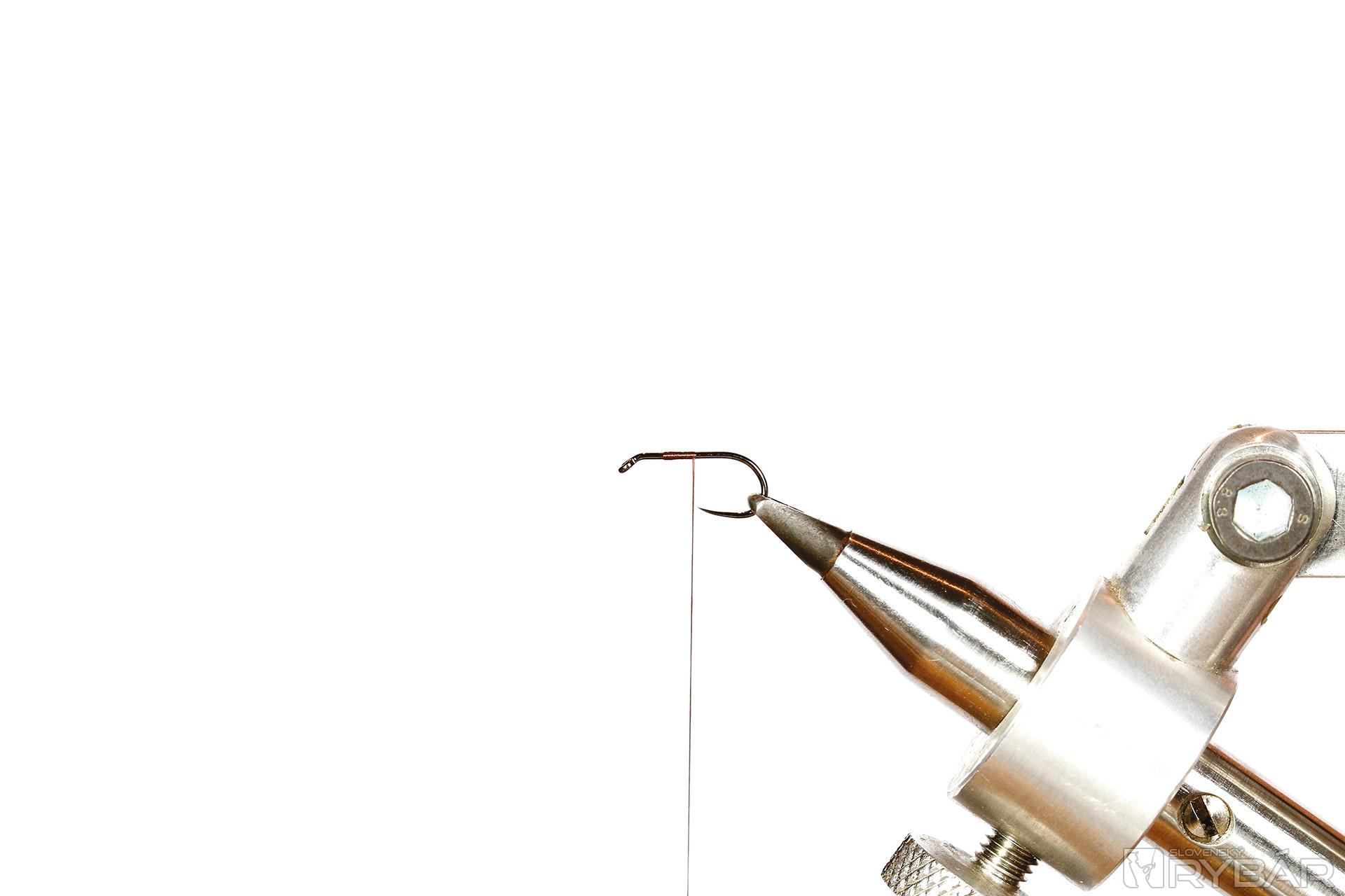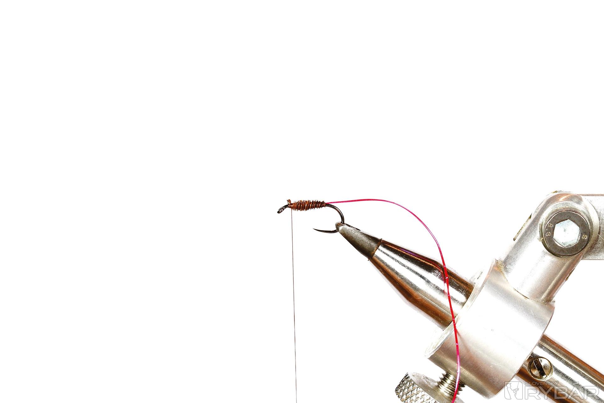 1. Háčik upneme do zveráčika a naviažeme viazaciu niť.