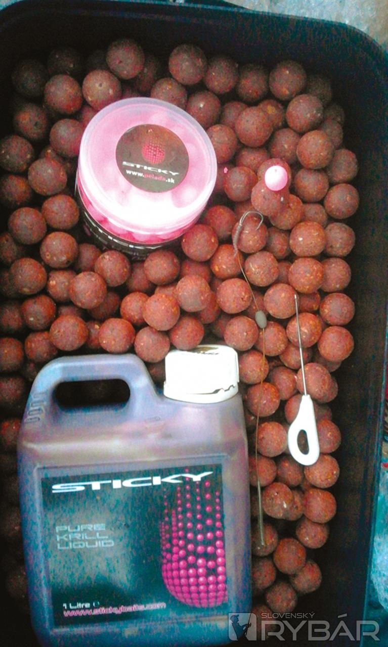 V nástrahách a návnadách som mal na tento rok jasno. Po minuloročnom jesennom testovaní som si už na jar obliekol tričko vo farbách Sticky baits. Majo Sysko, výhradný dovozca tejto značky na SR, mi dal možnosť byť súčasťou šikovného tímu Stickybaits na Slovensku. Nebolo o čom premýšľať a v apríli som už hájil ich farby na prvých pretekoch. Boilies, pelety a rôzne zálievky fungovali bezchybne, a tak som sa rozhodol potiahnuť s nimi celú sezónu. Čo sa týka značky samotnej, ide o firmu s viac ako 15-ročnou tradíciou vo výrobe nástrah a návnad. Táto firma nechŕli jednu novinku za druhou a keď už pustí niečo do predaja, predchádza tomu dlhodobé skúšanie a testovanie. Myslím, že v súčasnosti majú 5 druhov boilies, čiže kaprár si nemusí lámať hlavu nad desiatkami príchutí v rôznych radoch. Nedá mi nespomenúť ich kvalitné tekuté potravy ako Krill liquid, Bloodworm liquid alebo legendárne L‑ZERO-30 a taktiež perfektné popky v rôznych farbách a príchutiach. Pre svoj lov na Domaši som si zvolil 3 druhy boilies – fenomenálny The Krill, originálnu Bloodworm a arašidovú Manillu. The Krill je boilies na báze kvalitných rybích múčok, extraktov z kôrovcov, kreviet a predovšetkým krillu. Nachádza sa tam veľké množstvo čistej krillovej múčky, hydrolyzovaného krillového extraktu a čerstvého krillu. Táto nástraha je najobľúbenejšou medzi známymi kaprármi z Anglicka a bol by hriech ju neskúsiť aj tu. Bloodworm (patentku) som vybral z jedného racionálneho dôvodu. Plánoval som chytať pri prítoku na bahnitom dne v blízkosti prekážok. Je známe, že patentky patria medzi obľúbenú potravu kaprov, ktoré veľmi rady prerývajú dno, aby ju našli. Toto boilies obsahuje popri rybích múčkach, rôznych živočíšnych extraktoch a Robin Rede kvalitný patentkový koncentrát so skutočnými kúskami patentky. Čo viac si môže kapor priať? Do tretice všetko dobré. Mojím esom v rukáve bola tohtoročná novinka Manilla. Manilla je odlišná od všetkých doterajších boilies. Na kaprársky trh prišla ako niečo nové. Neobsahuje ani stopu po rybích múčkach alebo živočíšnych produktoch. Jej unikát spočíva v použití odtučneného arašidového proteínu a pravej vanilky z Madagaskaru v kombinácii s kvalitnými mliečnymi proteínmi a vtáčími zobmi. Ako sa nakoniec ukázalo, keď som sa chcel aspoň trochu vyspať, nesmel som Manillu našívať pod háčik.