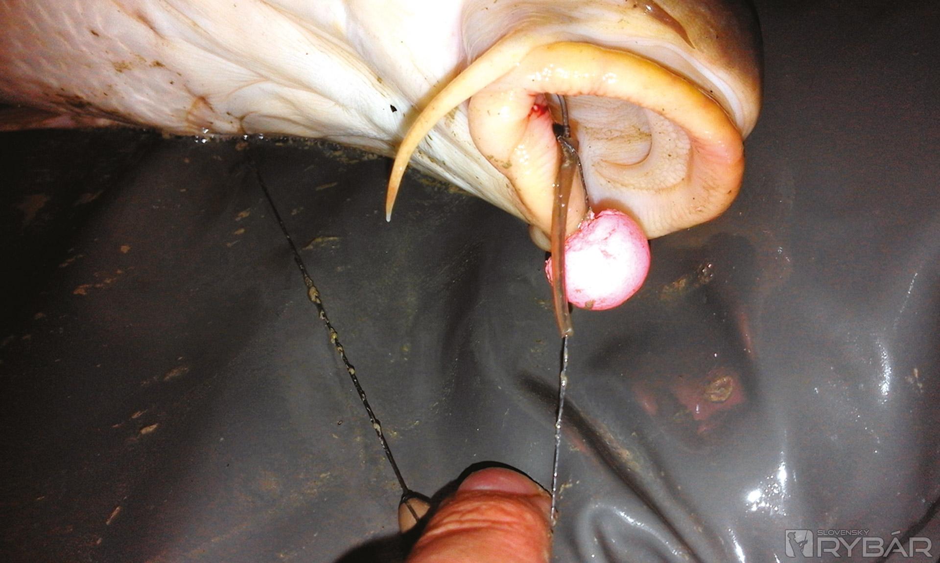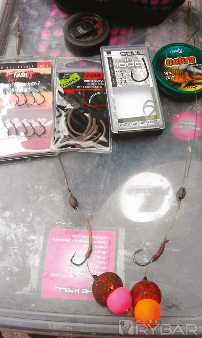Ani na vode s výskytom malej ryby netreba nič podceňovať. Nikdy nevieme, čo sa nám podarí zapnúť na háčik. Podmienkou je pevný šokový silón. Mojím favoritom je kónický neviditeľný šokový silón Katran Galaxy. Naväzujem ho ako 0,26 mm a končím na 0,57 mm. Na zabahnených vodách je lepšie používať olovo na závesnom klipe namiesto inline olova. Hmotnosť olova volím podľa diaľky vyvážky. Najčastejšie je to od 130 do 170 g. Na samotné nadväzce používam 20,25 lb stužené šnúrky. Cobra a Captura ma ešte nesklamali. Osvedčili sa mi dlhšie nadväzce okolo 35 cm. Pokiaľ ide o háčiky, tak tam som toho už naozaj dosť vyskúšal. Tento rok som si vybral moje stálice v podobe SOUL RSH 1000 č. 4 a Nash FANG TWISTER č. 7. RSH‑čko 1000 má tvar orlieho pazúra a vyniká perfektnou ostrosťou a pevnosťou. Najčastejšie ho viažem s malým mouthsnagrom. TWISTER je zase veľmi ľahký a vďaka rovnému ultra ostrému hrotu krásne zaparkuje do kaprej papuľky. Jeho hranatý tvar znemožňuje rybe ho vypľuť. Tento háčik je priam ako stvorený pre moju montáž Whitypool bottom bait rig. S whitypool rovnátkom vytvára agresívny uhol a ryba sa ho po nasatí háčika nevie zbaviť.