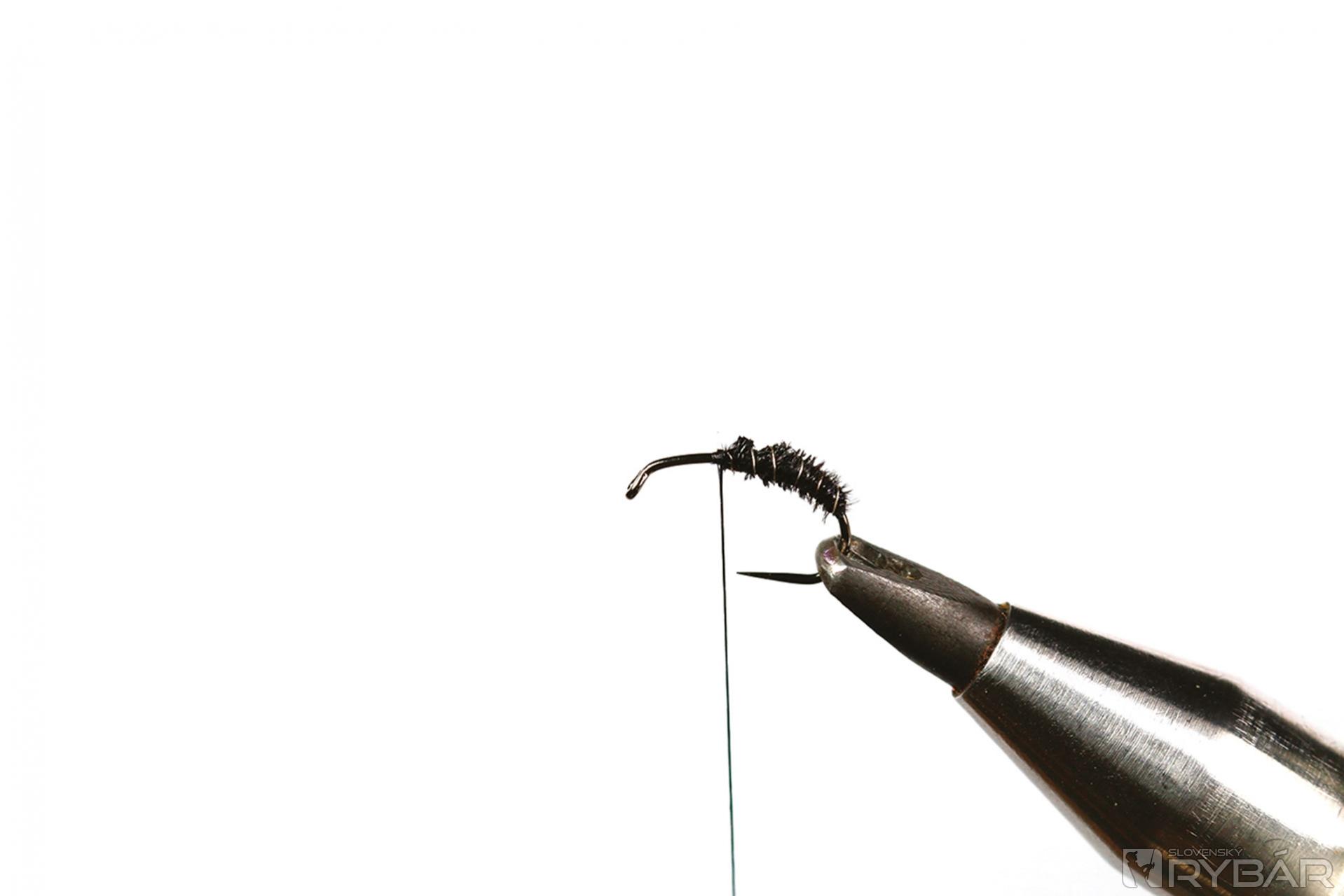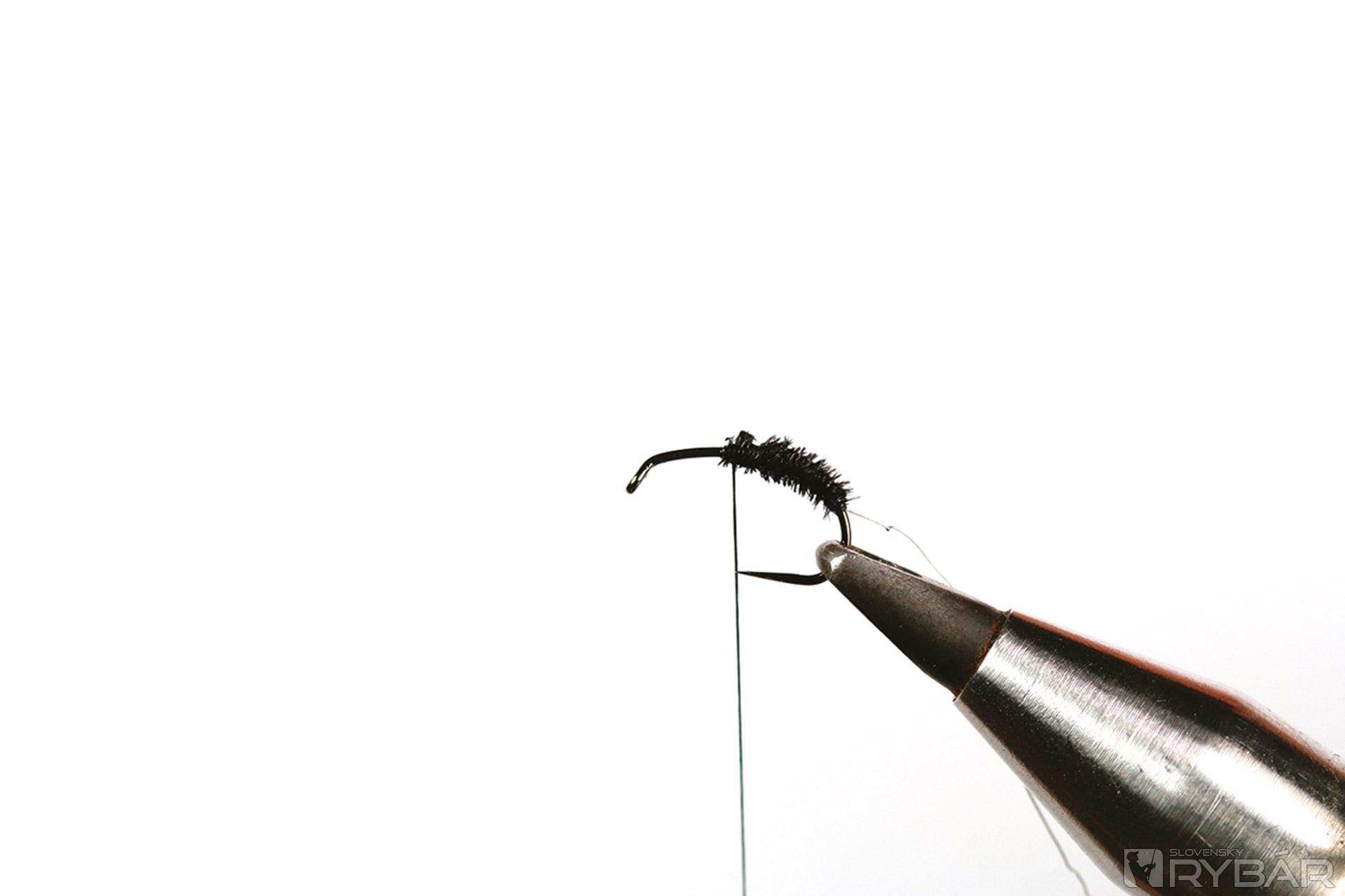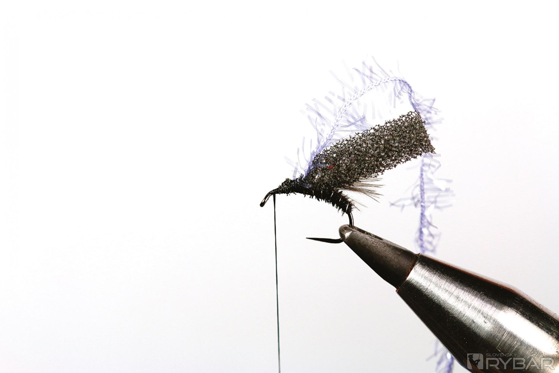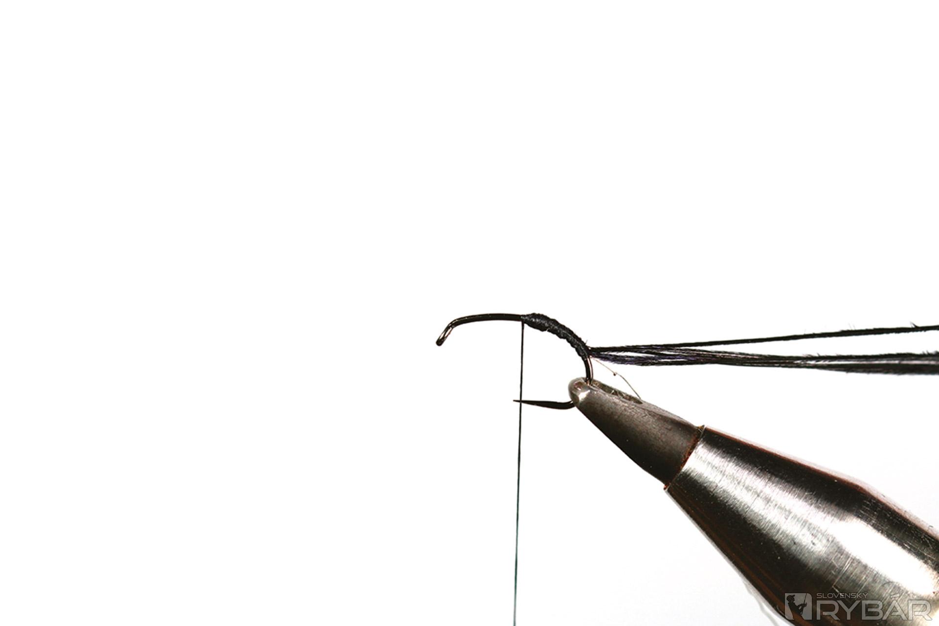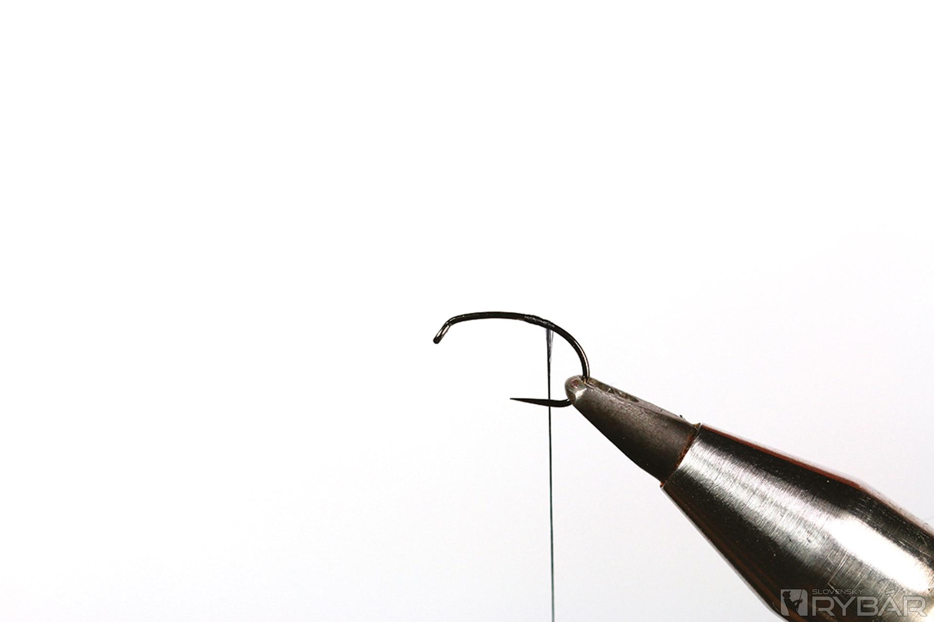 1. Do zveráčika si upevníme háčik a naviažeme viazaciu niť.