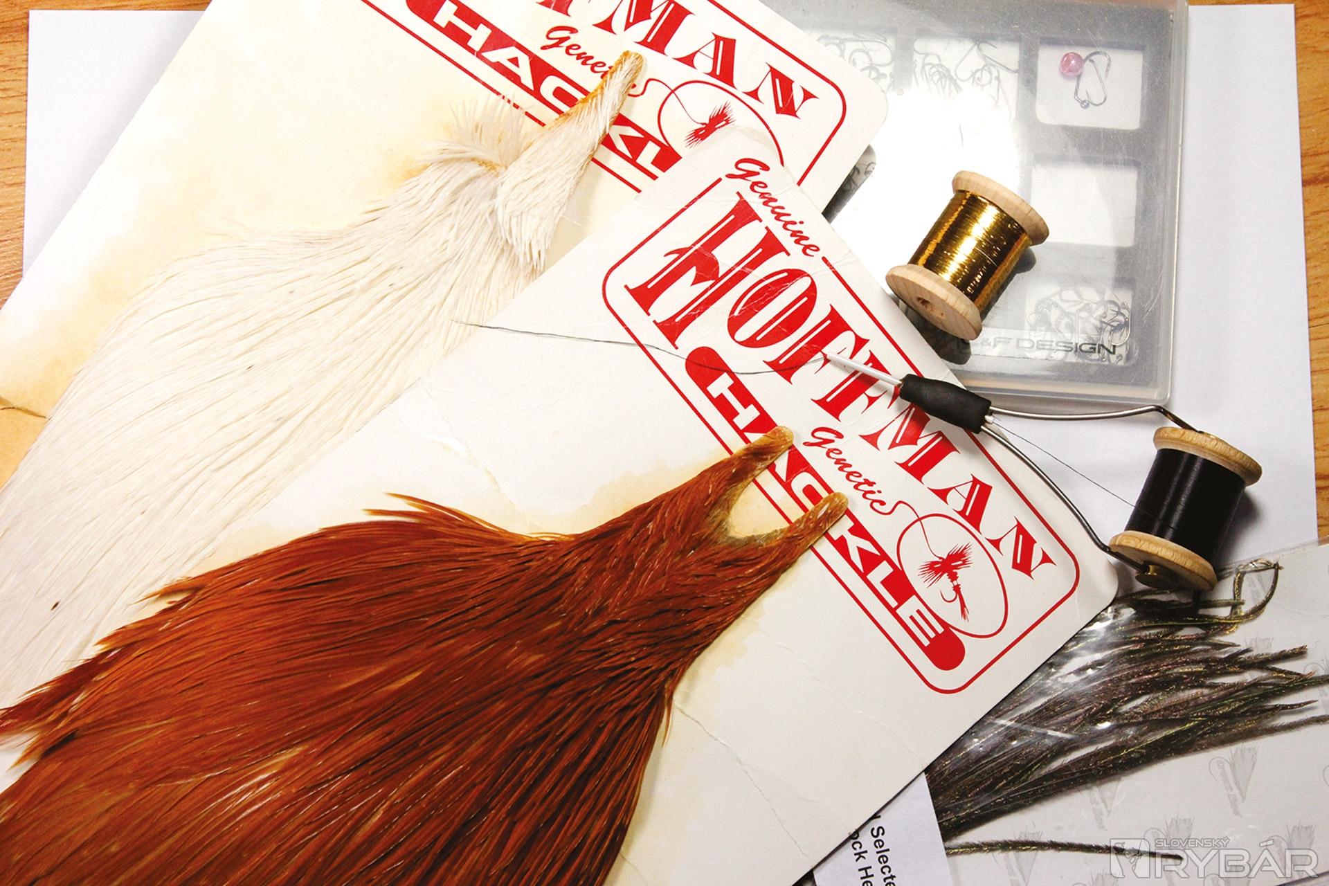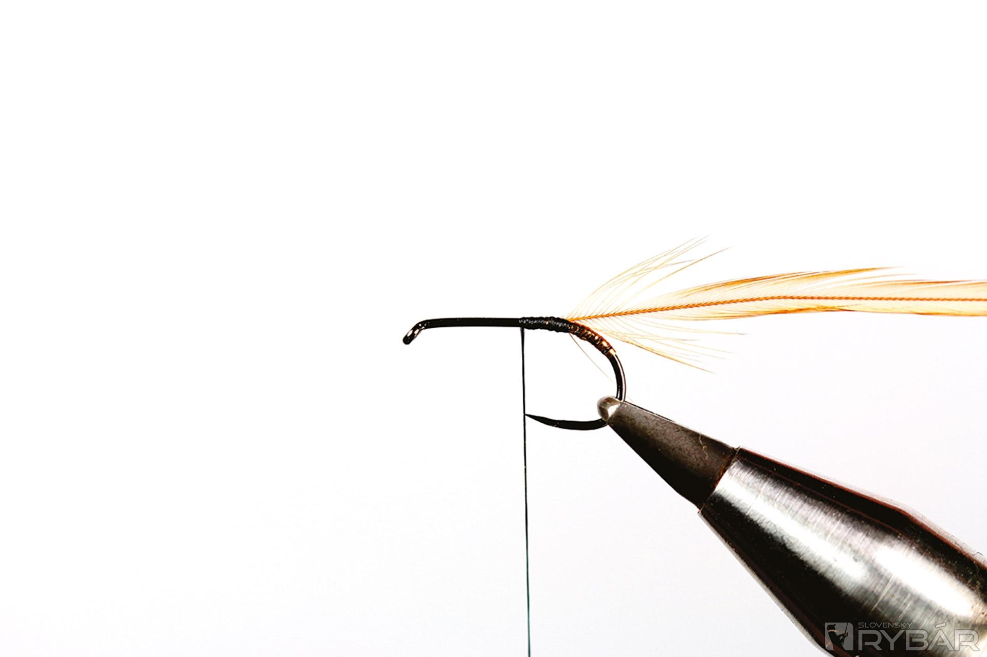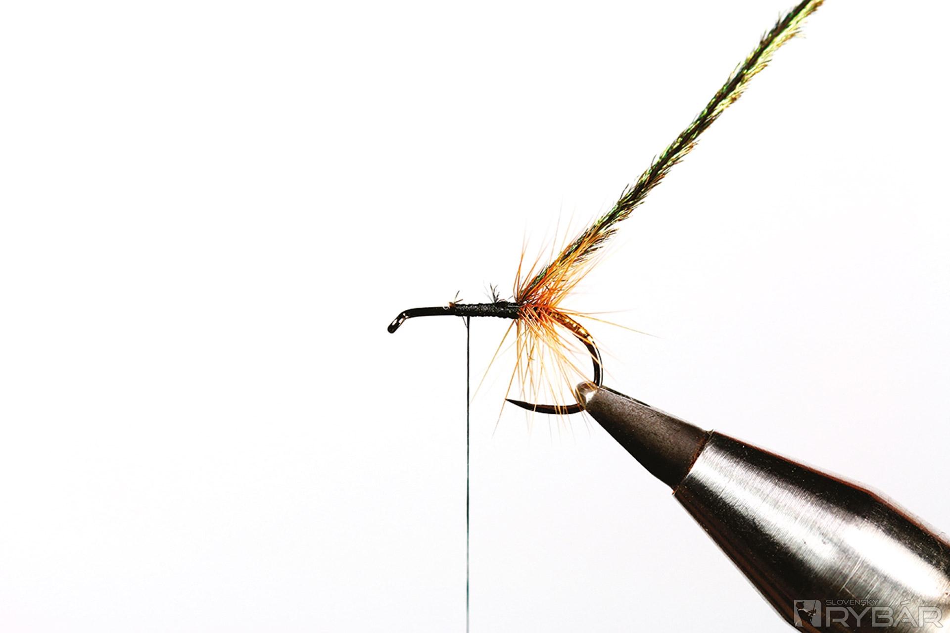 suchý háčik, čierna viazacia niť, zlatá lametka, hrdzavé pierko z kohúta, pero páva, biele pierko z kohúta.