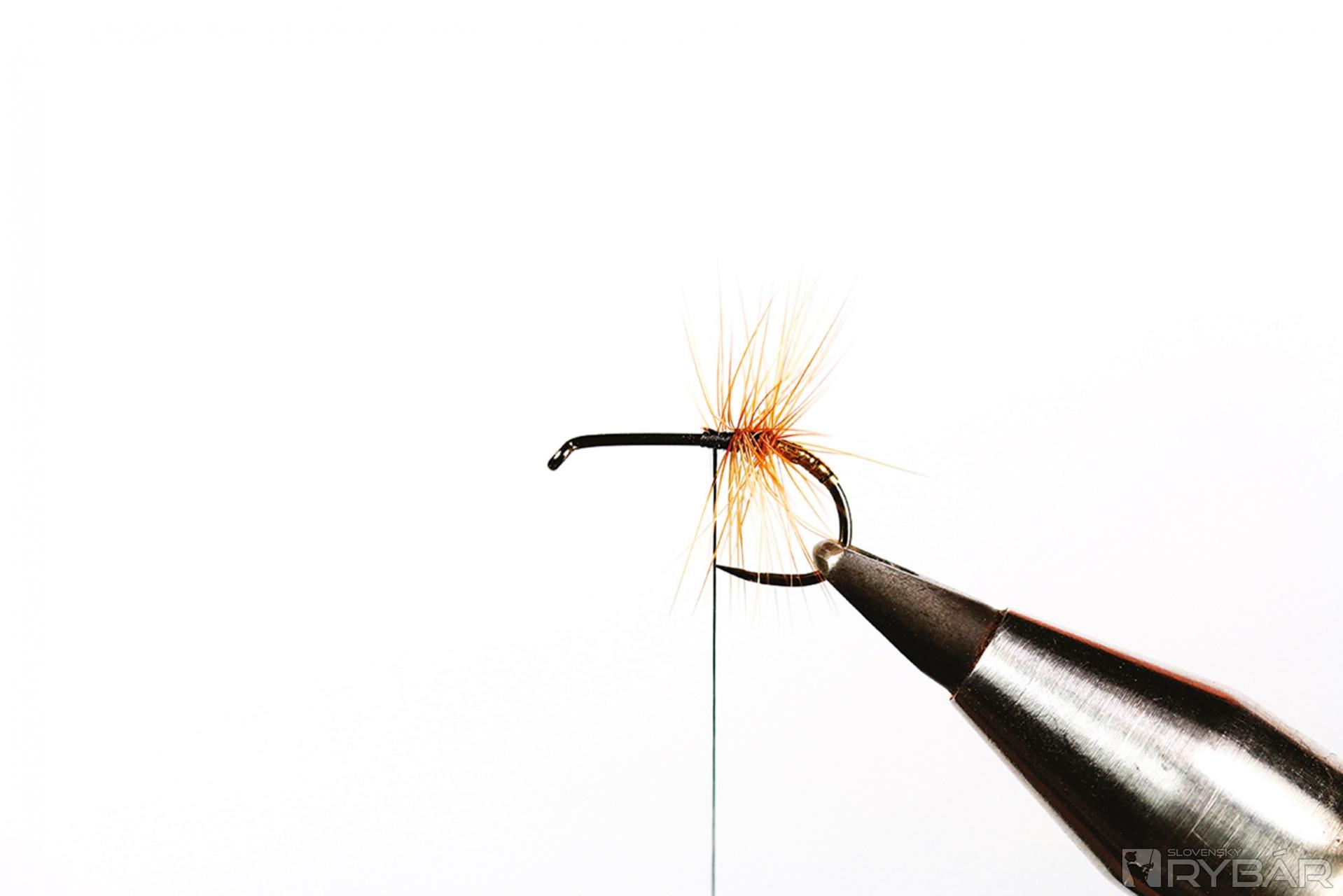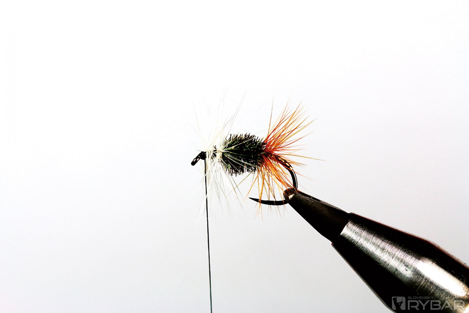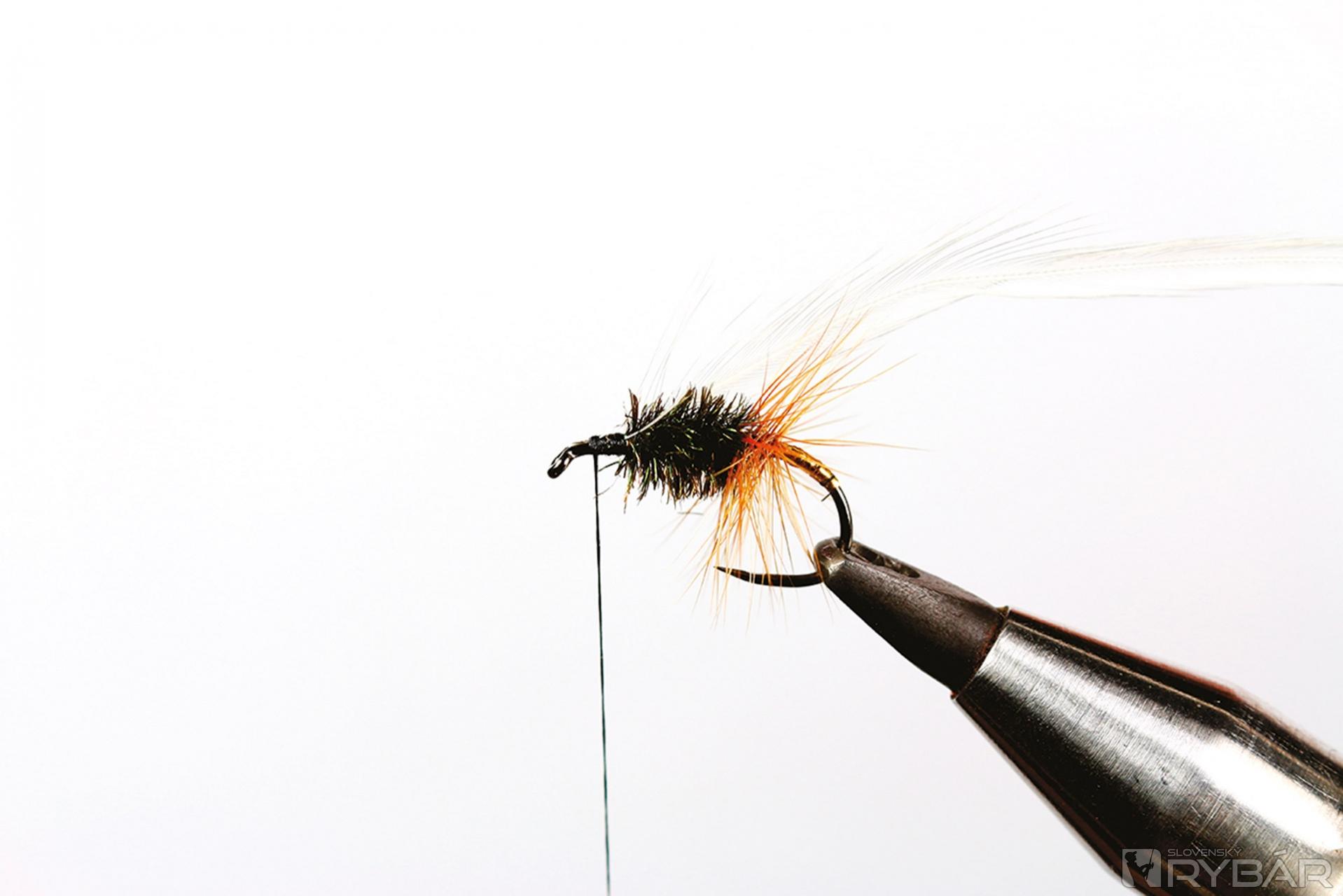 suchý háčik, čierna viazacia niť, zlatá lametka, hrdzavé pierko z kohúta, pero páva, biele pierko z kohúta.
