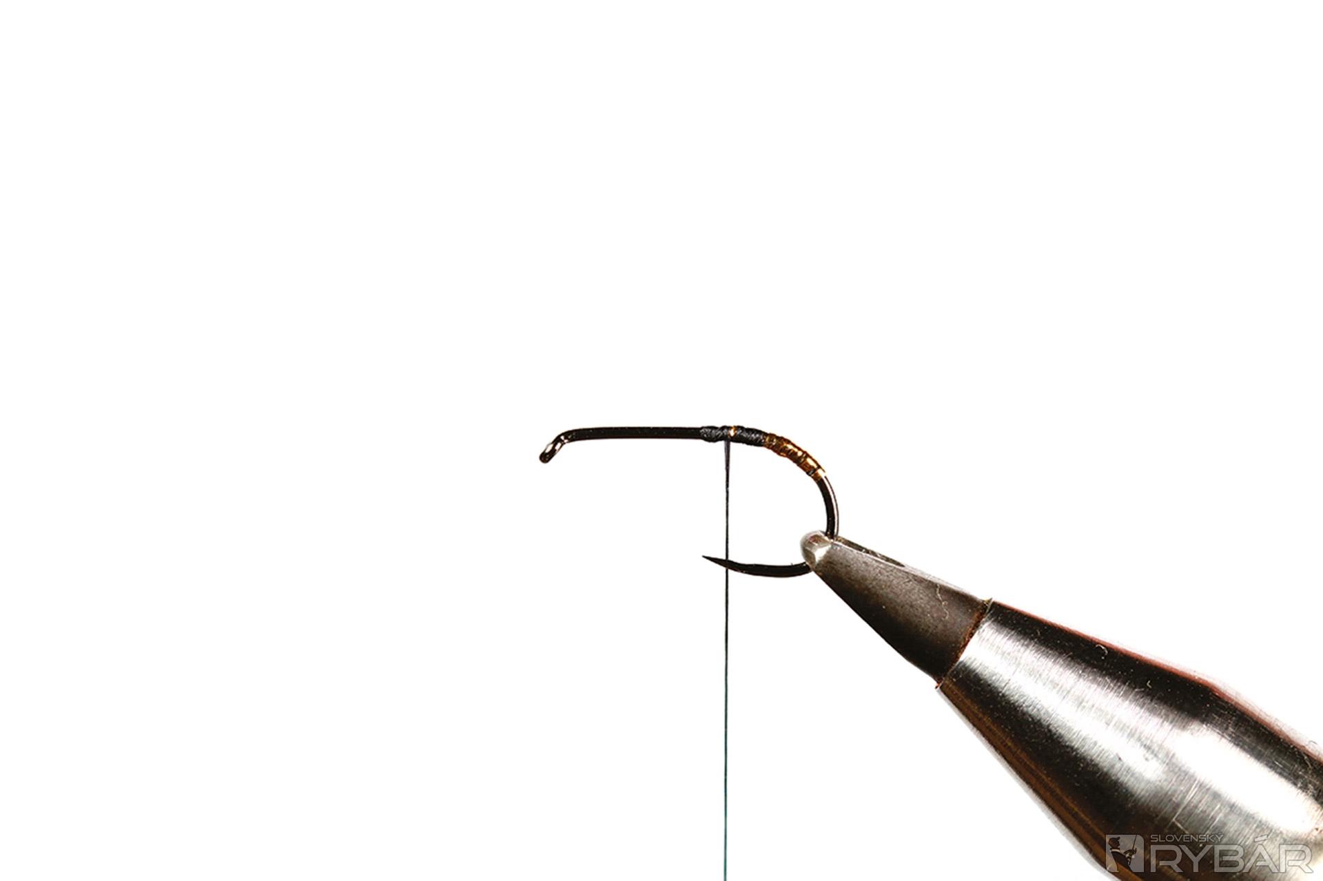 1. Háčik upneme do zveráčika a naviažeme viazaciu niť. Pridáme zlatú lametku.