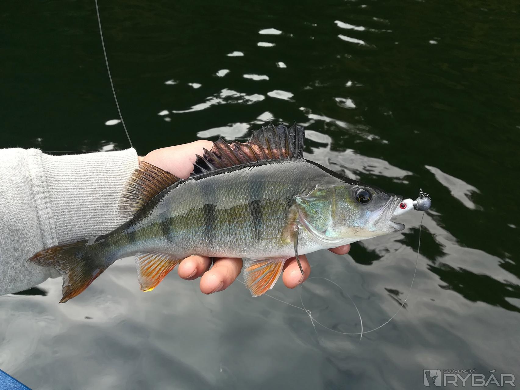 Ten neskôr aj zapíname, pripravení skúsiť šťastie pri dne. Voda má 14 – 15 stupňov. Hľadám zlomy, miesta podobné akoby schodom, zatopené stromy, skrátka všetko, čo môže dravcom slúžiť ako úkryt. Aj ja som už presedlal na menšie nástrahy, no a úspech na seba nedá dlho čakať. Prvý záber je od potopeného stromu, útok ostrieža, ten dá riadnu pecku, druhý ho nasleduje v snahe ukradnúť mu sústo. Krásne stavaného zježeného bojovníka rýchlo podoberám aby sa nevypol. Ku 40 cm mu až tak veľa nechýba, robí jedno foto vo vode v podberáku a kým sa chystá druhá fotka, ostrieža niet. Najprv si myslíme že vyskočil, ale keď vytiahnem podberák, usmieva sa na nás krásna diera. Paráda. Menšia prestávka, priúčame sa krajčírskemu remeslu, Filip provizórne zašíva fluorokarbónom nešťastnú dieru v sieti.