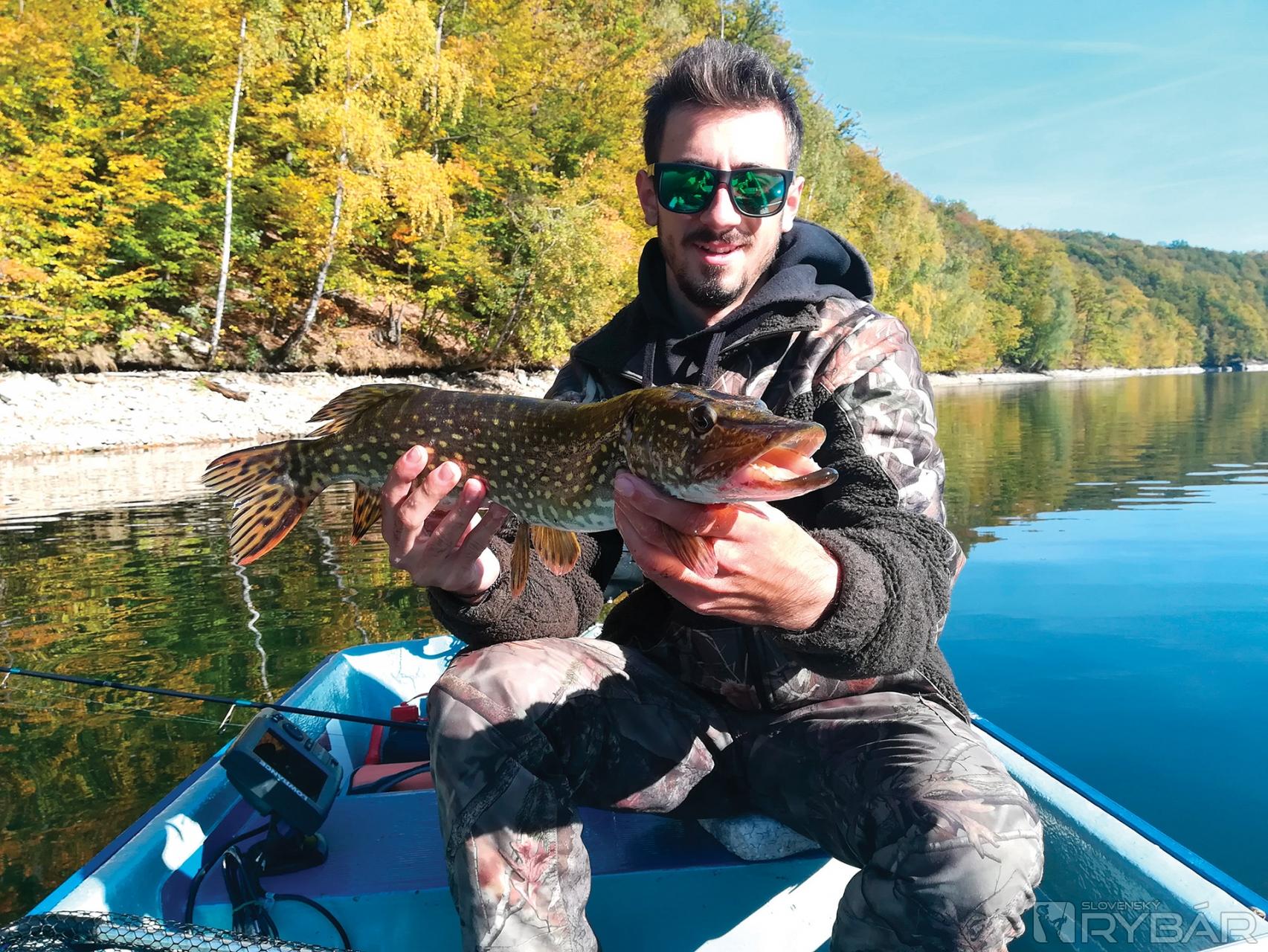 Stromy žiaria farbami a ja si tento pohľad vychutnávam, keď sa plavíme popri brehoch a testujeme úspešnosť trollingu. Kamarát v priebehu 5 minút takto uloví ďalšie dva bolene, okolo 50 cm. Krásne rany do prúta, keď sa monotónny kmit a vibrácia špičky zmení na kopanec. Na mňa doľahlo šťukové šialenstvo, a tak nerobím nič iné, iba hádžem do zaujímavých miest pri brehoch veľké voblery a očakávam útok. Ten sa aj dostavil a prvá šťuka výpravy je tu! Mieru síce nemá, je niečo pod, ale radosť obrovská, navyše sfarbenie tak isto v štýle jesene.