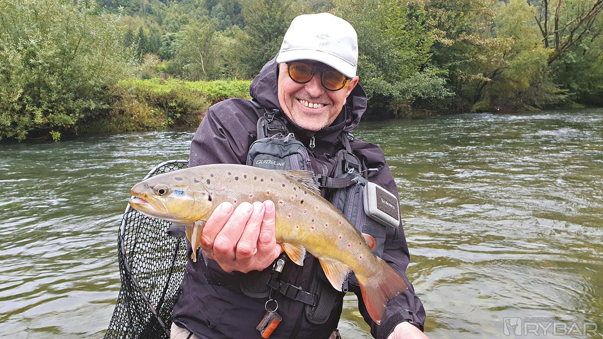 Po desiatich minútach volá Peter, že vidí niekoľko krásnych lipňov a jedného velikánskeho pstruha v malej jamke pri brehu. „Neboj sa a skús, čo som ti včera ukazoval a len pozoruj, či sa ryba pohne. Ak áno, hneď sekaj,“ narýchlo som mu ešte vysvetlil, čo má robiť. Pozorujem ho, ako sa mu darí, a zrazu Peter prudko zasekáva a kričí, že je tam! Ale nie lipeň, lež ten obrovský potočák. Rýchlo balím prút a ponáhľam sa za ním na pomoc. Pstruh chvíľu stojí a Peter s ním nemôže ani pohnúť. Zrazu ryba vyrazila neuveriteľnou rýchlosťou a uteká takmer až na podkladnú šnúru. Z navijaka strieka voda, ako pstruh rýchlo odvíja šnúru. Postupne sa k nemu približujeme až na vzdialenosť 5 m. Krásne ho vidíme a odhadujeme 60 cm plus. Ťažký, silný súboj pokračuje niekoľko minút, keď sa zrazu pstruh opäť rozhodol vyraziť zo všetkých síl. Peter nestihol povoliť a malá nymfa sa pstruhovi vyrezala z tlamky… Smutný, ale predsa šťastný Peter len povedal: „Vyhral, bol lepší. Ideme na panáka na breh, to musím rozdýchať.“
