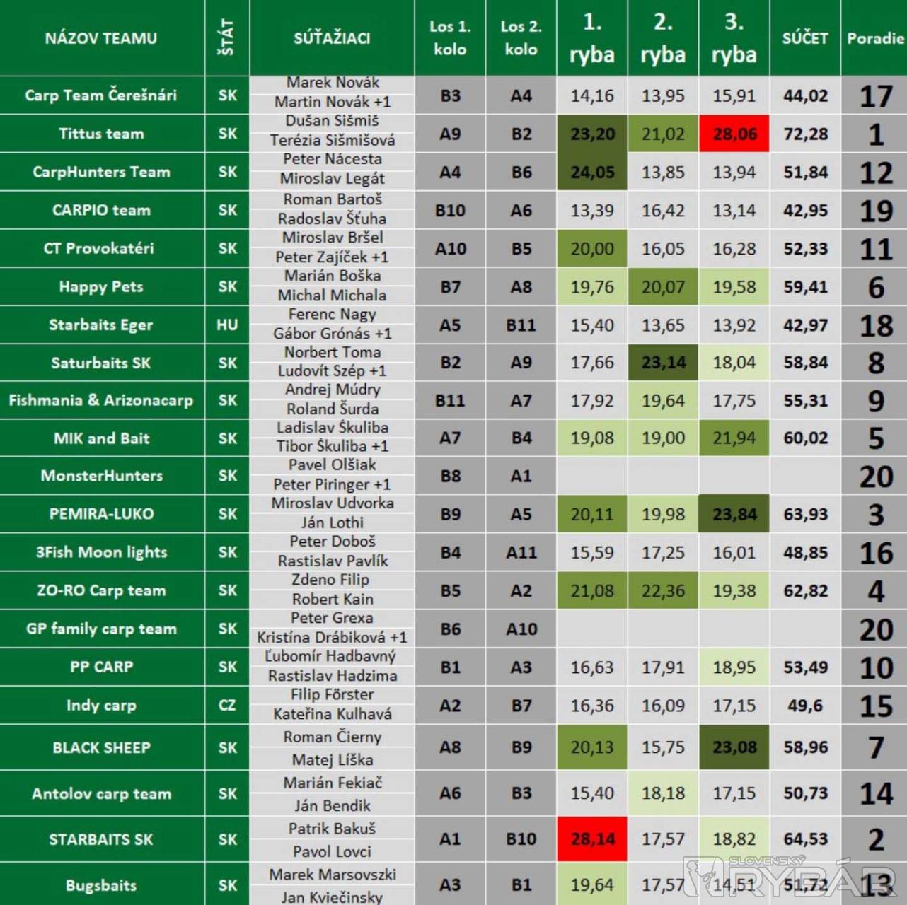 A tak to aj zostalo. Do konca pretekov už na najvyšších priečkach nedošlo k ďalším posunom a poradie v prvej trojke sa ustálilo takto: 1. miesto – TITTUS TEAM (Dušan Šišmiš, Terézia Šišmišová), 2. miesto – STARBAITS SK (Patrik Bakuš, Pavol Lovci) a 3. miesto – PEMIRA-LUKO (Miroslav Udvorka, Ján Lothi). Cenu za najväčšiu rybu si odniesol Patrik Bakuš (STARBAITS SK) za rybu 28,14 kg, cenu za najväčšieho šupináča získal TITTUS TEAM s Dušanovým 28,06 kg kaprom a najväčšieho lysca s hmotnosťou 21,08 kg chytili chalani z tímu ZO-RO.