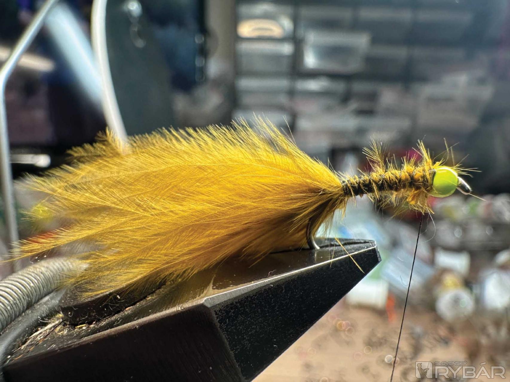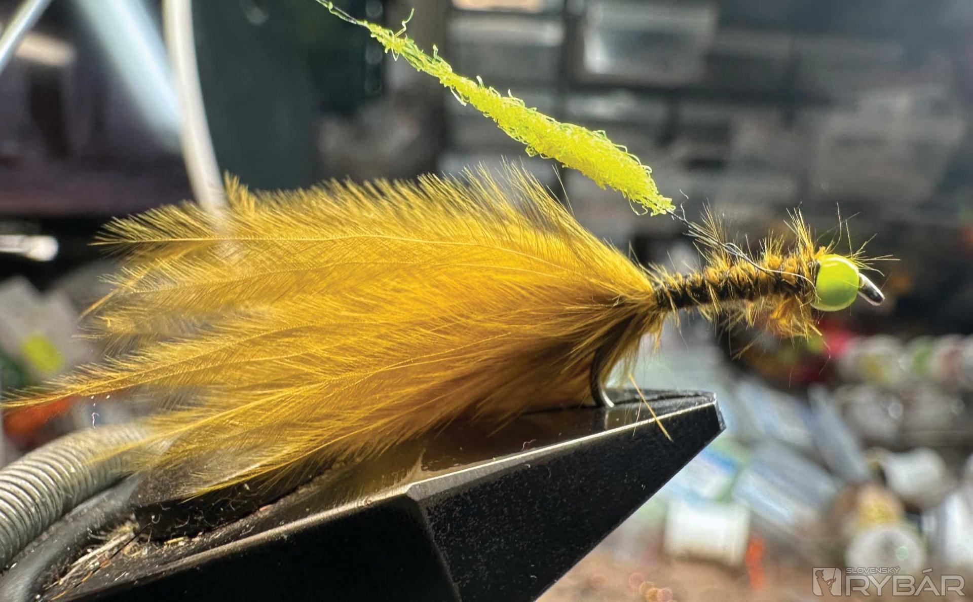 5. Na niť prichytíme žltý spectra dubbing a dvoma ovinmi vytvoríme typ.
