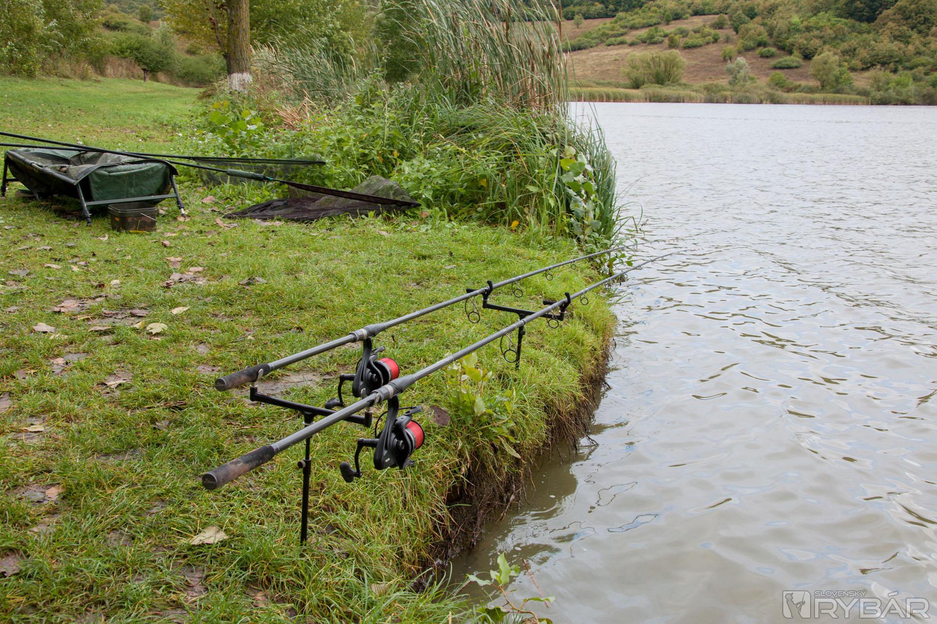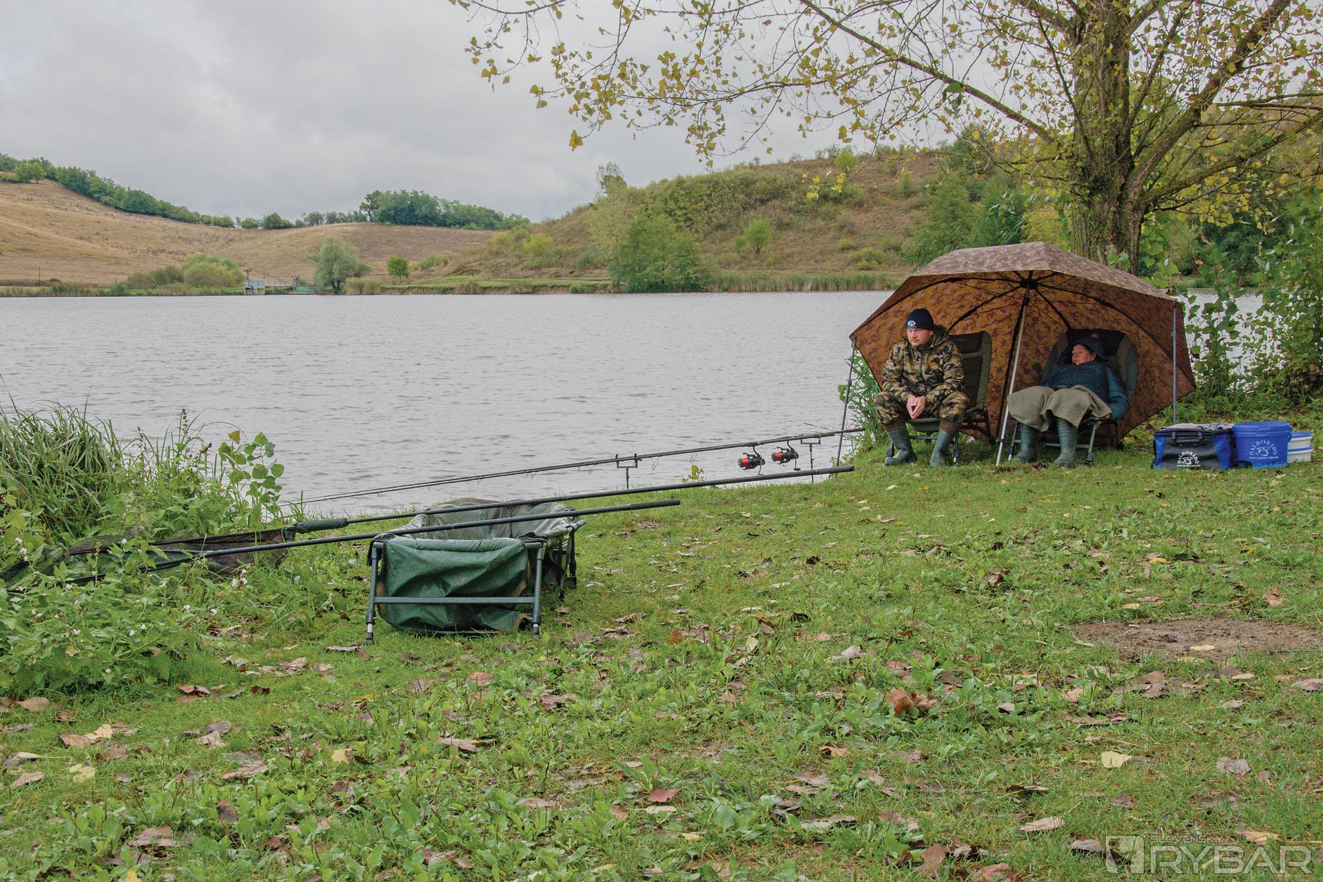 Predpokladal som, že pri vode bude iba minimum rybárov, a tak aj bolo. V blízkosti hrádze bol jeden rybár a na konci jazera boli dva karavany, preto som sa rozhodol prejsť na druhú stranu jazera, kde nebol ani jeden rybár. Vybral som si miesto približne v strede jazera, kde je hlbšia voda. Zaparkoval som autom asi 10 metrov od vody, z auta som najprv vybral veľký 3-metrový dáždnik, pod dáždnik som si dal rybárske kreslo, všetky svoje veci som poukladal tak, aby som ich mal poruke a aby nezmokli, ak by sa rozpršalo.