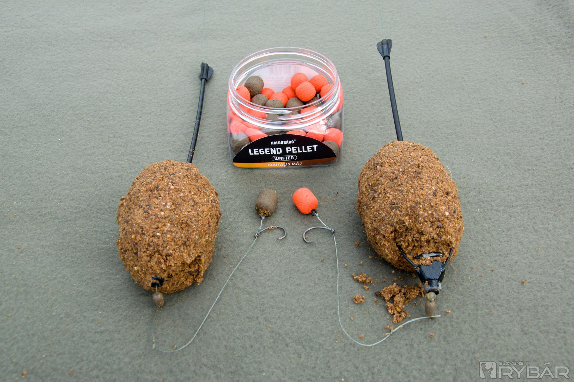 Koncovú montáž som už mal na svojich 430-centimetrových feedrových prútoch pripravenú. Pozostávala z 35-gramového krmítka Dart Pellet Feeder, gumenej zarážky, obratlíka, jemnej šnúrky a z háčika veľkosti 6. Tu si môžete povedať, že to nie je jemná montáž a máte pravdu. Túto montáž som zostavil tak, aby som vedel nahodiť aspoň na 100 metrov alebo aj ďalej, lebo od júna do konca októbra tí rybári, ktorí sem chodia na viac dní, zavážajú svoje koncové montáže a zakrmujú približne na stred jazera, takže väčšie ryby si na to už zvykli a pohybujú sa na tých miestach. Väčší háčik som naviazal preto, že som mal v pláne nastražovať aspoň na začiatok rybačky 16-milimetrovú nástrahu Haldorádó Legend Pellet Wafter Brutálna Pečeň. Je to kriticky vyvážená nástraha a v jednom balení nájdete 12 aj 16-milimetrové nástrahy výraznej oranžovej a nevýraznej hnedej farby. Ja som si zvolil takú taktiku, že pod jeden háčik nastražím výraznú oranžovú peletku a pod druhý háčik nastražím nevýraznú hnedú peletku. Tak sa aj stalo a o pár minút som už mal svoje koncové montáže nahodené približne na 100 metrov a ostávalo mi už iba počkať na prvý záber.