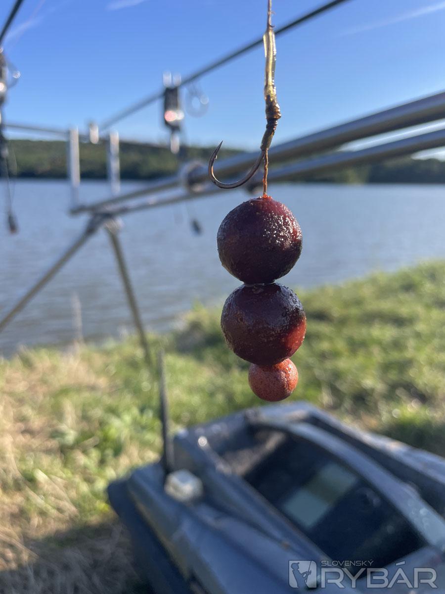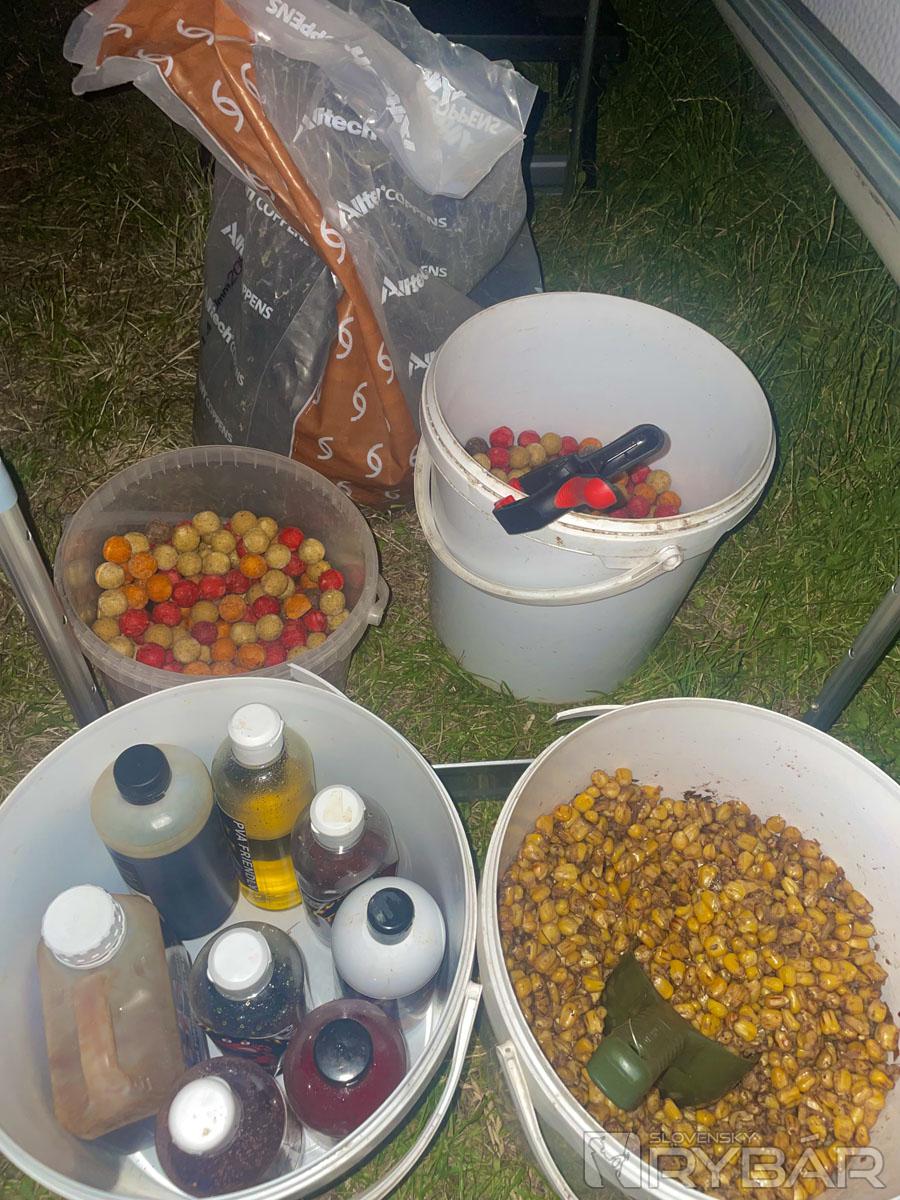Moje kŕmenie je klasika: varená kukurica, mäkká až na otvorenie zrna, s pridaním červenej papriky. Primiešavam repku zaliatu vriacou vodou, k tomu halibut pelety rôznej veľkosti a kŕmne boilies rôznych veľkostí a chutí. Tu sa na chvíľu zastavím – považujem sa skôr za ekonomického rybára. Chodievam chytať na viac dní a viackrát do roka, takže sa snažím udržať kŕmenie na rozumnej finančnej hranici. Mnoho rybárov chytá na boilies za 15 – 20 €/kg a takým aj kŕmi. Je to určite dobré, ale ak frekvencia chodenia na ryby je taká ako moja, ide to dosť do peňazí. Na háčik používam rovnako drahé boilies, ale kŕmim kŕmnym typom, ktorý je aj päťkrát lacnejší. To má dve výhody – úsporu financií a zároveň väčší objem kŕmenia. Na háčiku mám potom ten najchutnejší pokrm v okolí. Predstavte si, že na dne je všetko to množstvo a zmes krmiva – kukurica, pelety, repka a kŕmne boilies – a na háčiku mám 2 týždne zadipovanú, cestom obalenú, zaboostrovanú mňamku. Mojím cieľom je nalákať rybu, aby si čo najskôr vybrala moju nástrahu. To je len moja teória, ale zatiaľ to tak vyzerá, že funguje.