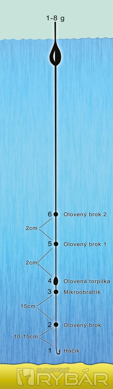 Najmenší olovený brok umiestňujeme 10-15 cm od háčika, nad ním vo vzdialenosti 10-15 cm mikroobratlík (alebo zarážku), nasleduje torpilka a potom v smere k plaváku môžeme ešte dovažovať malými brokmi (s ohľadom na prúd cca po 2 cm), no nie je to vždy nutnosť. Zostavu dopĺňajú malé háčiky z tenkého a kvalitného materiálu, veľkosť č. 12-14.